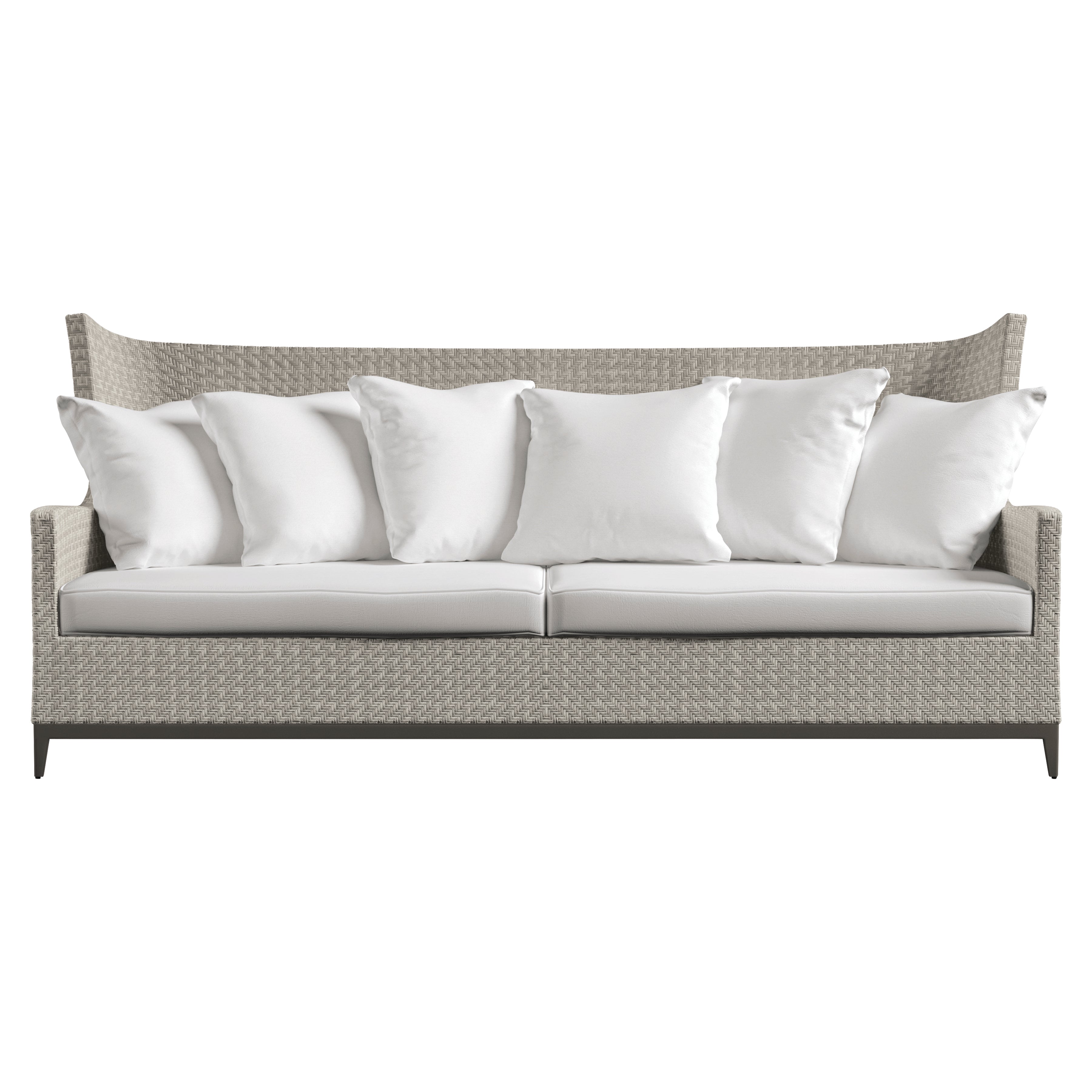 The Bernhardt Exteriors collection of outdoor furniture is characterized by exceptional luxury, stylish design and endless durability. The gracefully curved Captiva wingback sofa offers a tasteful spin on classic design. Expertly crafted from All-Weather Wicker in a herringbone weave, it features six weltless fiber back pillows for extra comfort. The pewter gray powder coated aluminum frame with attached tapered legs adds an additional layer of support and charm.