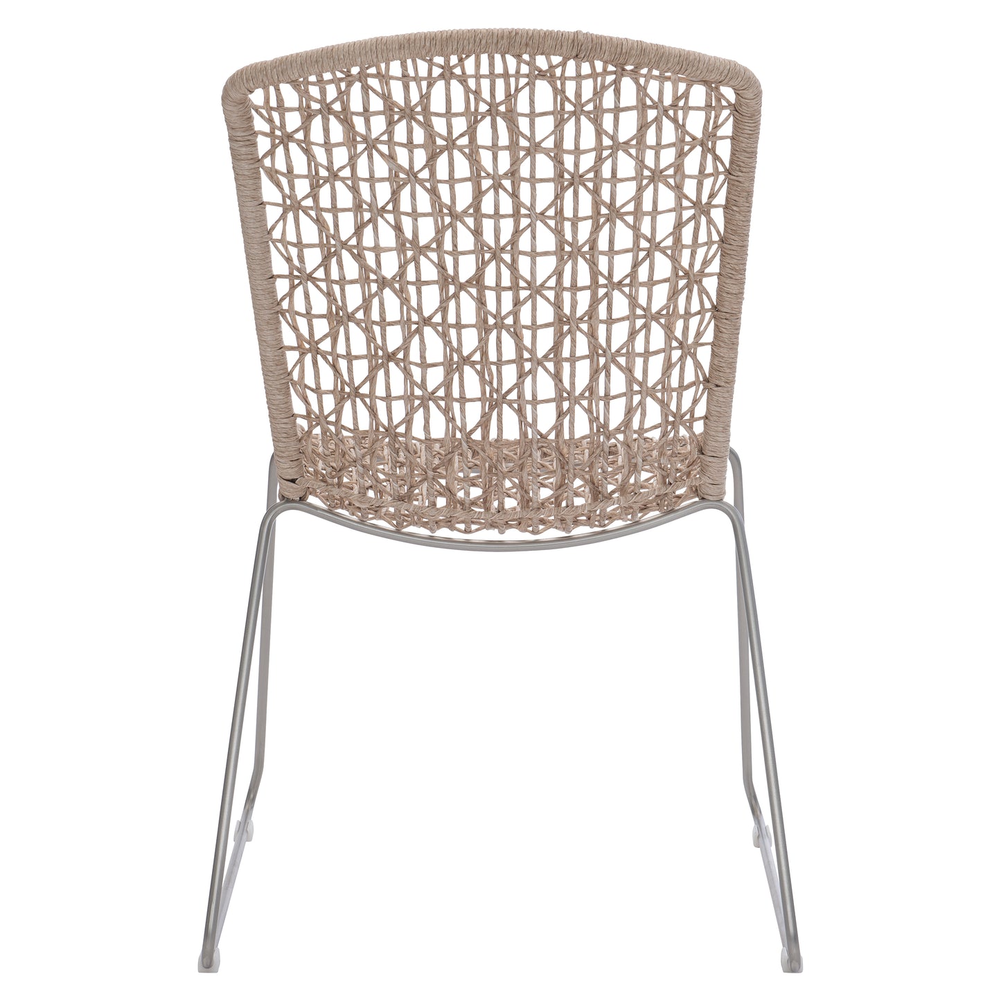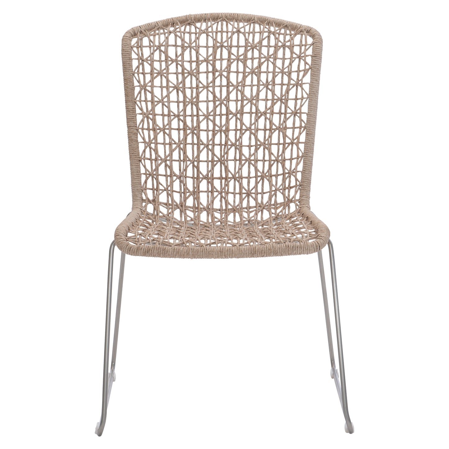 Striking design comes from an open weave crafted of twisted abaca all-weather wicker on the Carmel side chair. But the pattern isn't just about style, it also provides a comfortable back for outdoor lounging. Woven over a stainless steel base, the wicker is made to withstand weather conditions outdoors but is beautiful enough for indoor rooms.