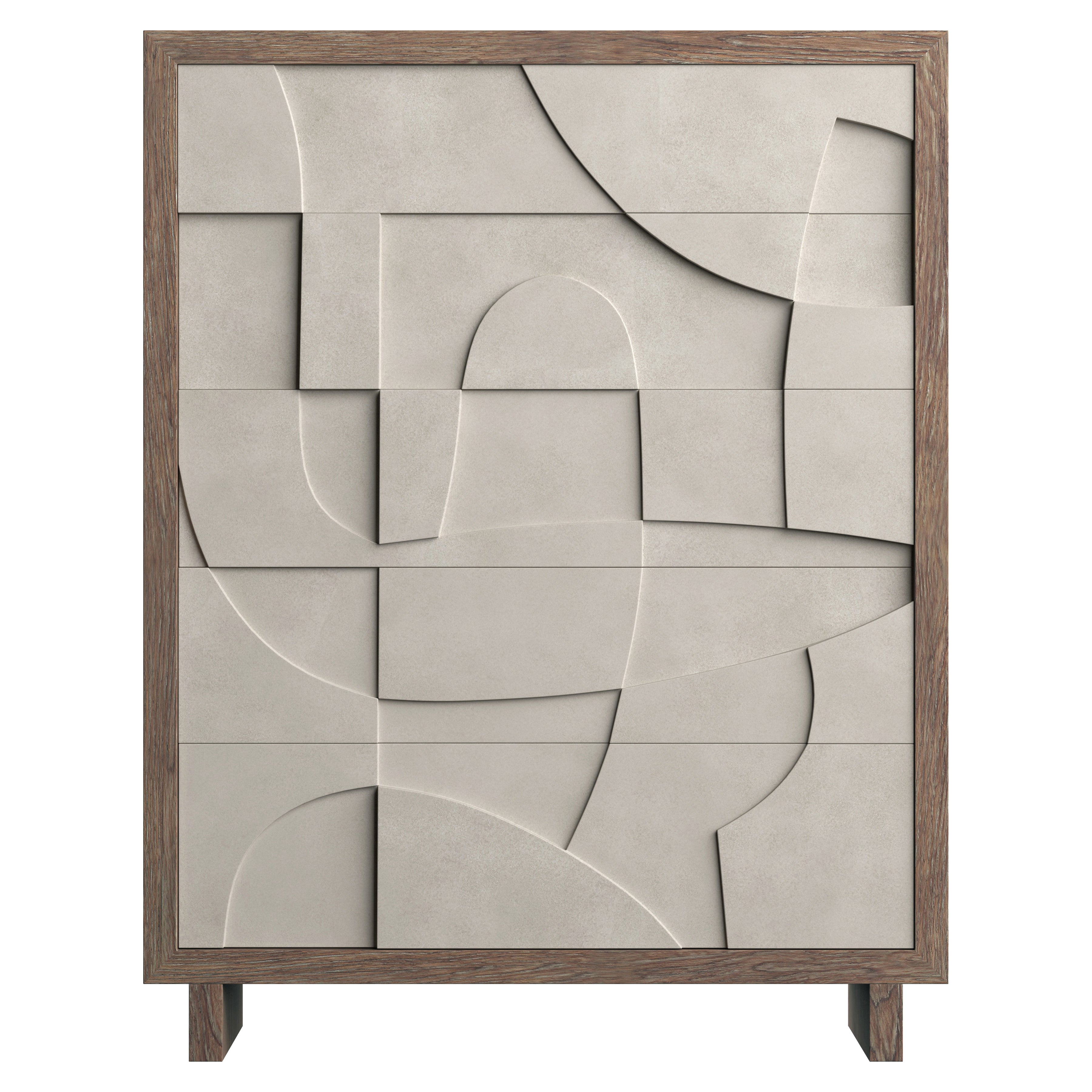 Texture and dimension carve a signature look onto the Casa Paros tall drawer chest. Five faux concrete push-to-open drawers are showcased in Bedrock finish. The top and leg panels feature the warm Playa finish that provides the perfect contrast for a refined and rustic design.