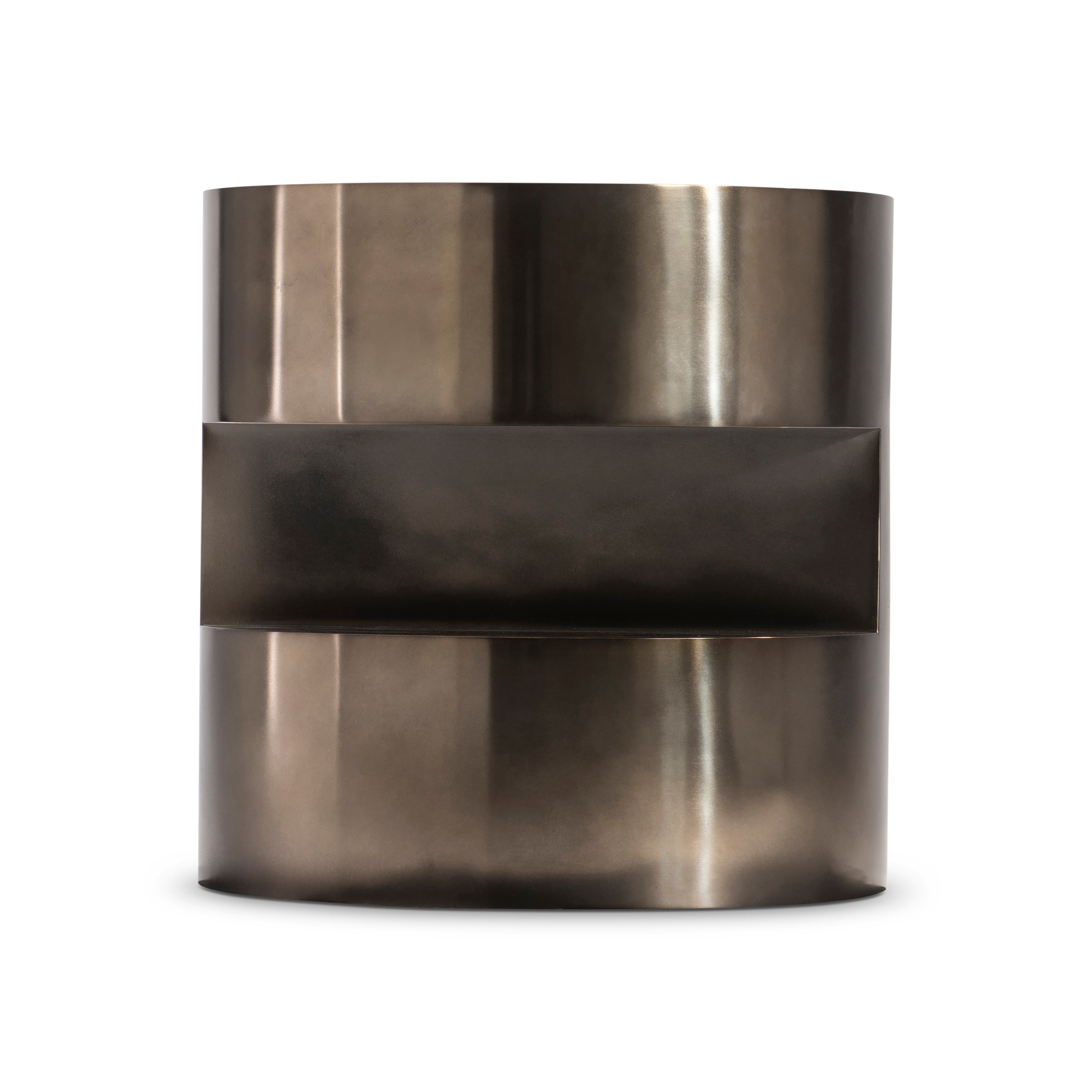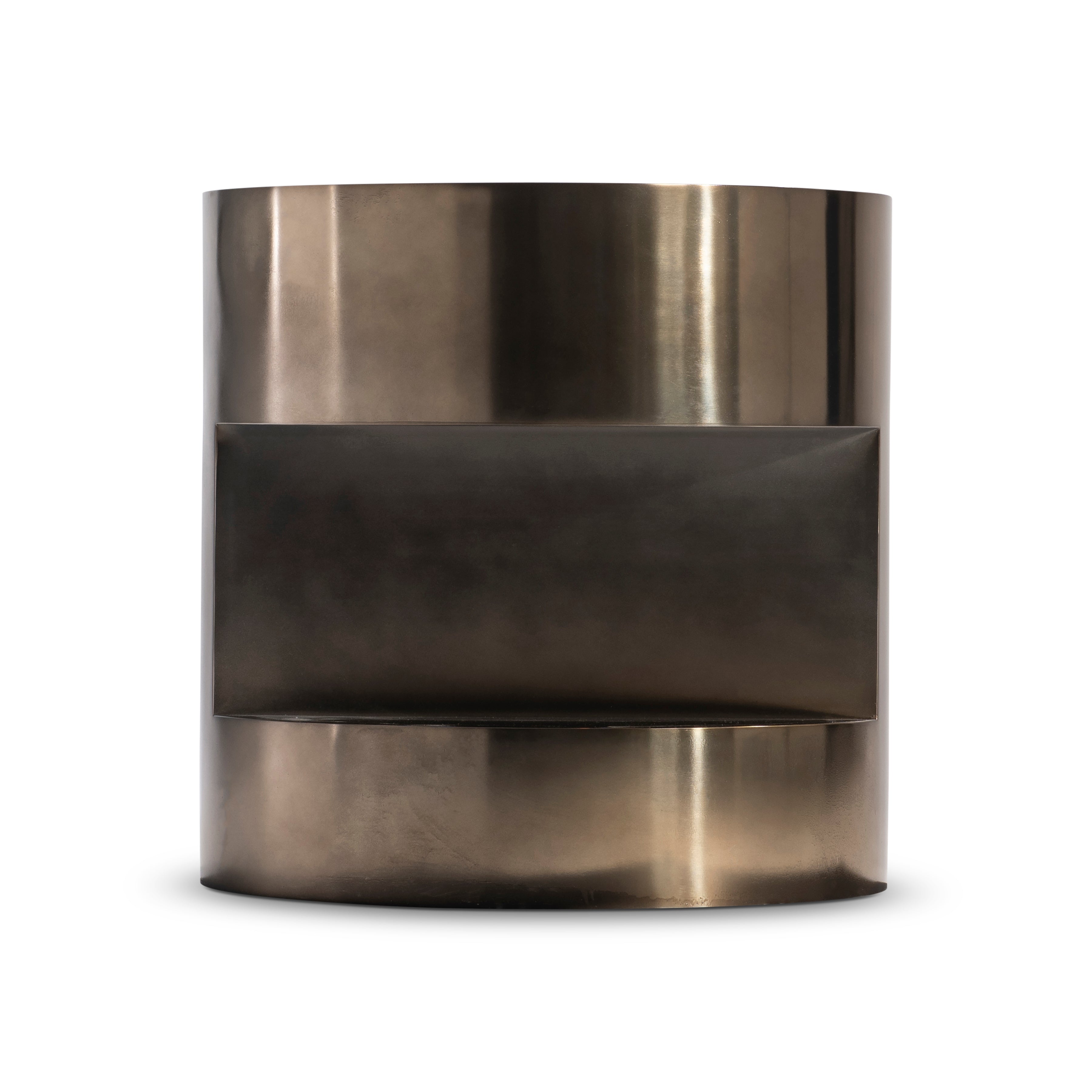 The Cassie side table offers a checkmate in the style stakes, showcasing a sculptural design inspired by a modern chess piece. A Dark Bronze finish adds depth and visual interest while cutout sides create unique shelves.