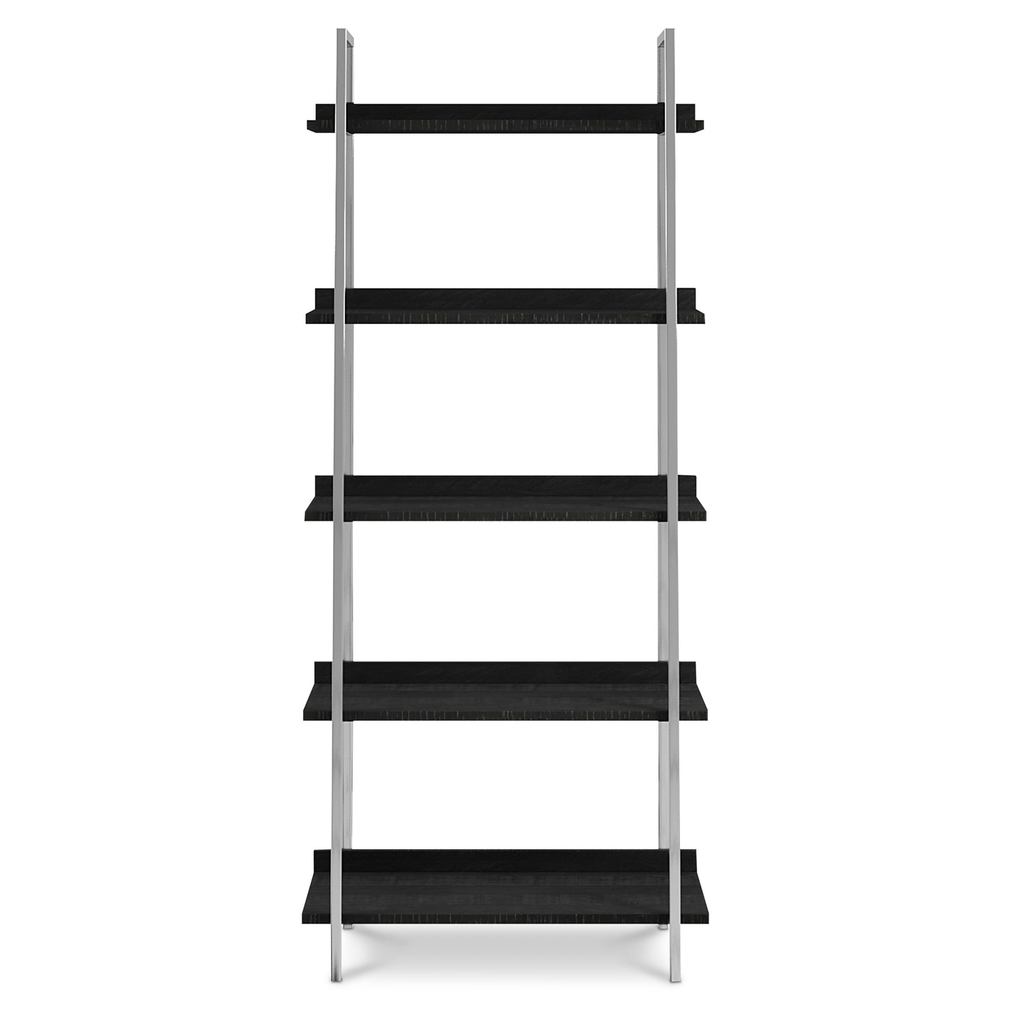Open etagere with five wood shelves in Cinder finish. Polished Stainless Steel frame in Gray Mist finish. Adjustable glides. Anti-tip kit and instruction sheet.