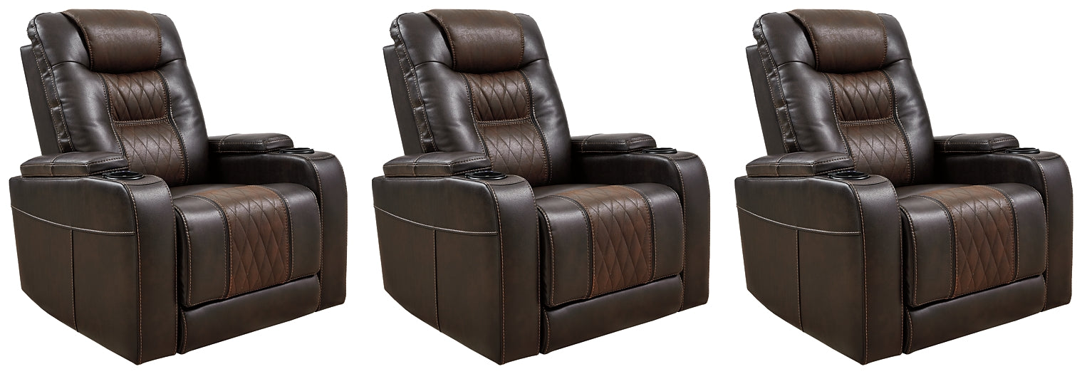Family movie nights will be forever changed with this 3-piece power recliner set. The adjustable Easy View™ headrest allows a primo view of the TV no matter how far back you recline and the extended ottoman provides extra room to really stretch out. Ultra-cool lattice stitching elevates the look and ambient LED lighting completes the theater-style experience. So relax, kick off your shoes and enjoy the show.