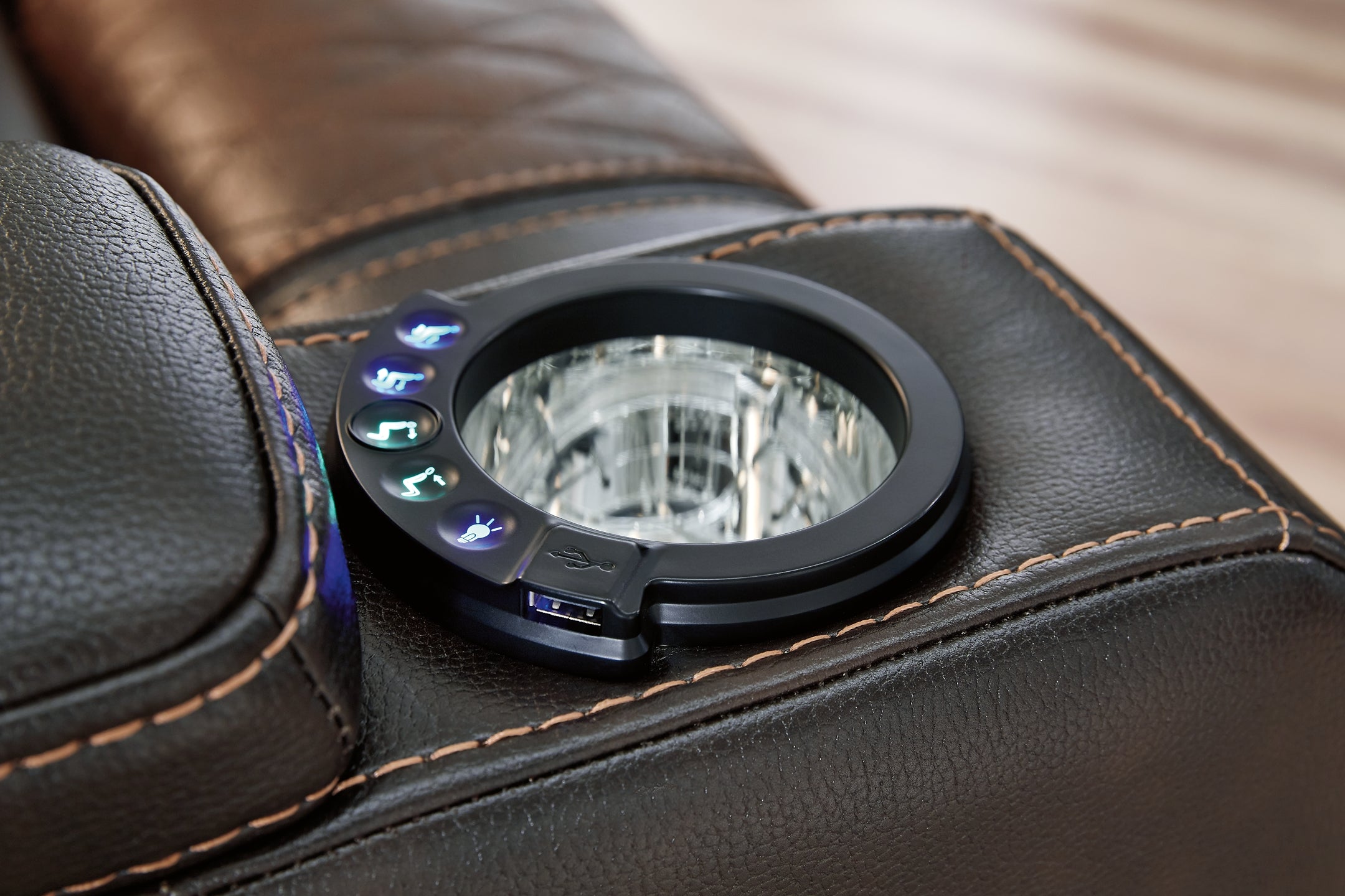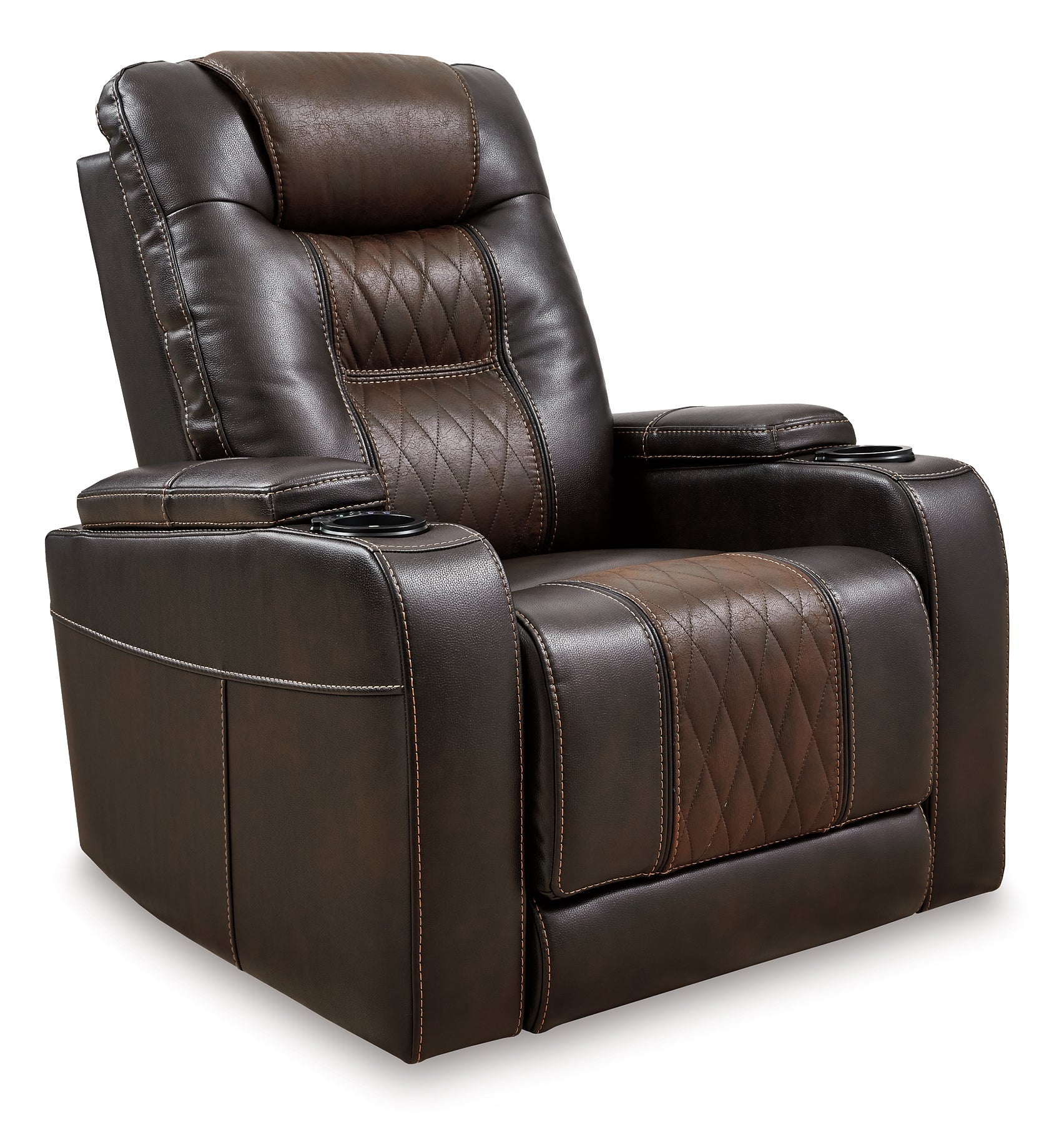 Movie nights will be forever changed with this power recliner. The adjustable Easy View™ headrest allows a primo view of the TV no matter how far back you recline and the extended ottoman provides extra room to really stretch out. Ultra-cool lattice stitching elevates the look and ambient LED lighting completes the theater-style experience. So relax, kick off your shoes and enjoy the show.