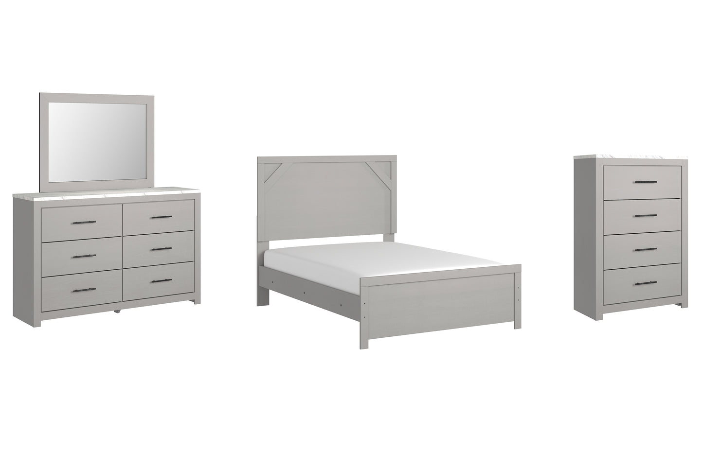 Cool, clean and casually modern. This bedroom set’s wispy dove gray finish sets the tone for your calming sanctuary. Framed elements and cross-brace accents add dimension and authenticity to the bed’s simply stunning profile. The storage pieces' large linear pulls and smooth-gliding drawers neatly accommodate your wardrobe and bedside storage needs.
