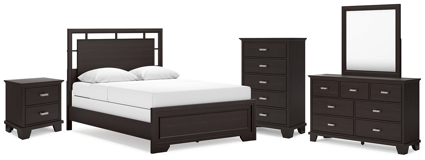 If you like the idea of a richly versatile transitional look that feels fresh and contemporary—with a timeless sensibility—then feast your eyes on this queen panel bed. The modern headboard's floating panel design blends with the classic-inspired picture frame footboard to create a stunning look that's neither too stuffy nor too trendy. Such a refined way to wake up your bedroom style. Dresser, mirror, chest and nightstand included.