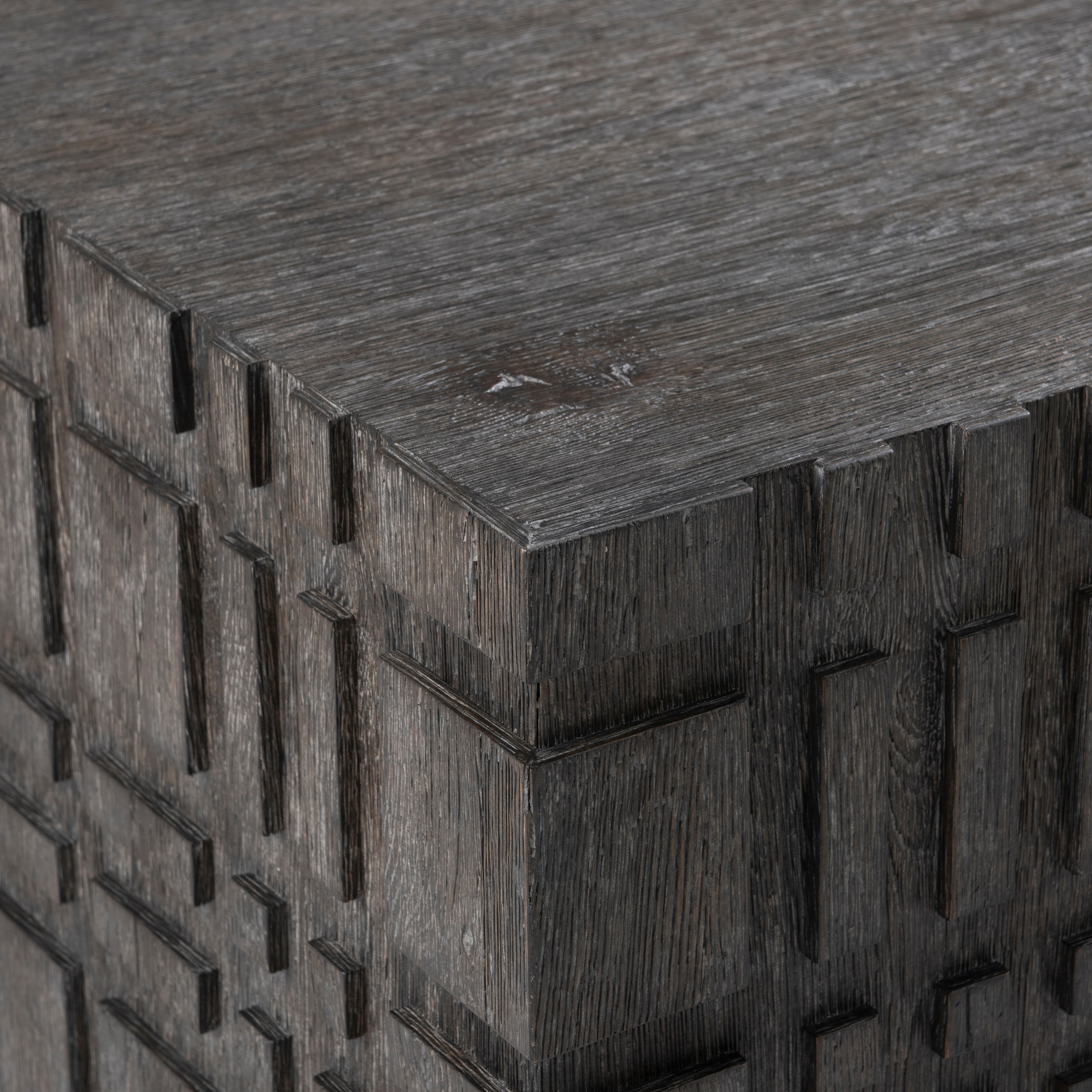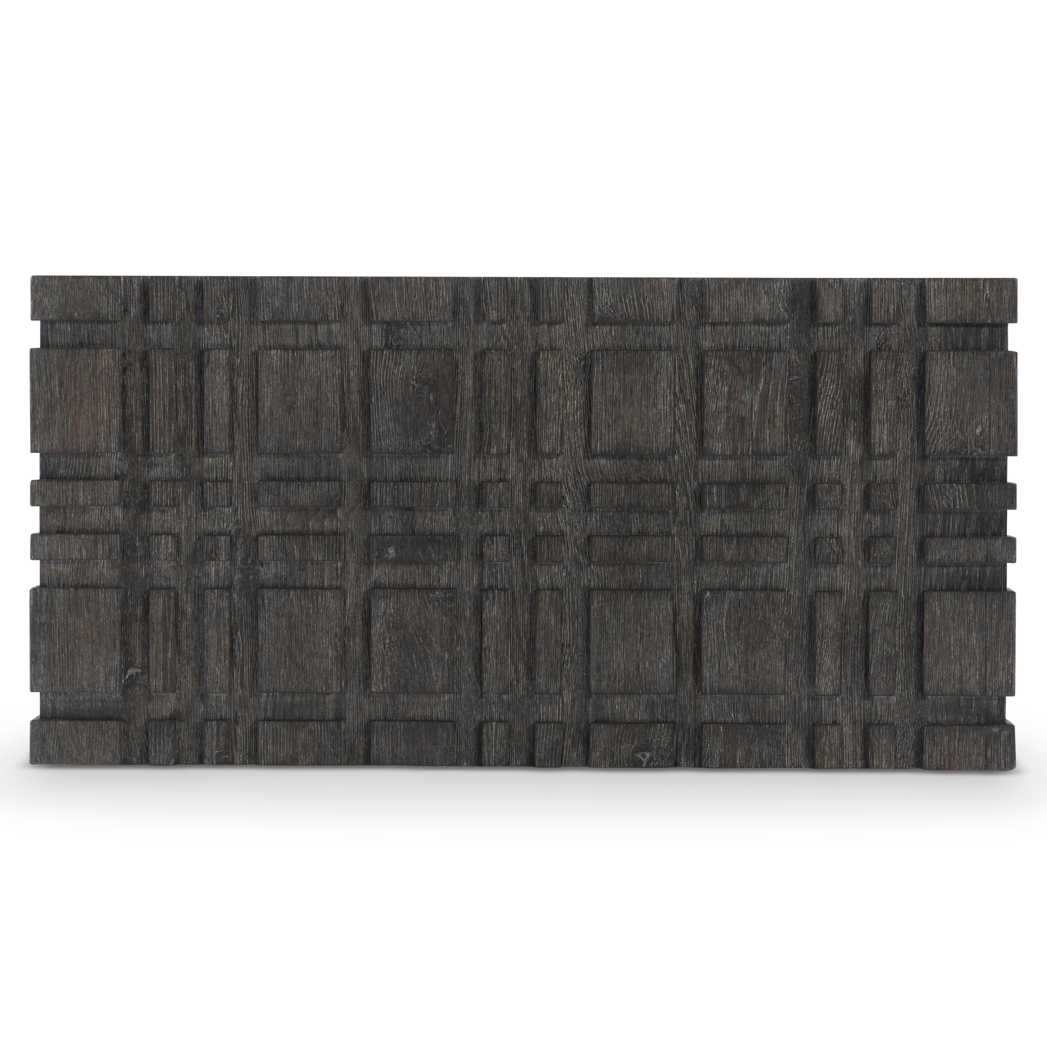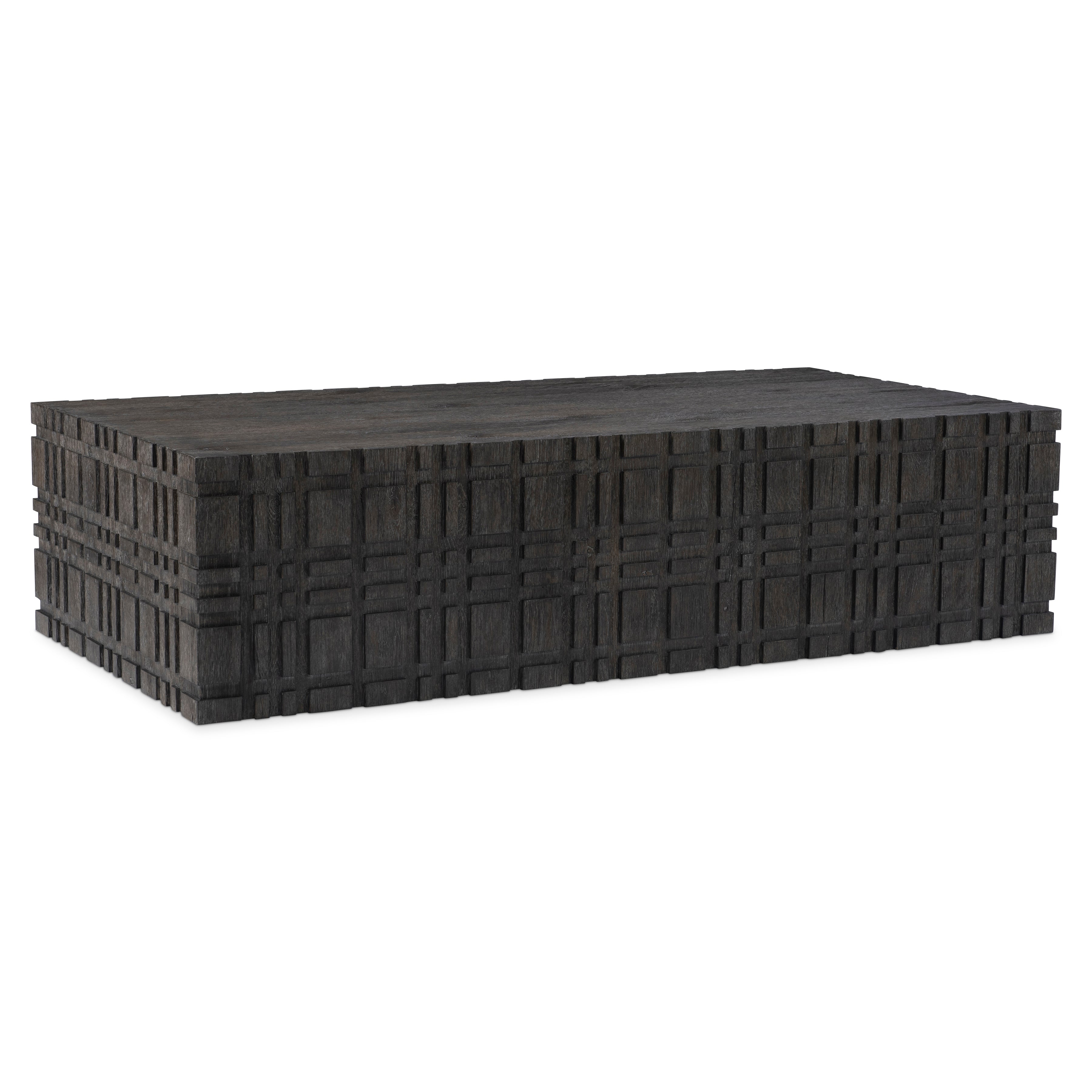 A raised geometric pattern wraps the Cowley cocktail table in a unique modern style. The table has a bold size and a smooth top, all finished in a moody Tadon finish. The table can be easily moved into place thanks to hidden casters.