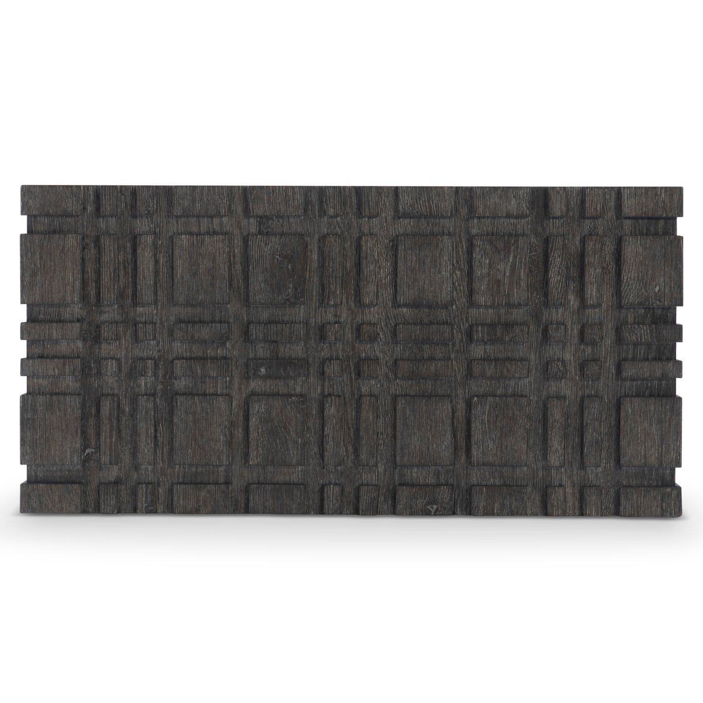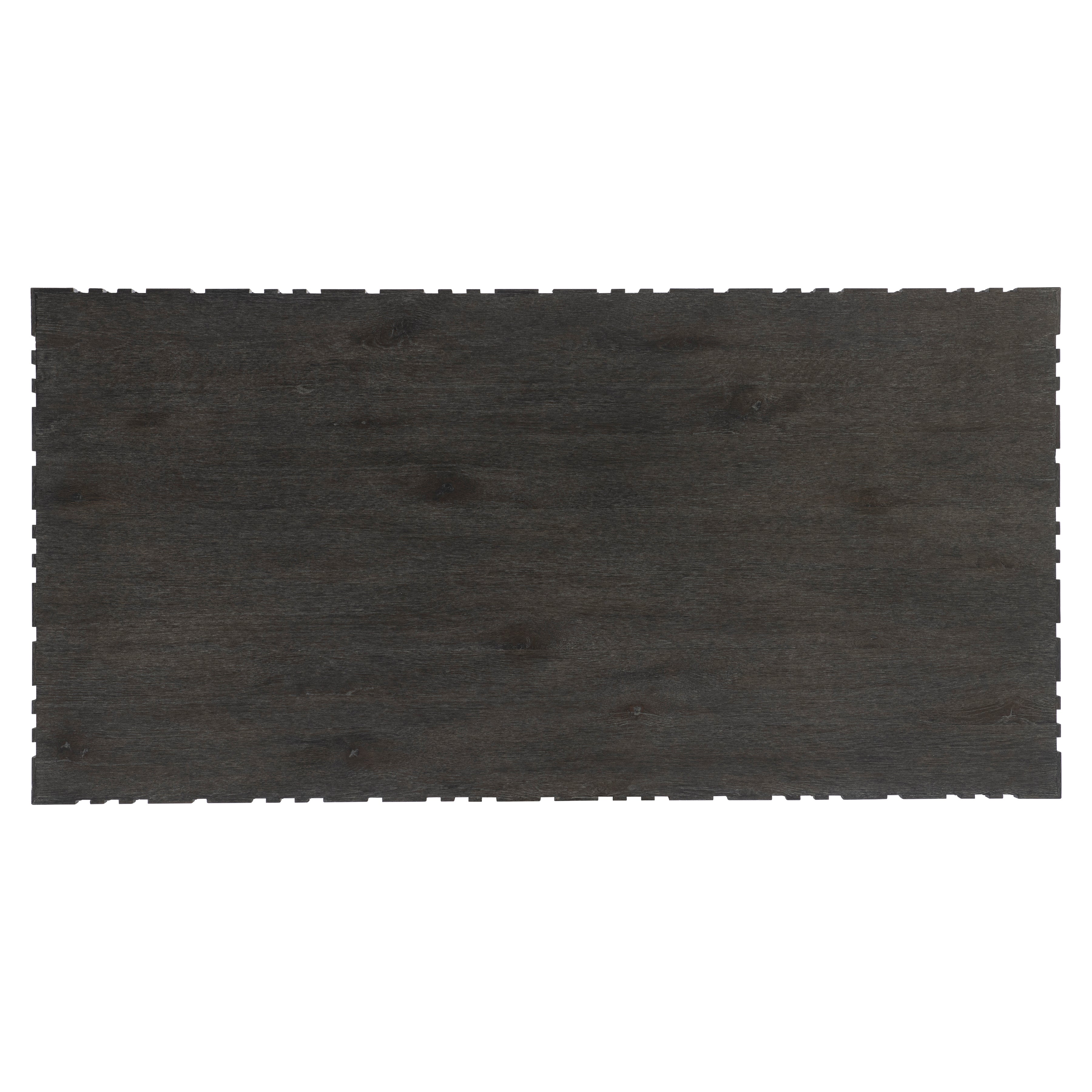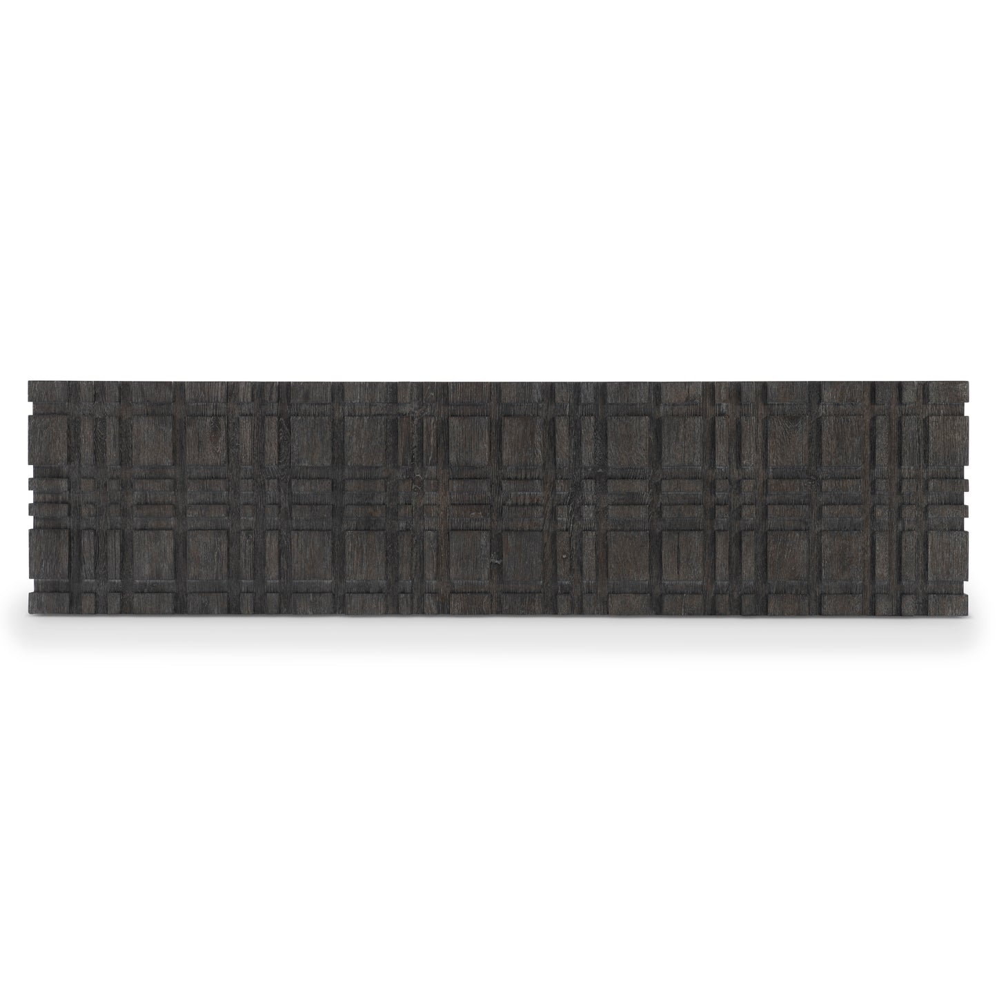 A raised geometric pattern wraps the Cowley cocktail table in a unique modern style. The table has a bold size and a smooth top, all finished in a moody Tadon finish. The table can be easily moved into place thanks to hidden casters.