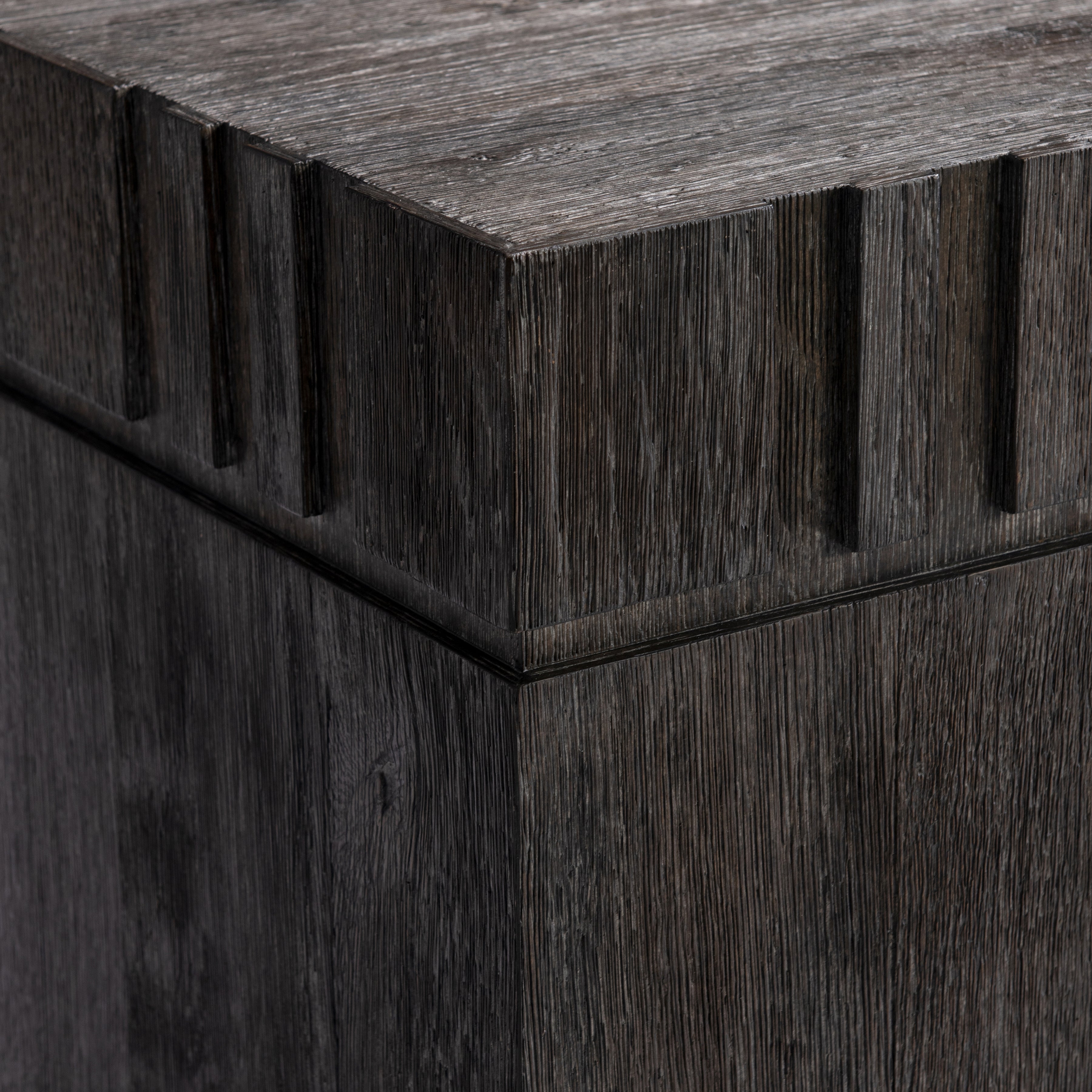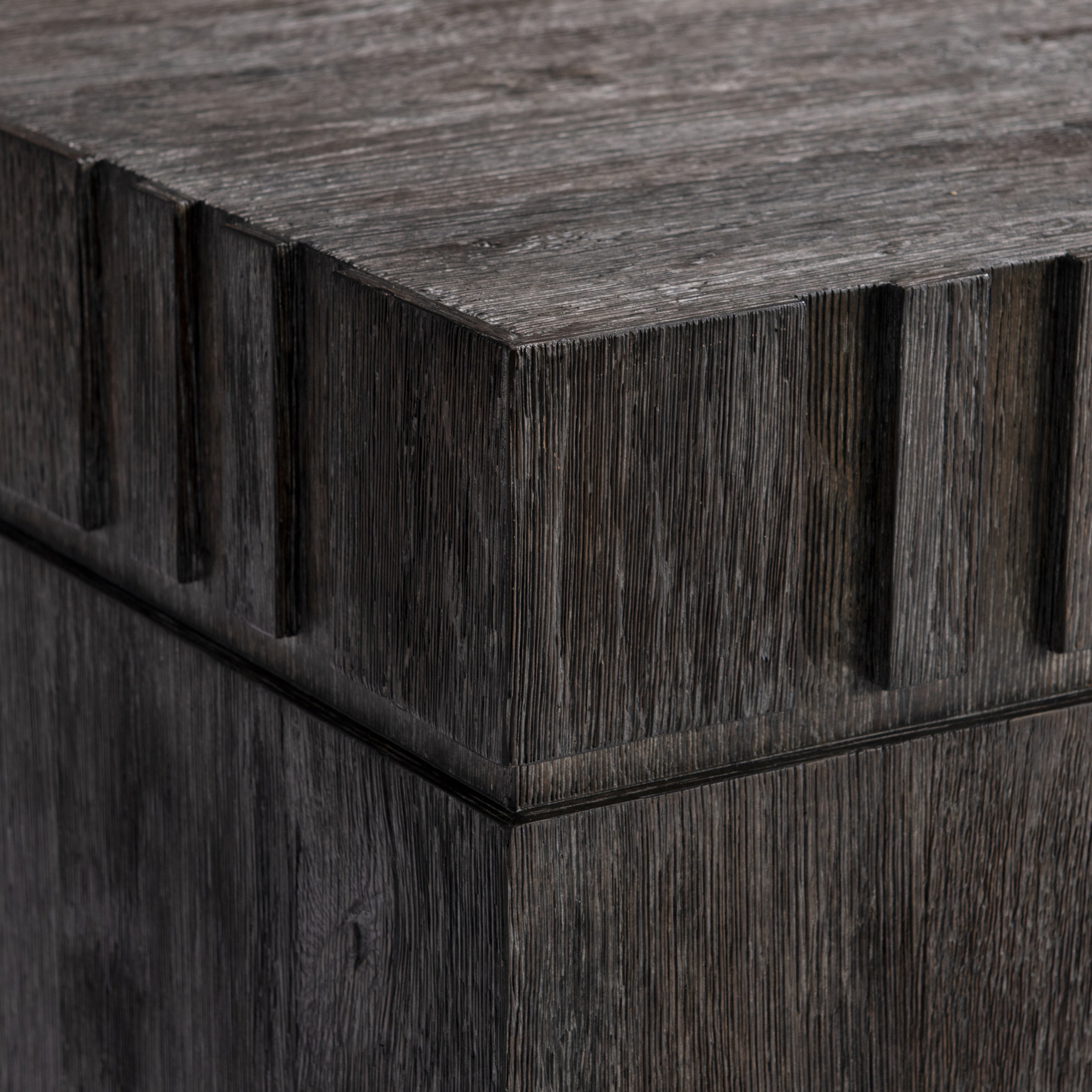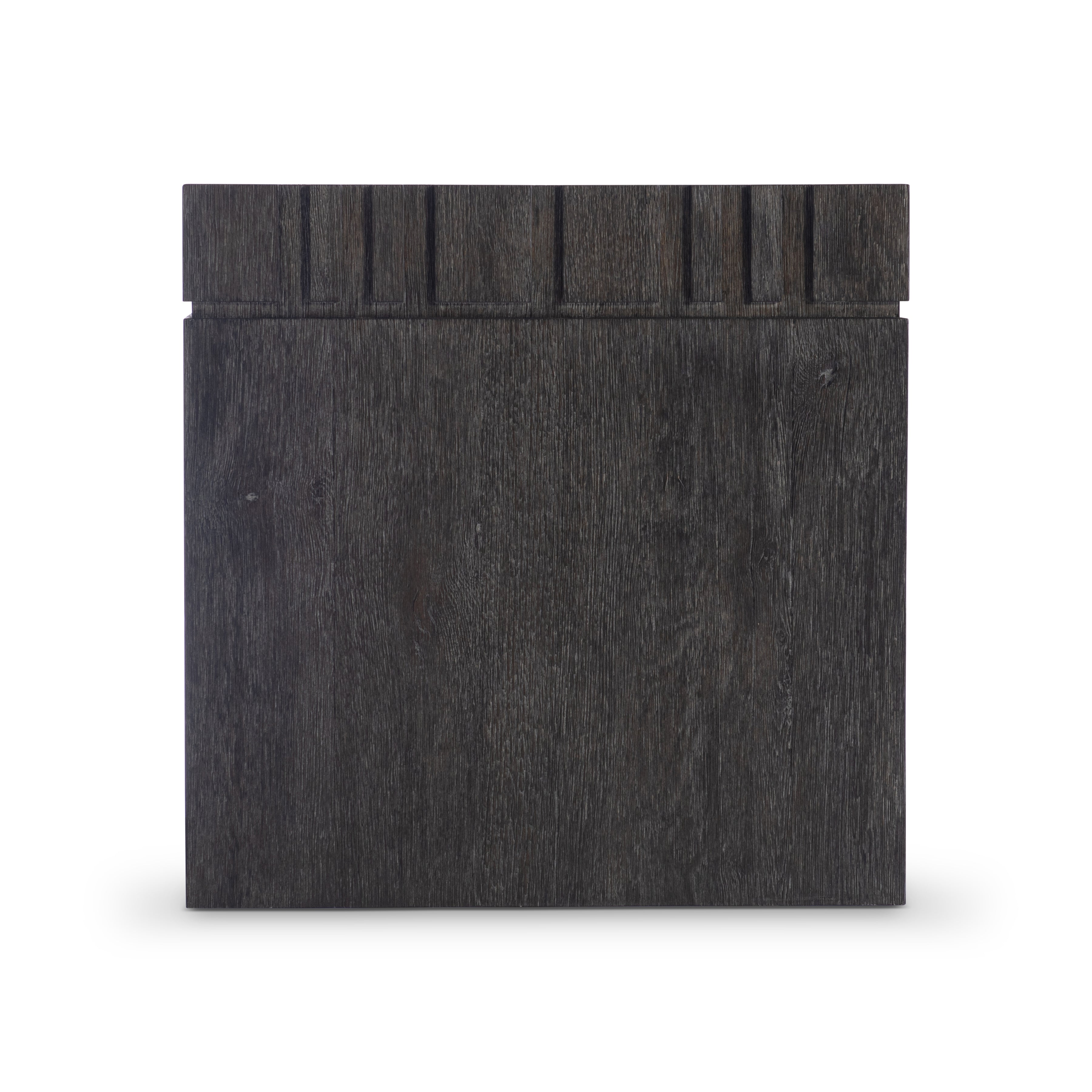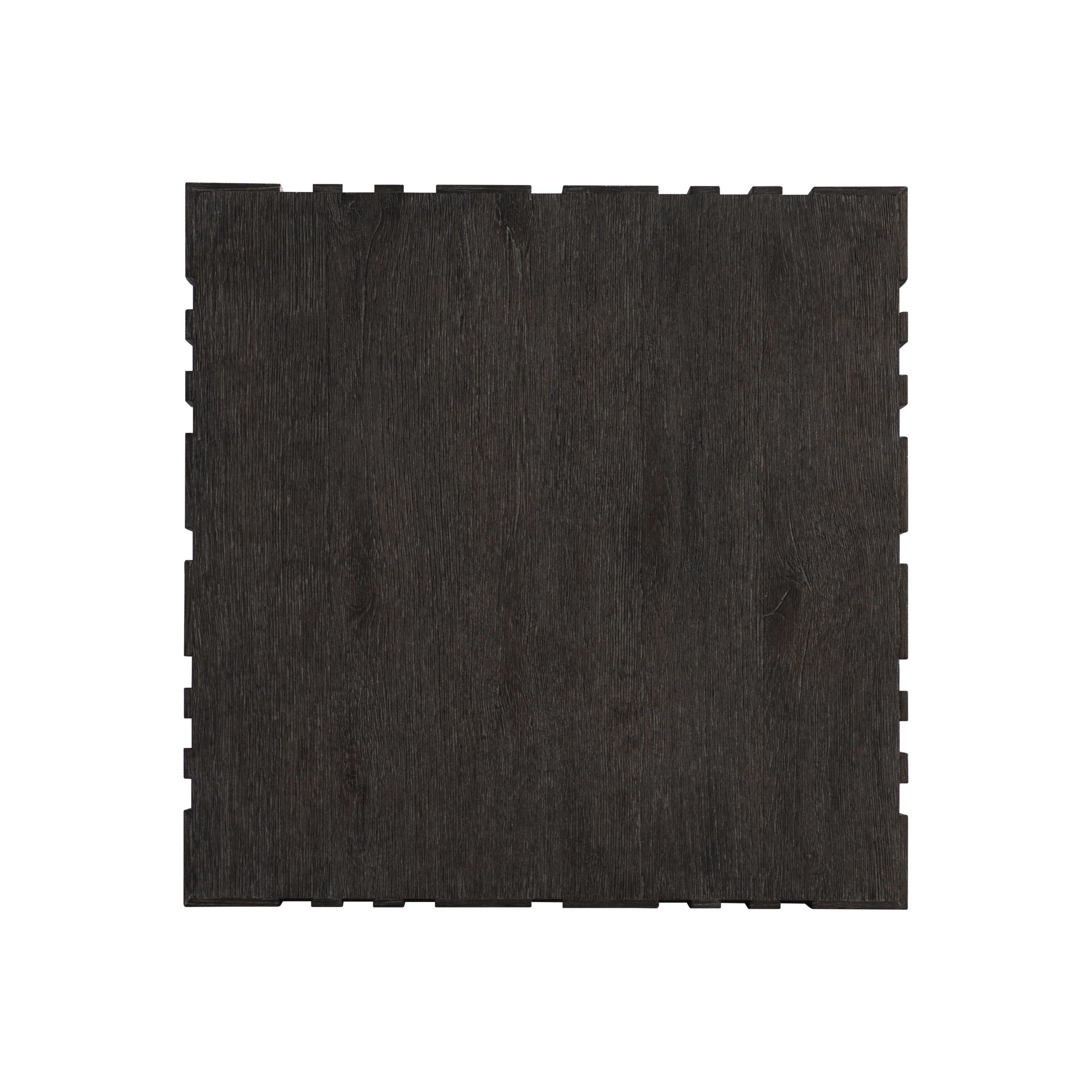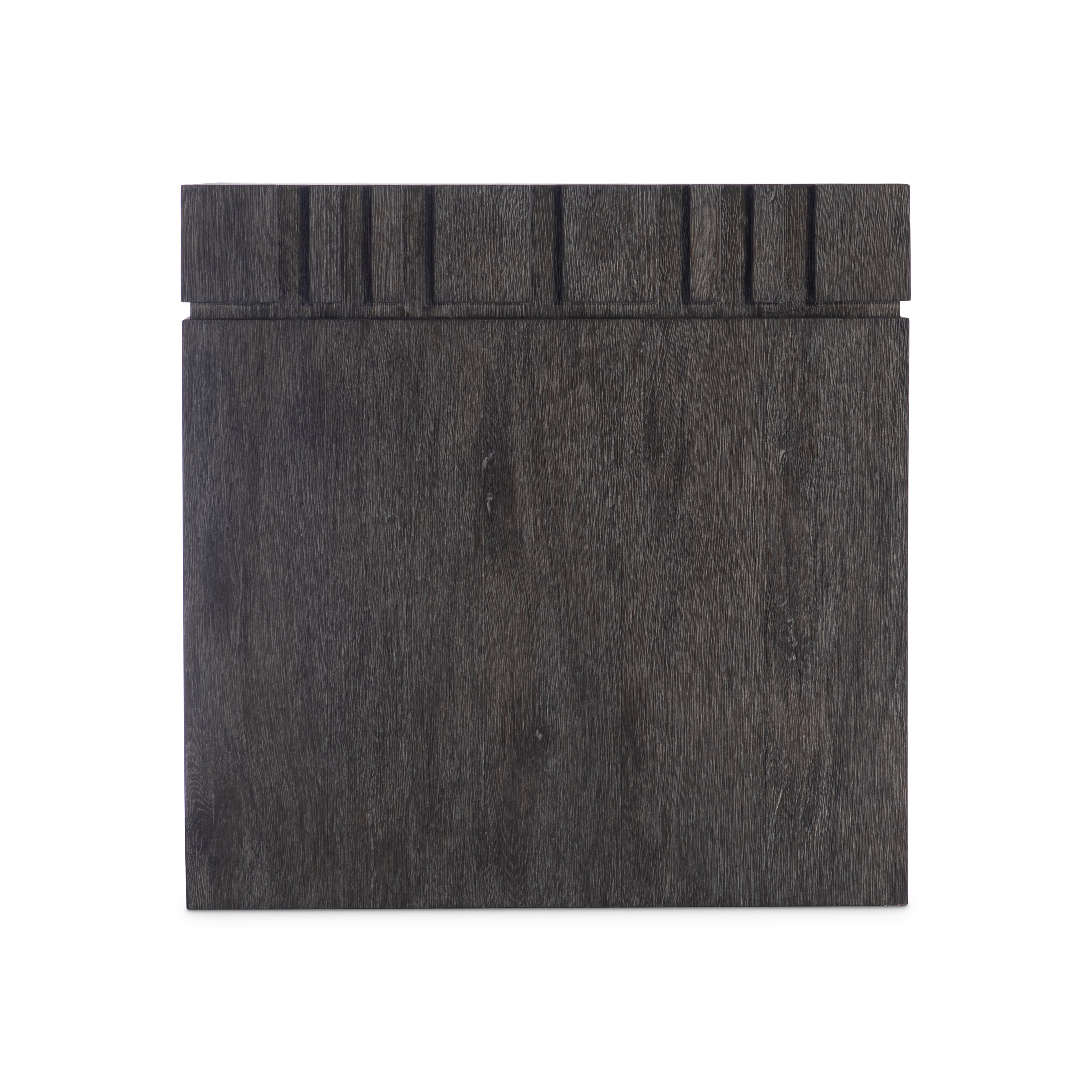 A raised geometric pattern wraps the top of the Cowley side table, giving it a unique modern style. The simple square pillar design showcases the natural wood grain in a moody Tadon finish.