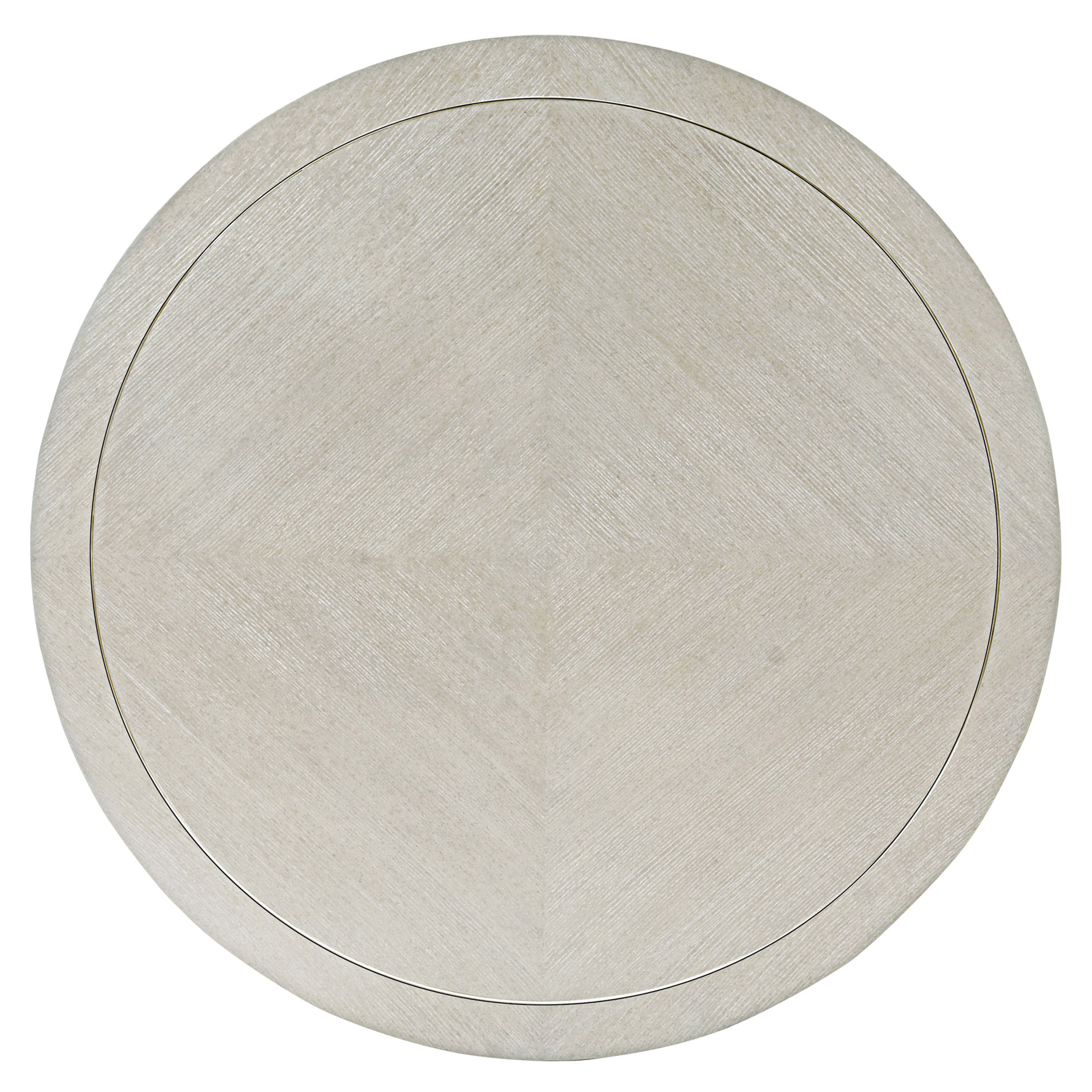 The Criteria round dining table adds elegance to any dining space. Its ash wood top finished in Heather Grey complements the sophisticated cast pedestal with embossed leather pattern for a chic result. The wood top is also embellished with a stainless steel inlay, creating an inner border.