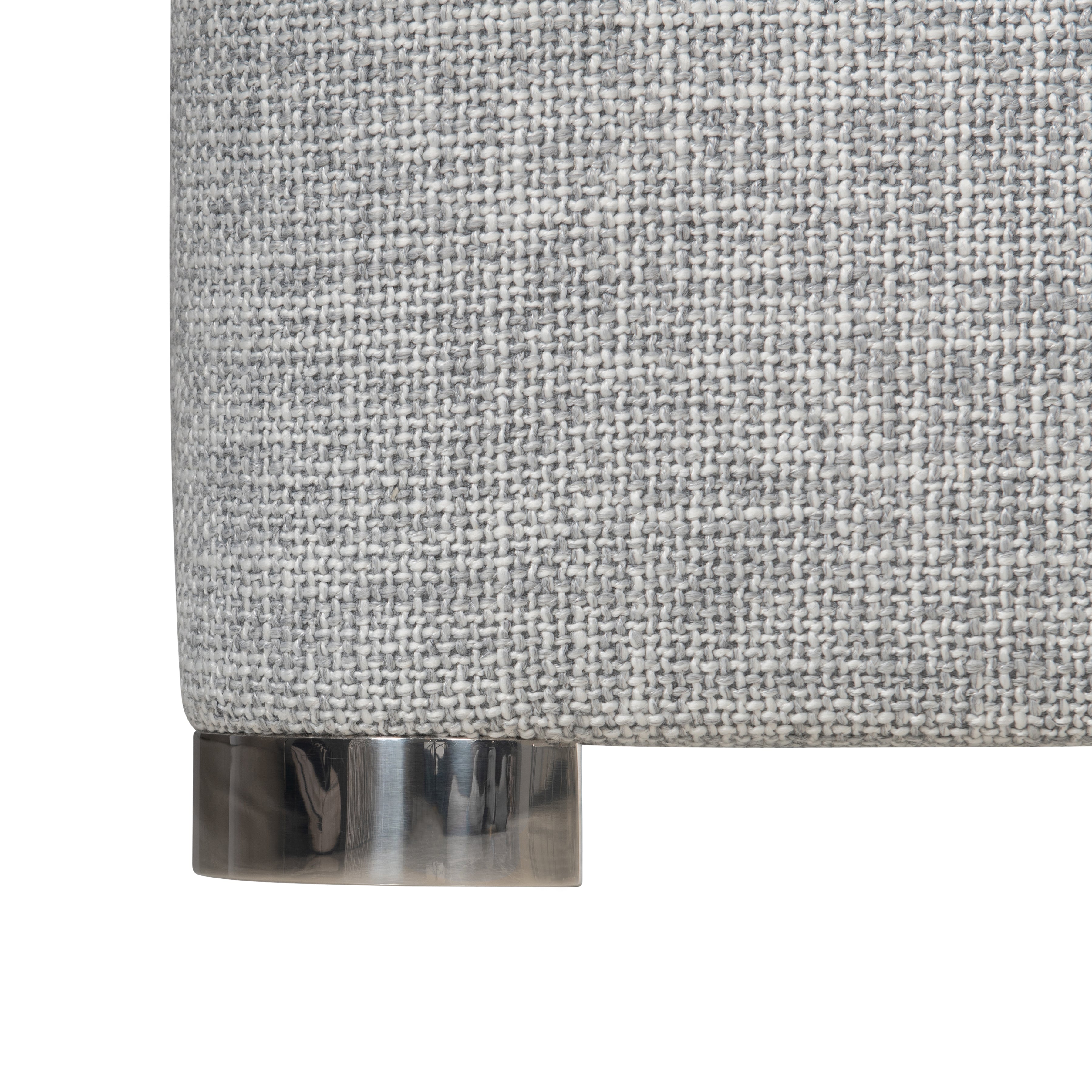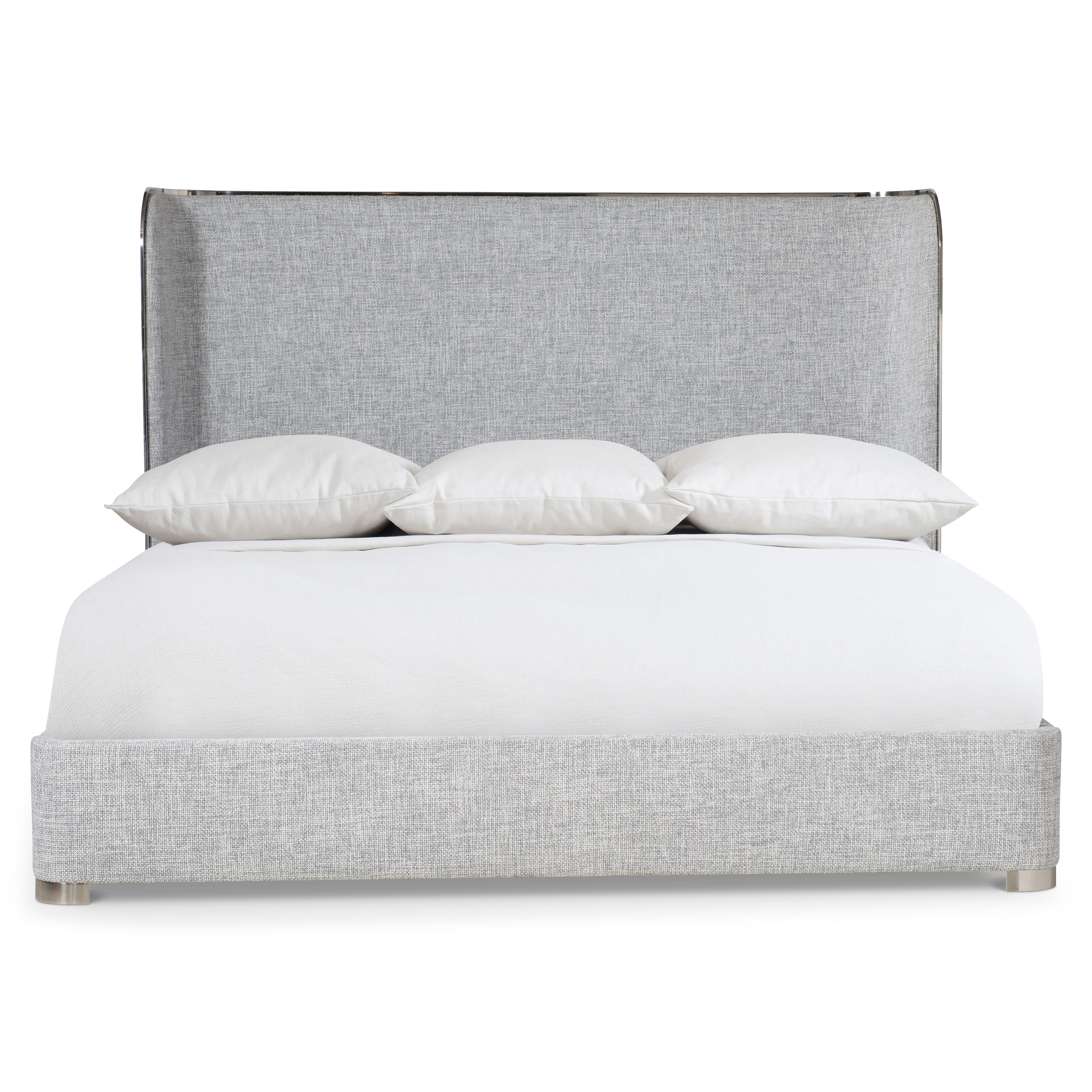 A polished stainless steel frame wraps around the shelter-style headboard of the Croix panel bed for an incredibly chic design. The metal shell is balanced by a soft and comfortable upholstered interior panel. Low side rails and a footboard are also upholstered and supported by curved stainless steel feet.