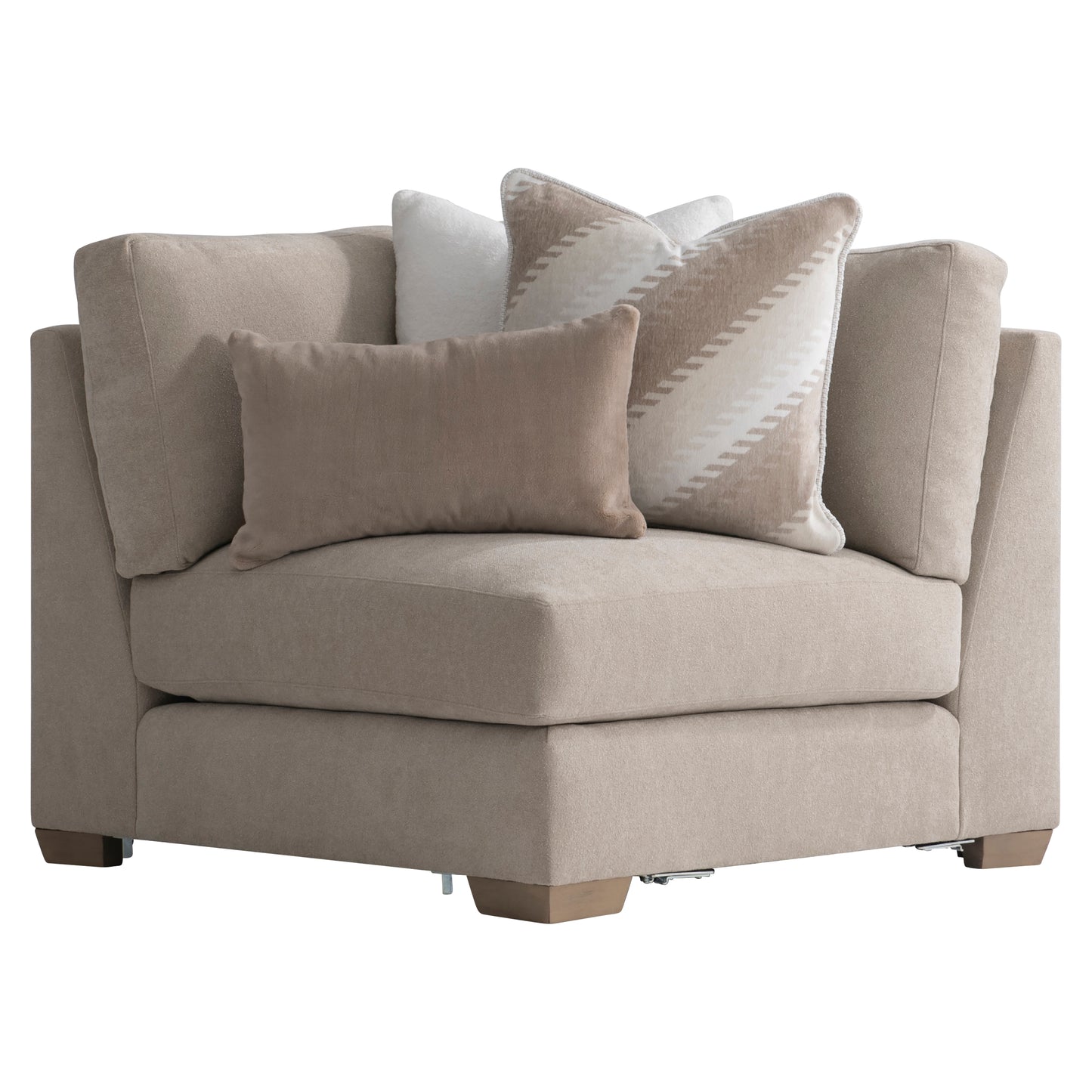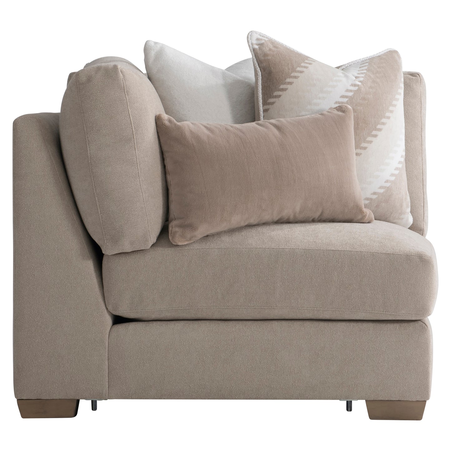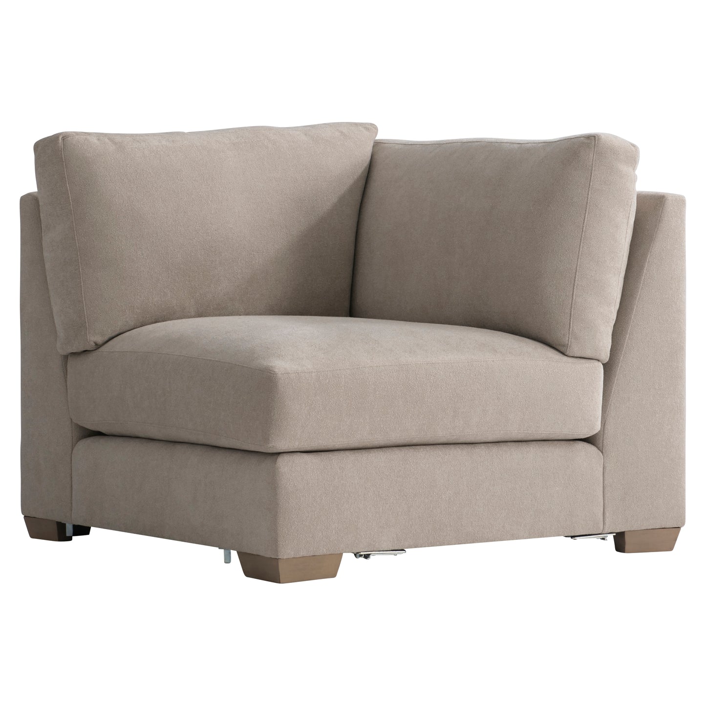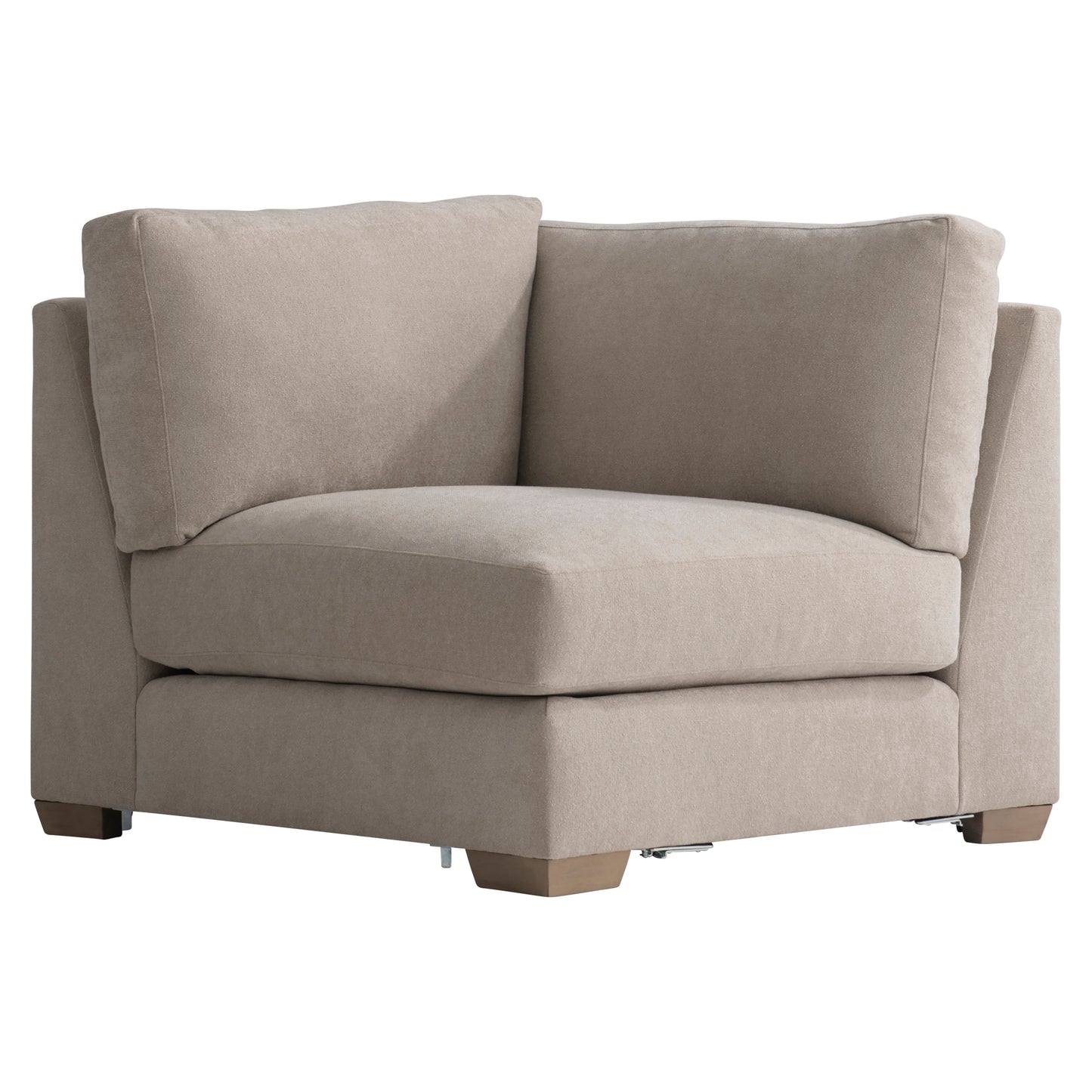 Dressed in chic fabric, the Dawkins corner chair offers casual comfort with a high-end look. The timeless modern design features tapered block feet in Wheat finish. A plush cushion, fiber back pillows and complementary throw pillows offer a sophisticated and comfortable style. This chair may be used alone or as part of a Dawkins sectional.