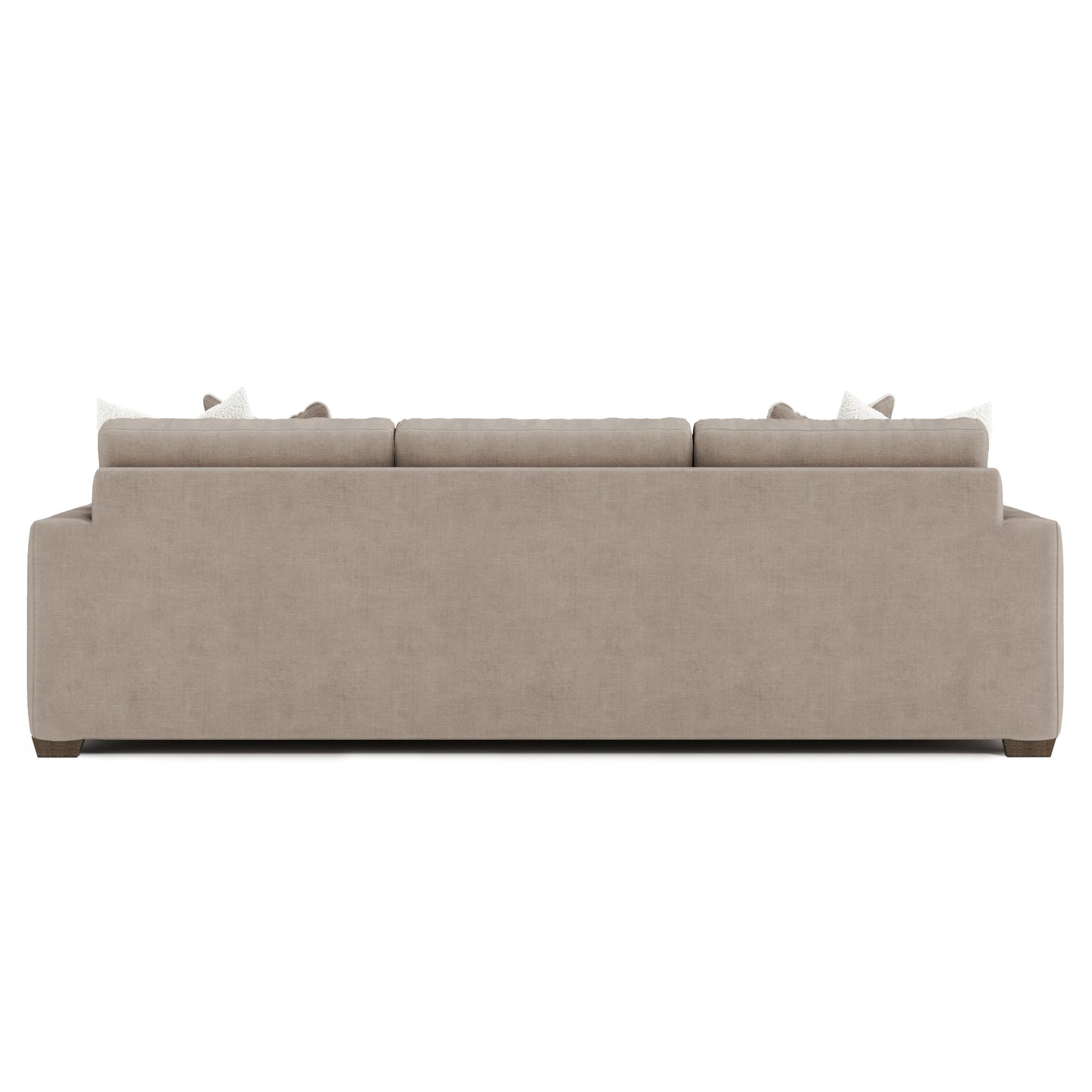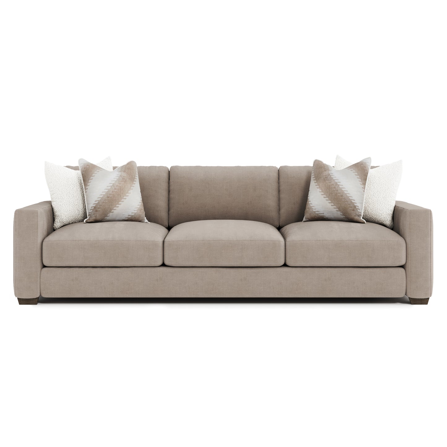 The Dawkins sofa offers casual comfort with a high-end look. The timeless modern design features wide track arms and tapered block feet, available in a variety of wood finishes. Plush cushions and fiber back pillows make this sophisticated sofa the perfect place to lounge in style.