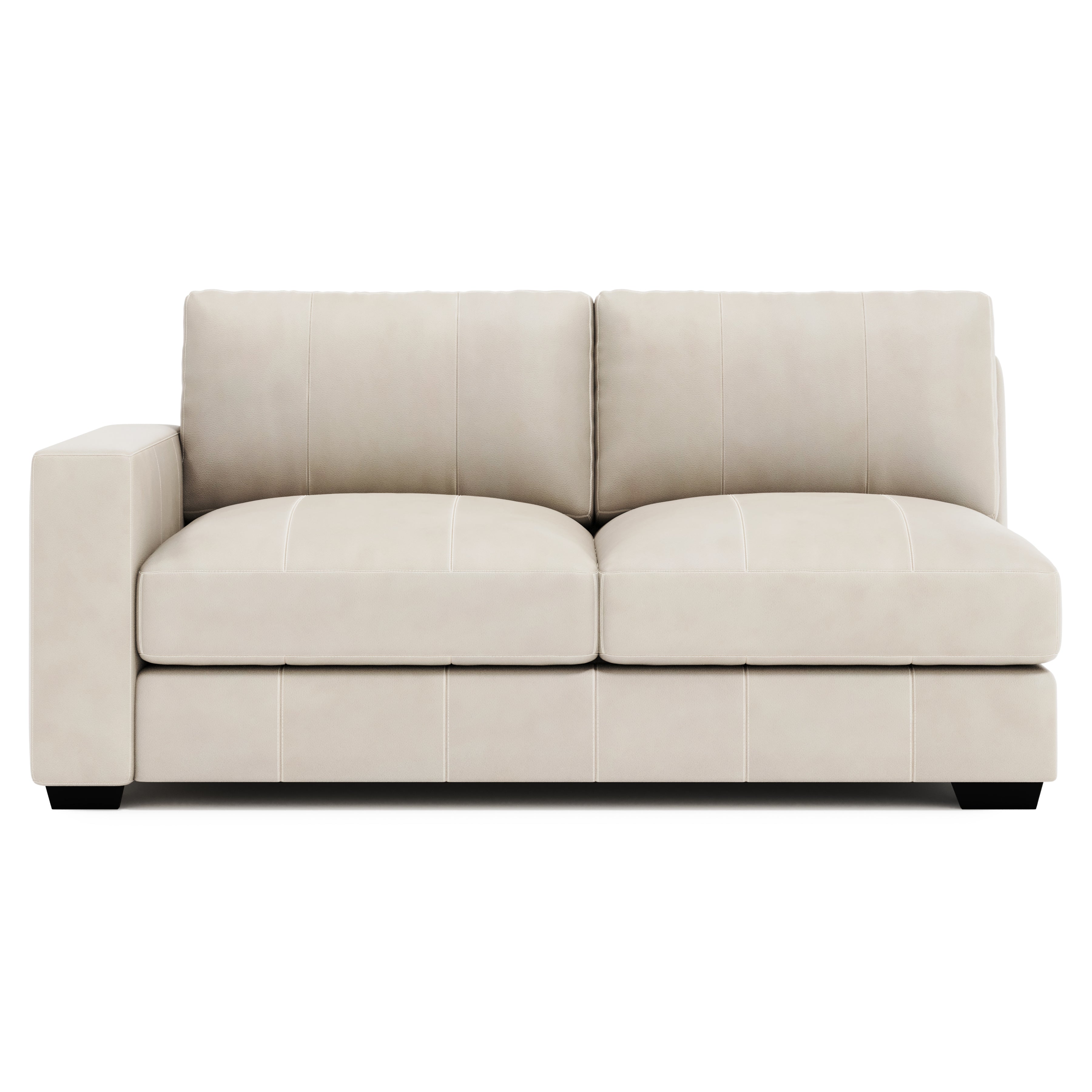 Dressed in luxurious top-grain leather, the Dawkins left arm loveseat offers casual comfort with a high-end look. The timeless modern design features a wide track arm and tapered block feet, available in a variety of wood finishes. Plush cushions and fiber back pillows make this sophisticated loveseat the perfect place to lounge in style.