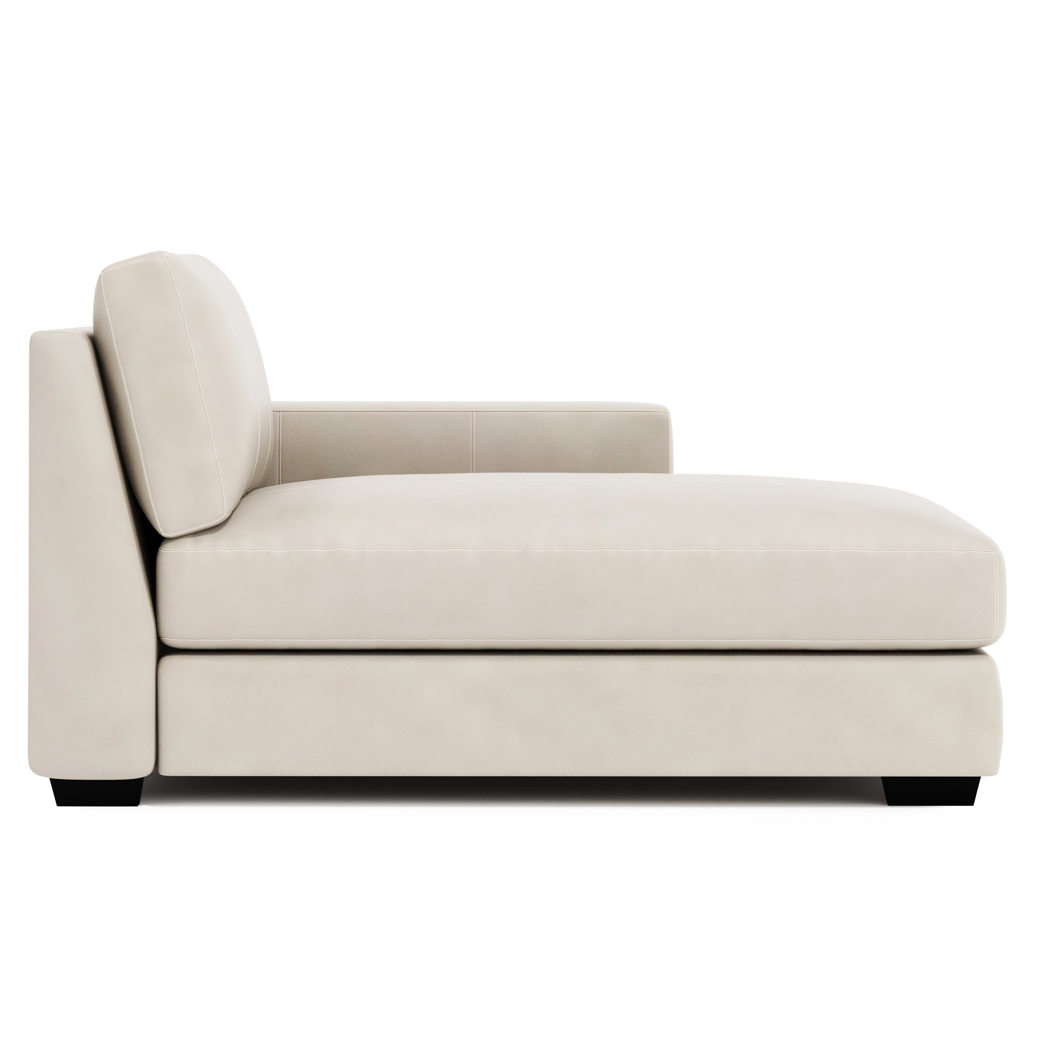 Dressed in luxurious top-grain leather, the Dawkins right arm chaise offers casual comfort with a high-end look. The timeless modern design features a wide track arm and tapered block feet, available in a variety of wood finishes. A plush cushion and fiber back pillow make this sophisticated chaise the perfect place to lounge in style.