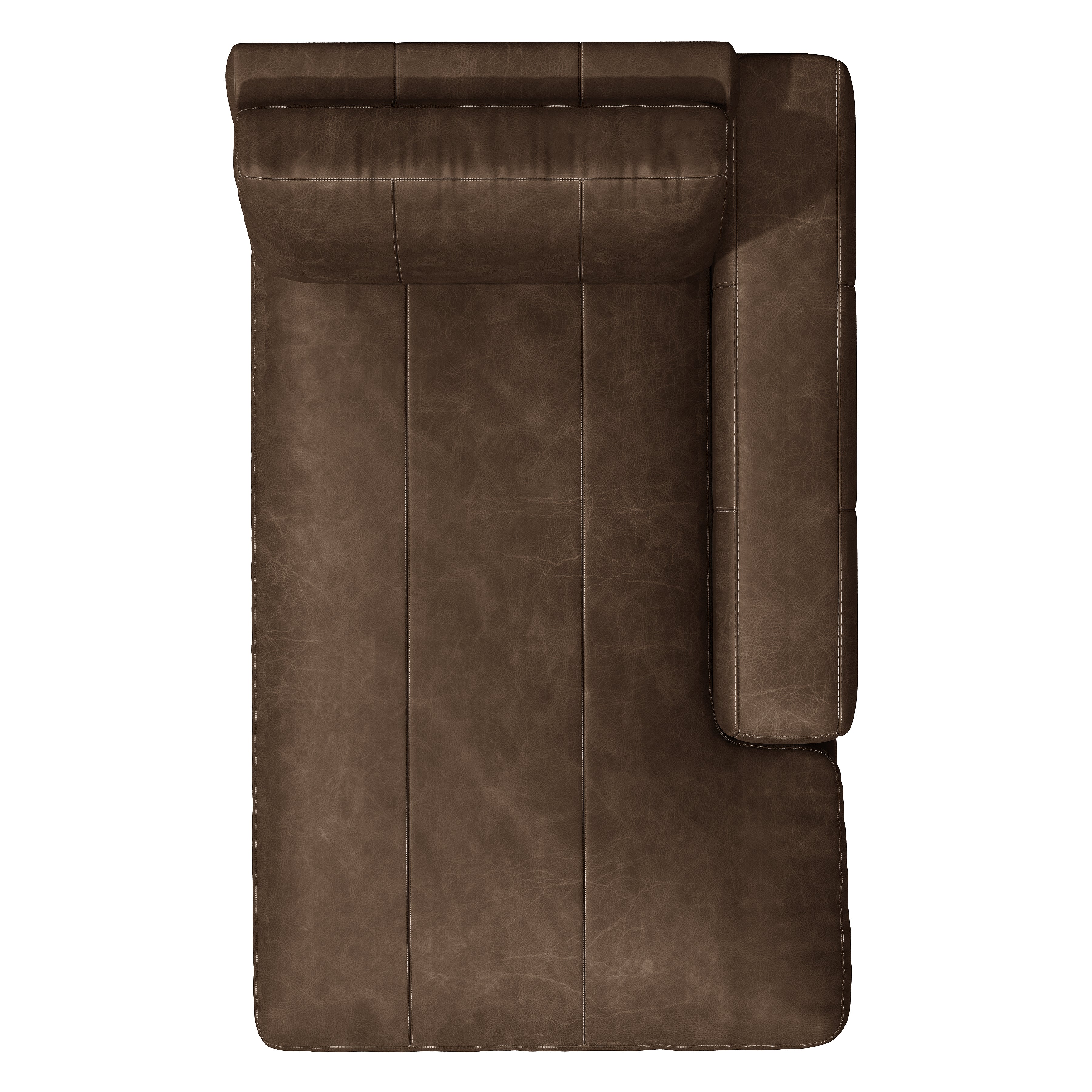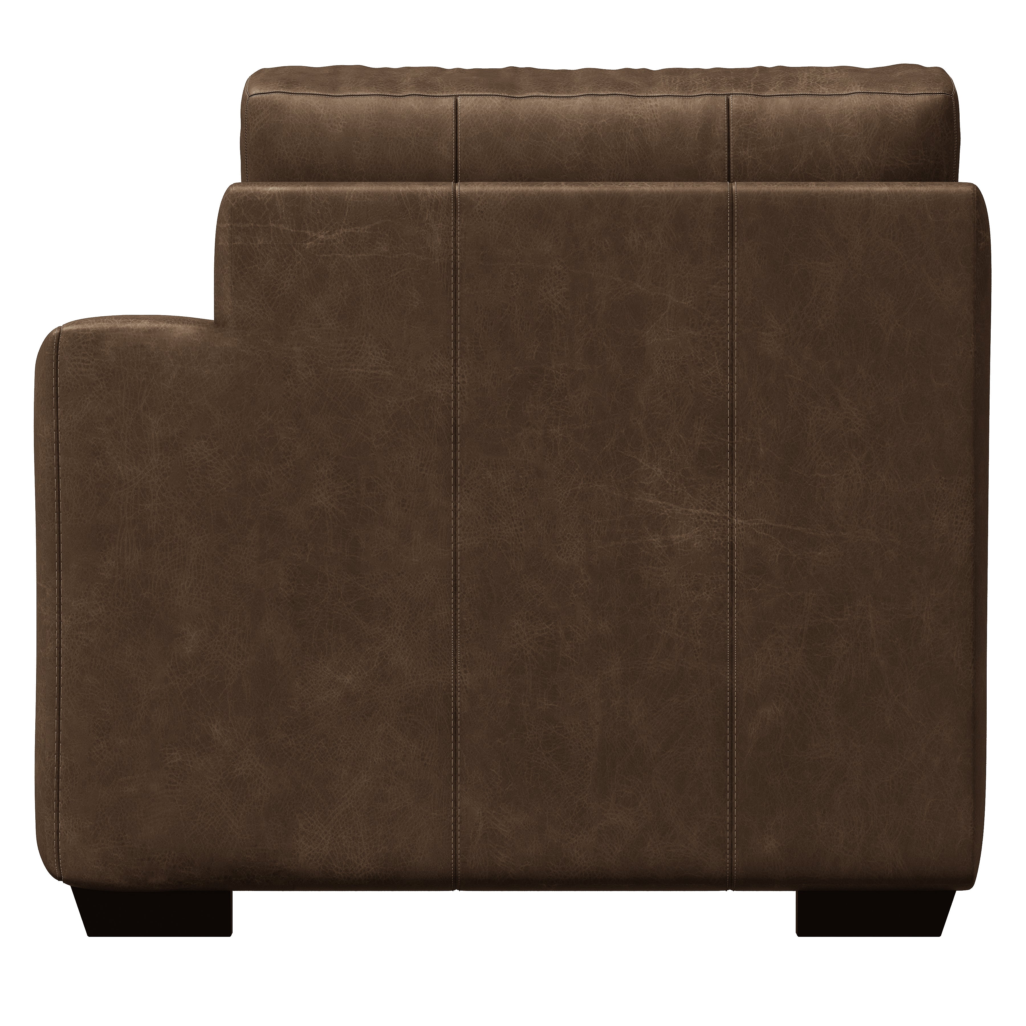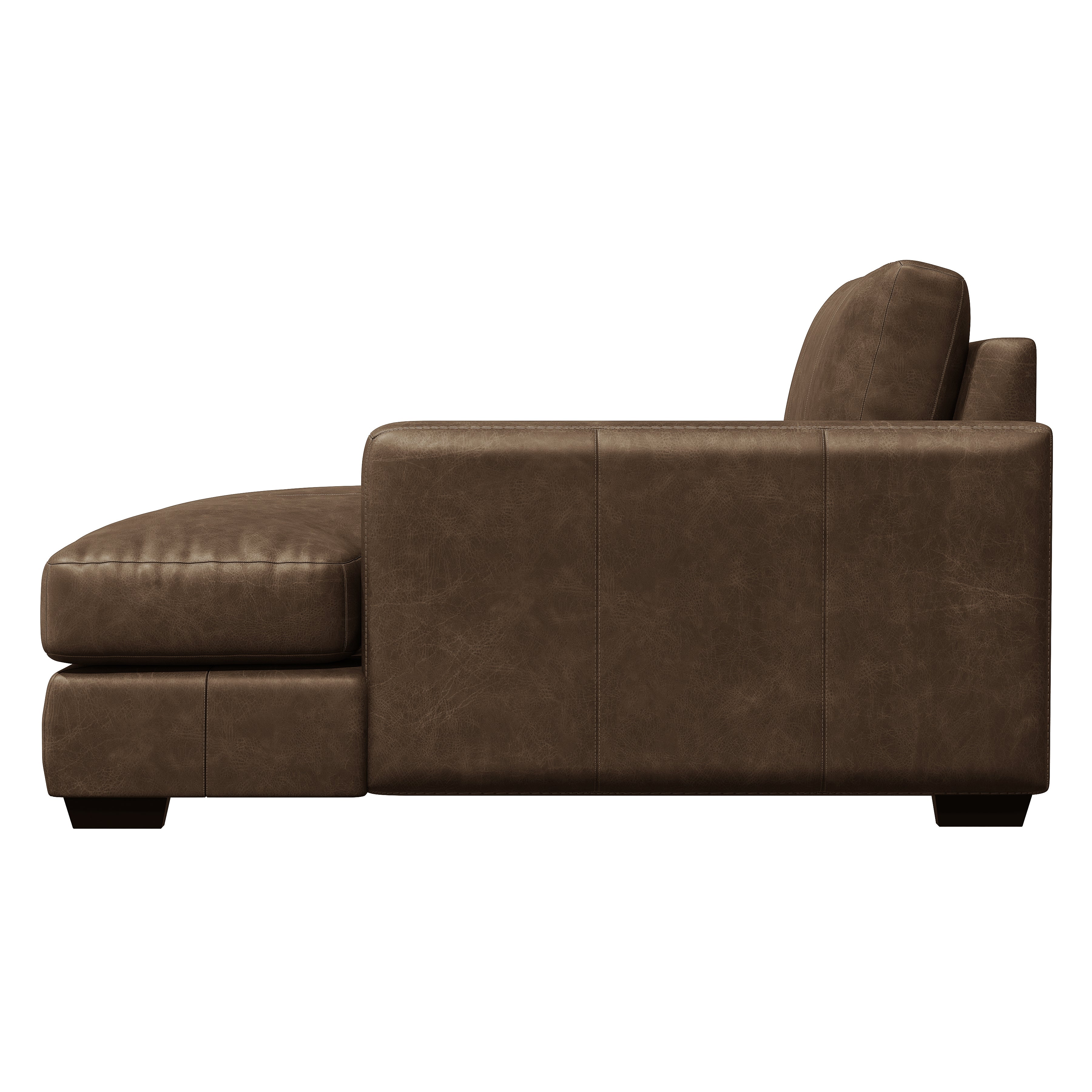 Dressed in luxurious top-grain leather, the Dawkins right arm chaise offers casual comfort with a high-end look. The timeless modern design features a wide track arm and tapered block feet, available in a variety of wood finishes. A plush cushion and fiber back pillow make this sophisticated chaise the perfect place to lounge in style.