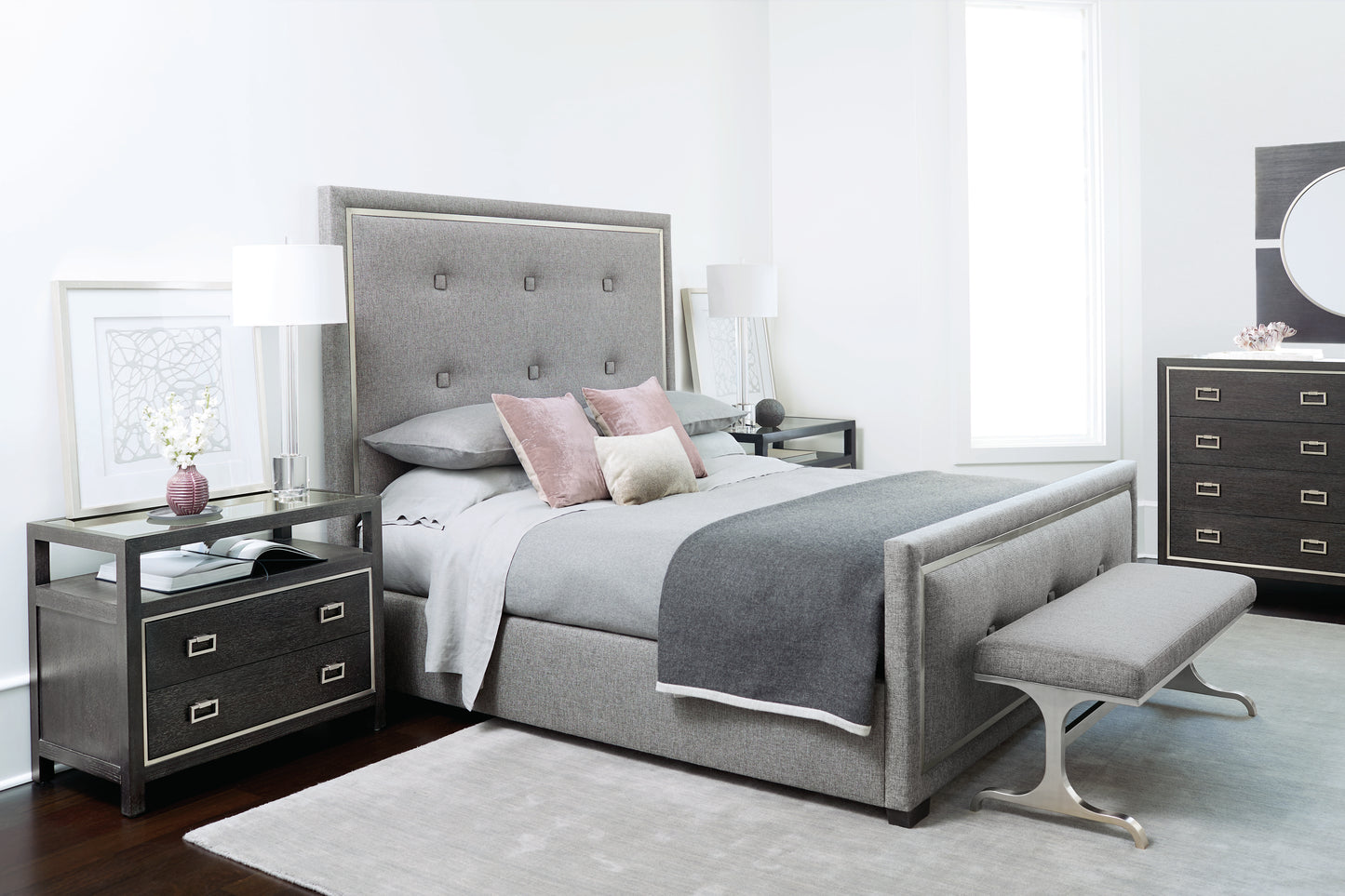 Upholstered headboard and footboard with inset Stainless Steel frame overlay inside of upholstered border in Silver Mist finish. Square fabric-covered buttons on inside front headboard panel and outside front footboard panel. Upholstered side rails. Three slat support system with center adjustable supports. Slat Height: 6.75 in. / 17.15 cm. Note: Headboard cannot be used alone. Must be ordered with footboard/side rails. Note: For optional fabric headboard/footboard, please use special order sku#'s and note fabric selection. Note: No fabric option on California King bed.