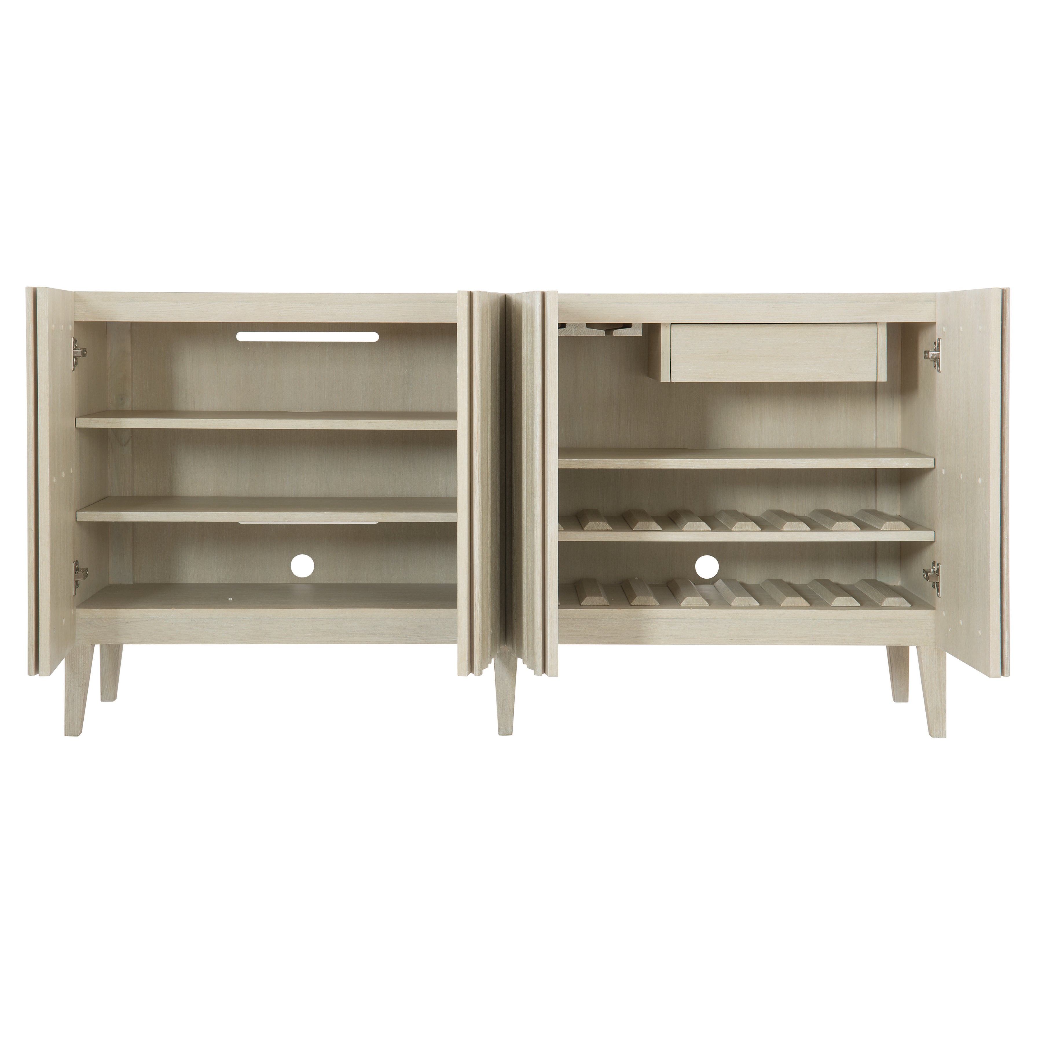 Foor doors with shaped vertical overlays. Behind left pair of doors are two adjustable / removable shelves, one bottom shelf surface, ventilation holes and one grommet hole with cover in back panel. Behind right pair of doors are two ajustable/removable shelves with removable wine bottle holders; each accomodating up to seven standard wine bottles, two stemware racks - each accomodating up to three stems and one drawer with finger pull and wrapped pad. Adjustable glides. Not designed to support TV and/or other media.