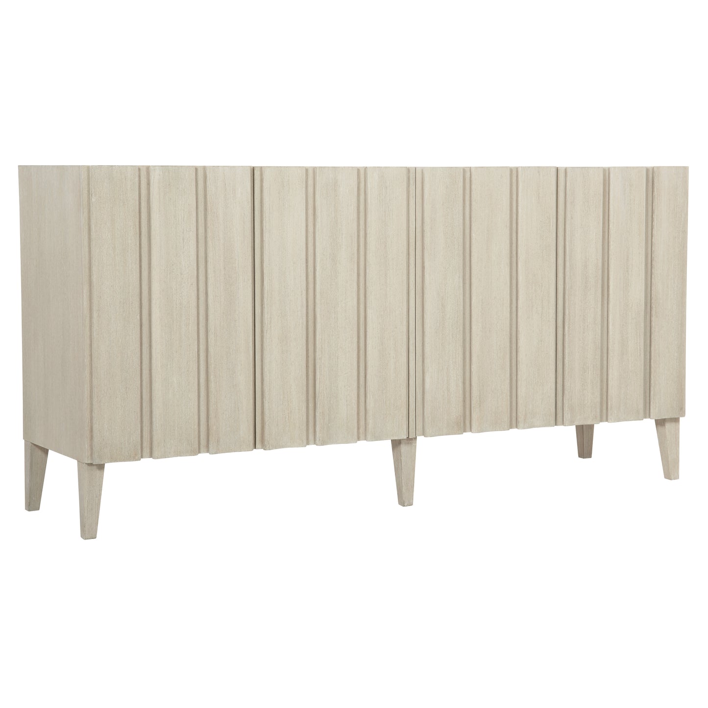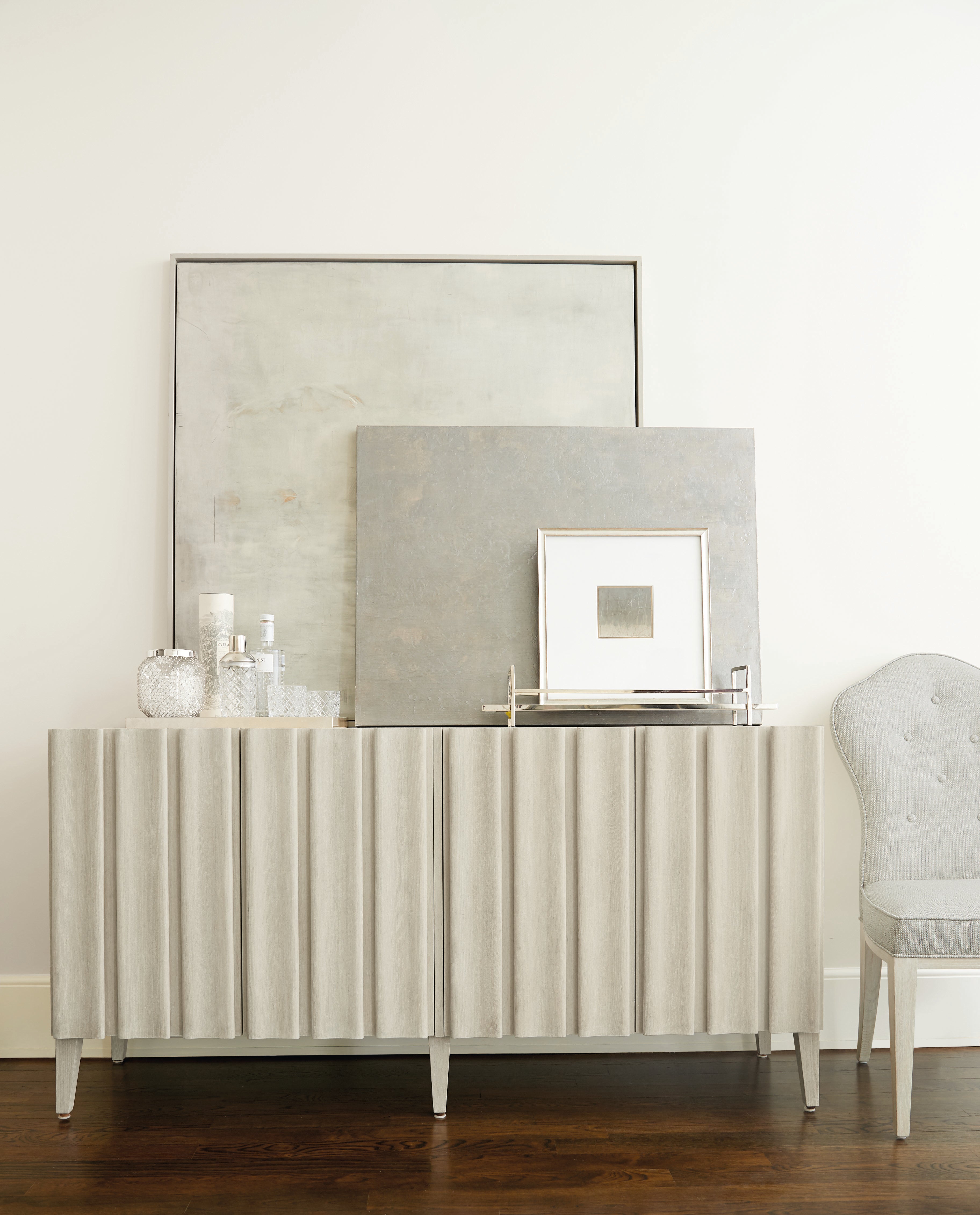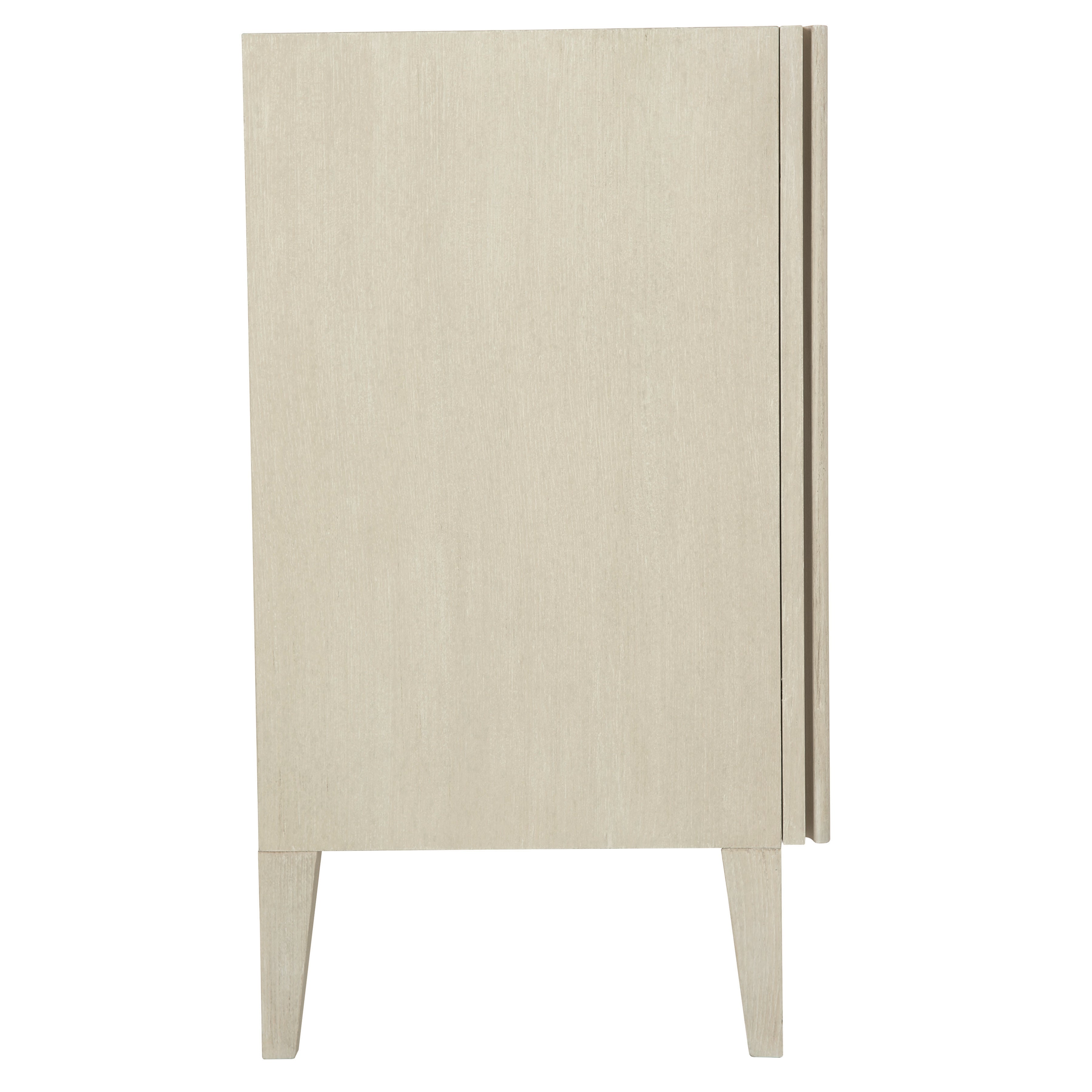 The East Hampton entertainment console features shaped vertical overlays, adding depth and dimension to the minimalist design. Quartered ash veneers feature a Cerused Linen finish, created using light wire brushing and cerusing techniques to highlight the linear wood grain. The soft finish blends with the subtle curvature of the overlays to create a look that is slightly feminine. Slender tapered feet contribute to the clean, modern aesthetic.