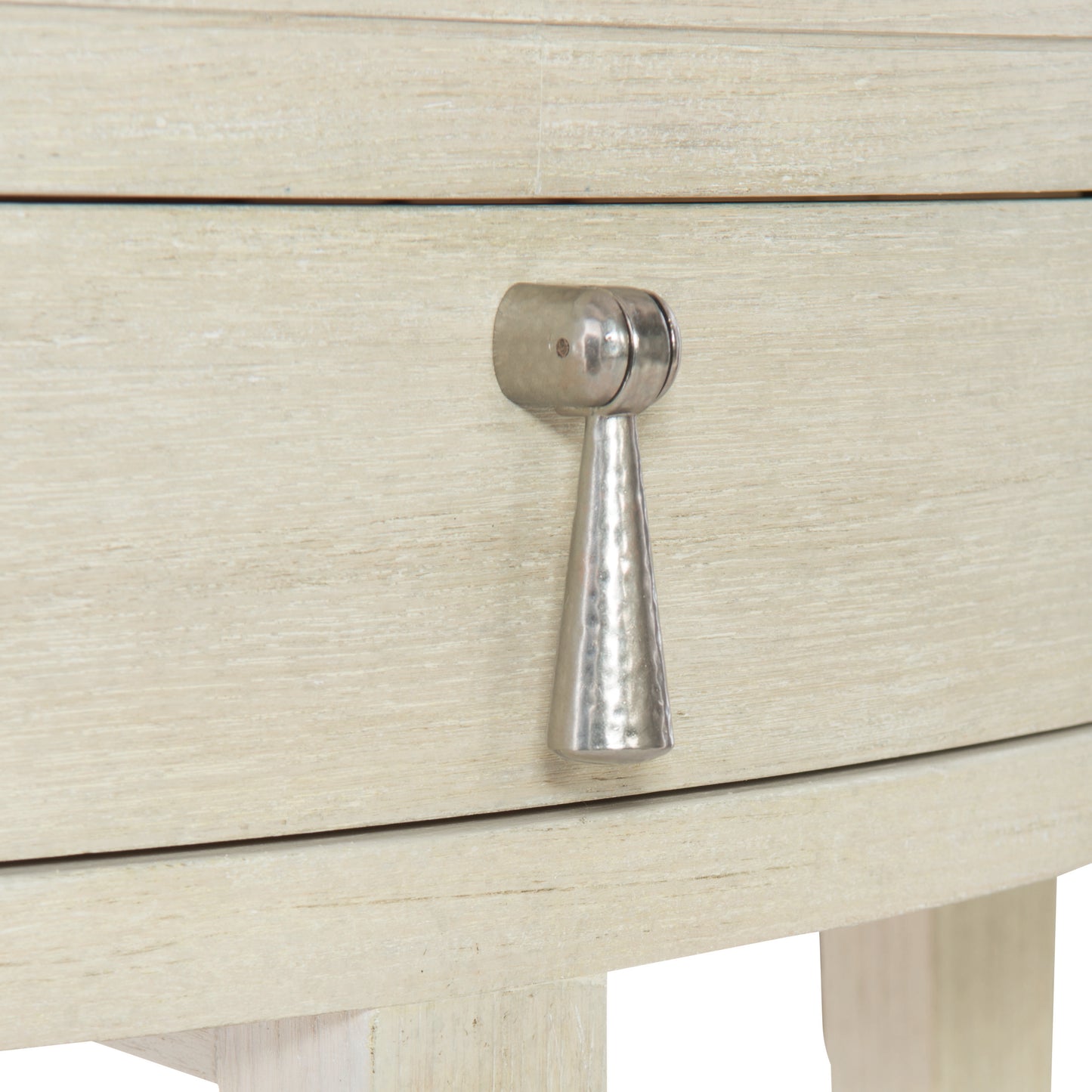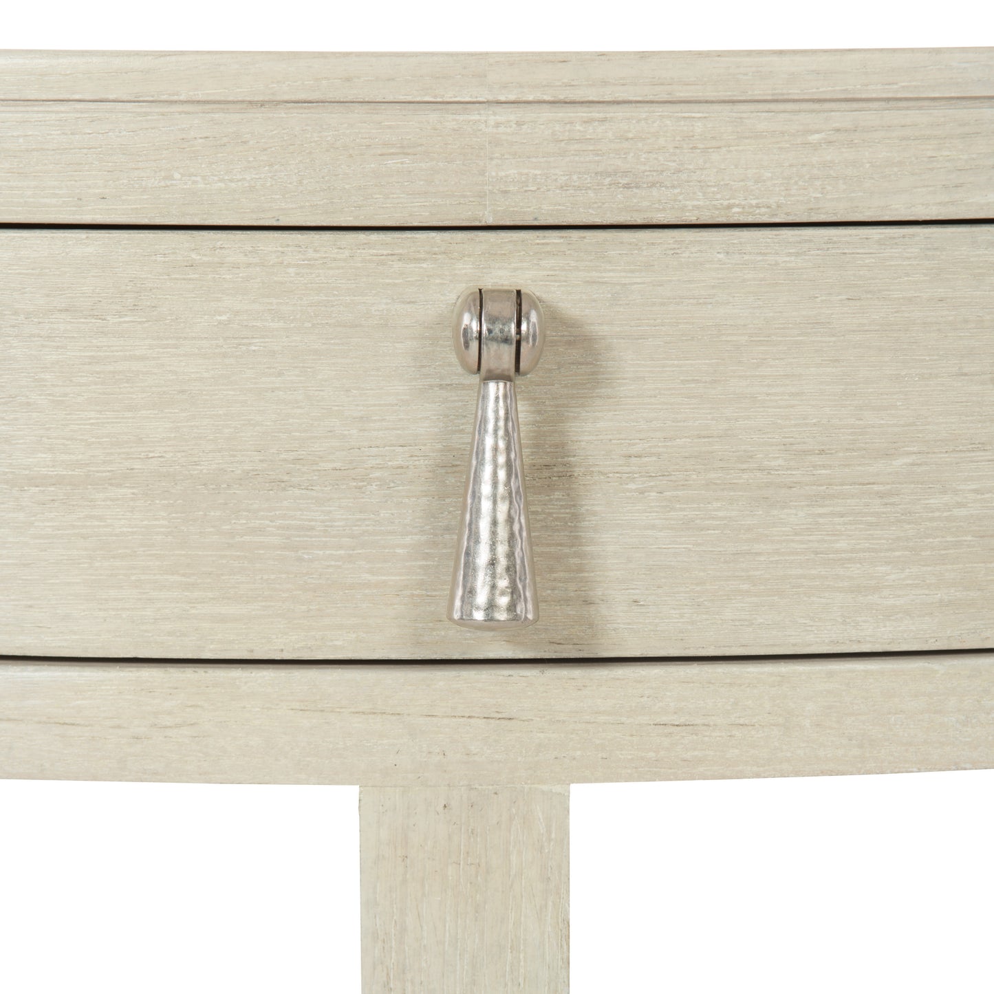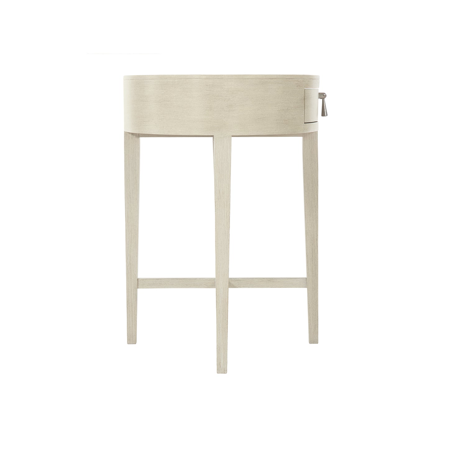 The East Hampton oval nightstand radiates simplicity and style. Graceful curves and clean lines combine for a modern aesthetic inspired by traditional English design. A light Cerused Linen finish highlights the linear wood grain of quartered ash veneers. A pendant drawer pull in die-cast nickel-plated zinc adds a hint of shine to the muted hues of this piece.