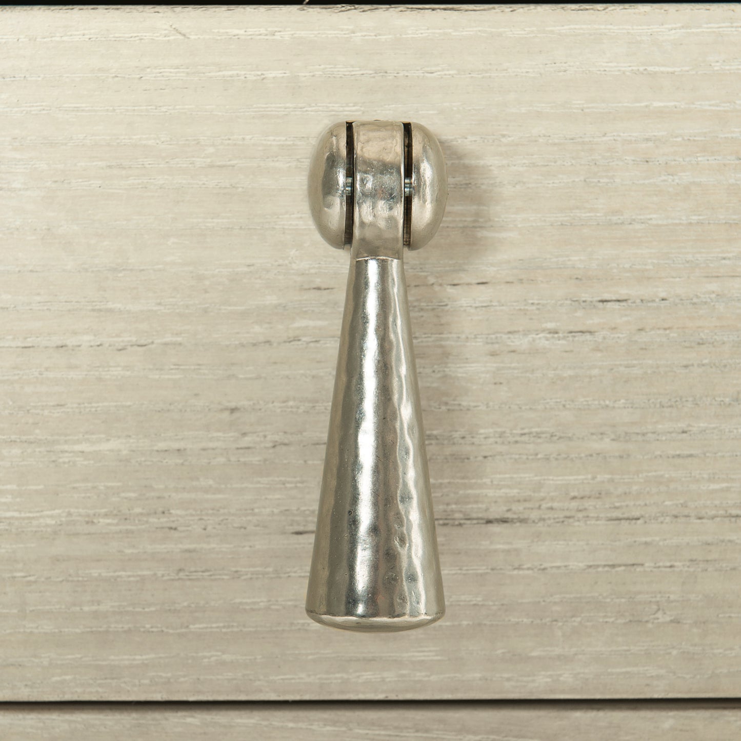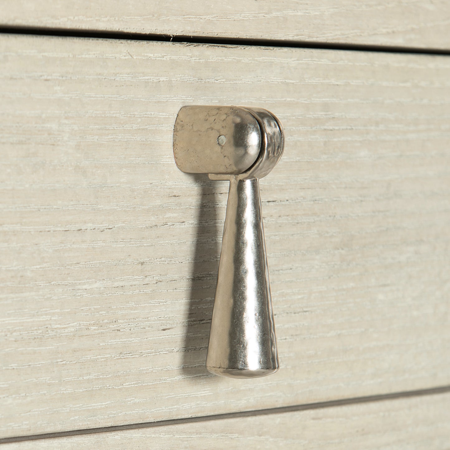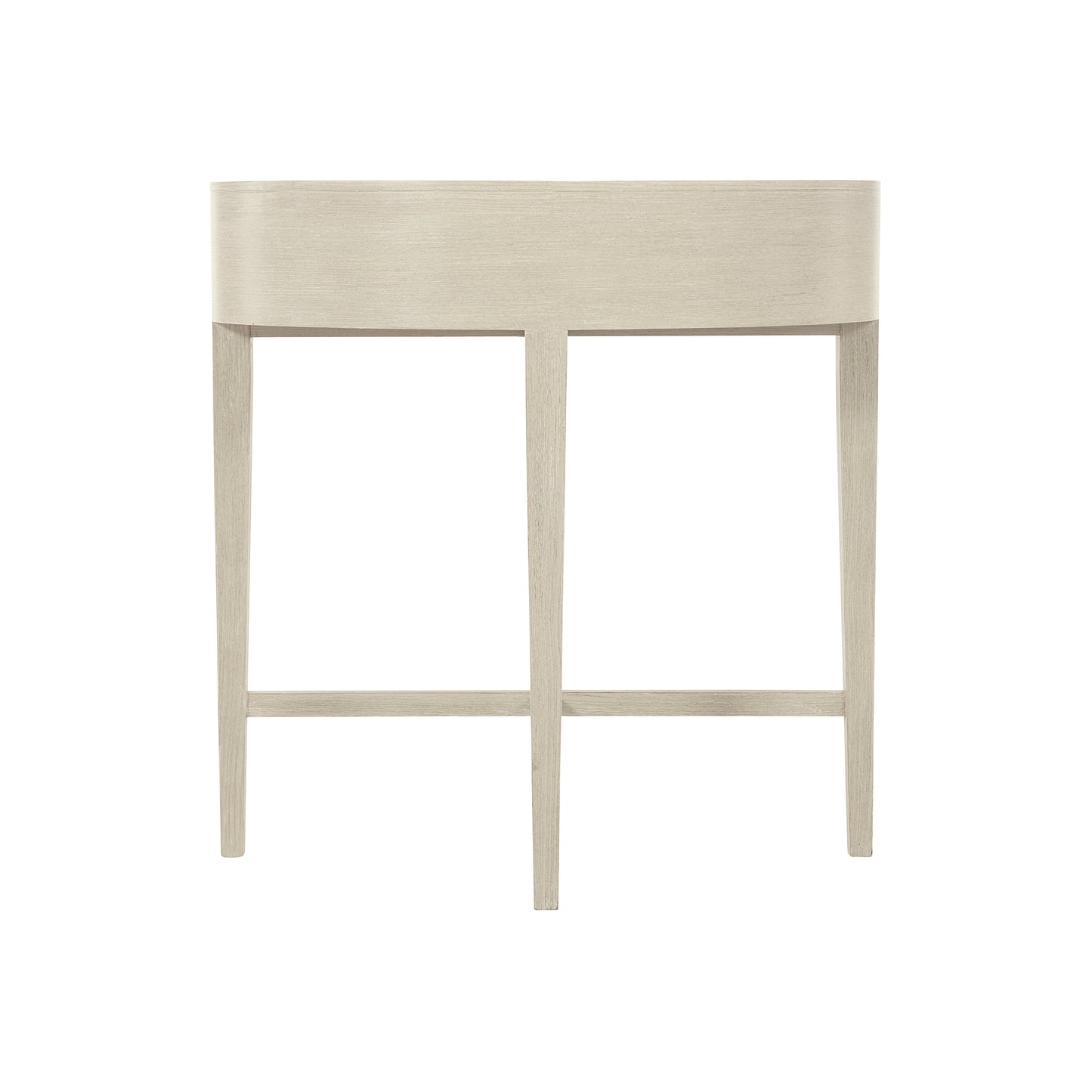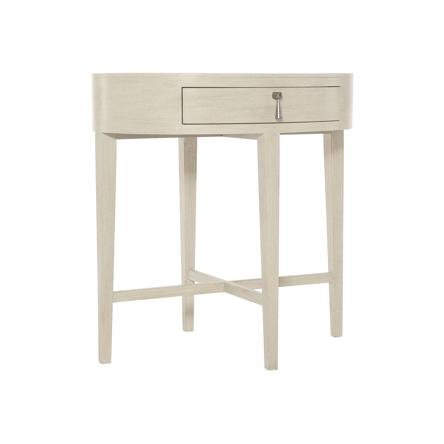 The East Hampton oval nightstand radiates simplicity and style. Graceful curves and clean lines combine for a modern aesthetic inspired by traditional English design. A light Cerused Linen finish highlights the linear wood grain of quartered ash veneers. A pendant drawer pull in die-cast nickel-plated zinc adds a hint of shine to the muted hues of this piece.