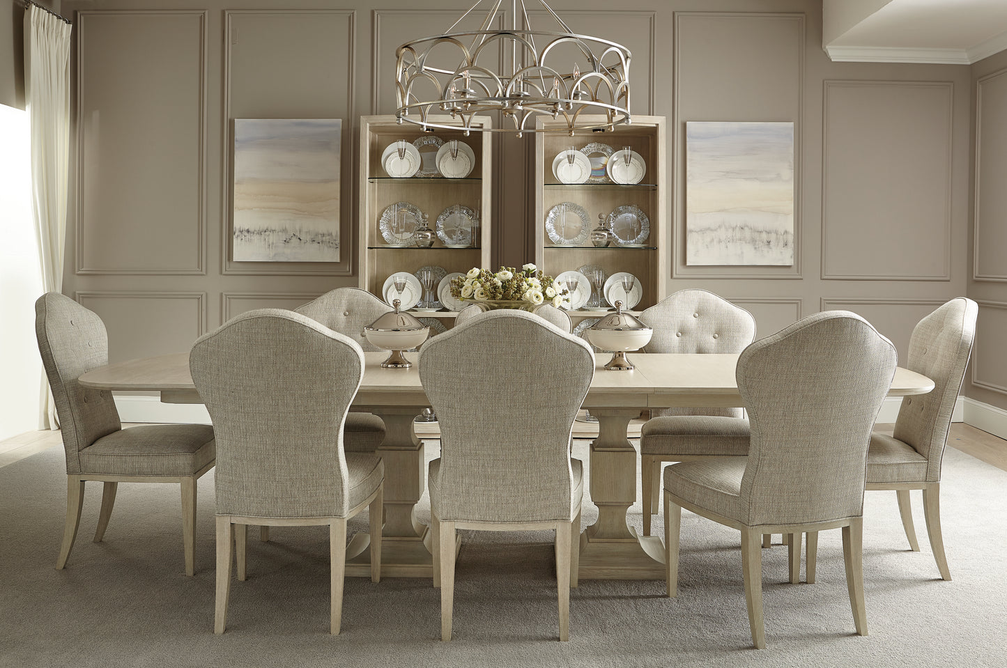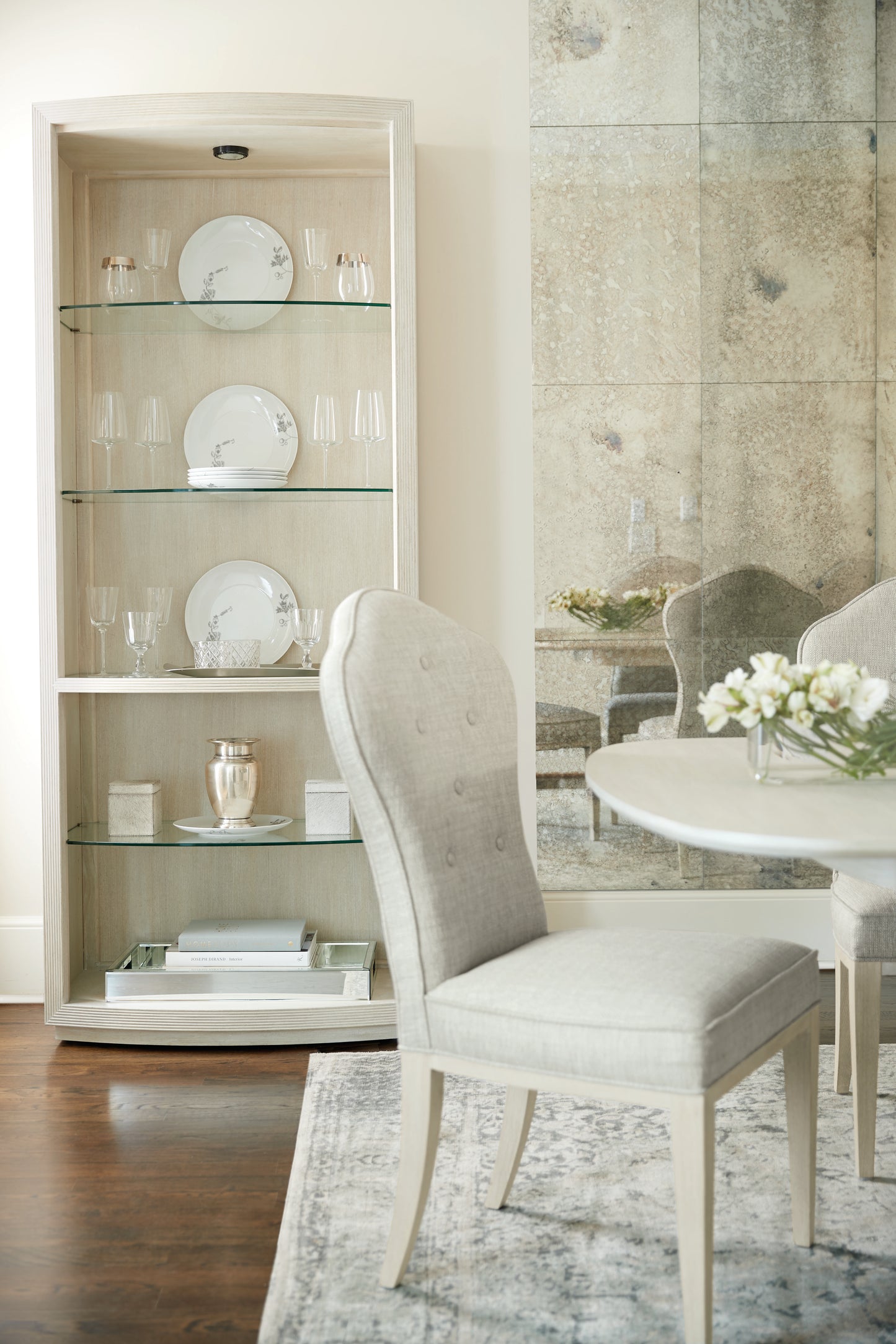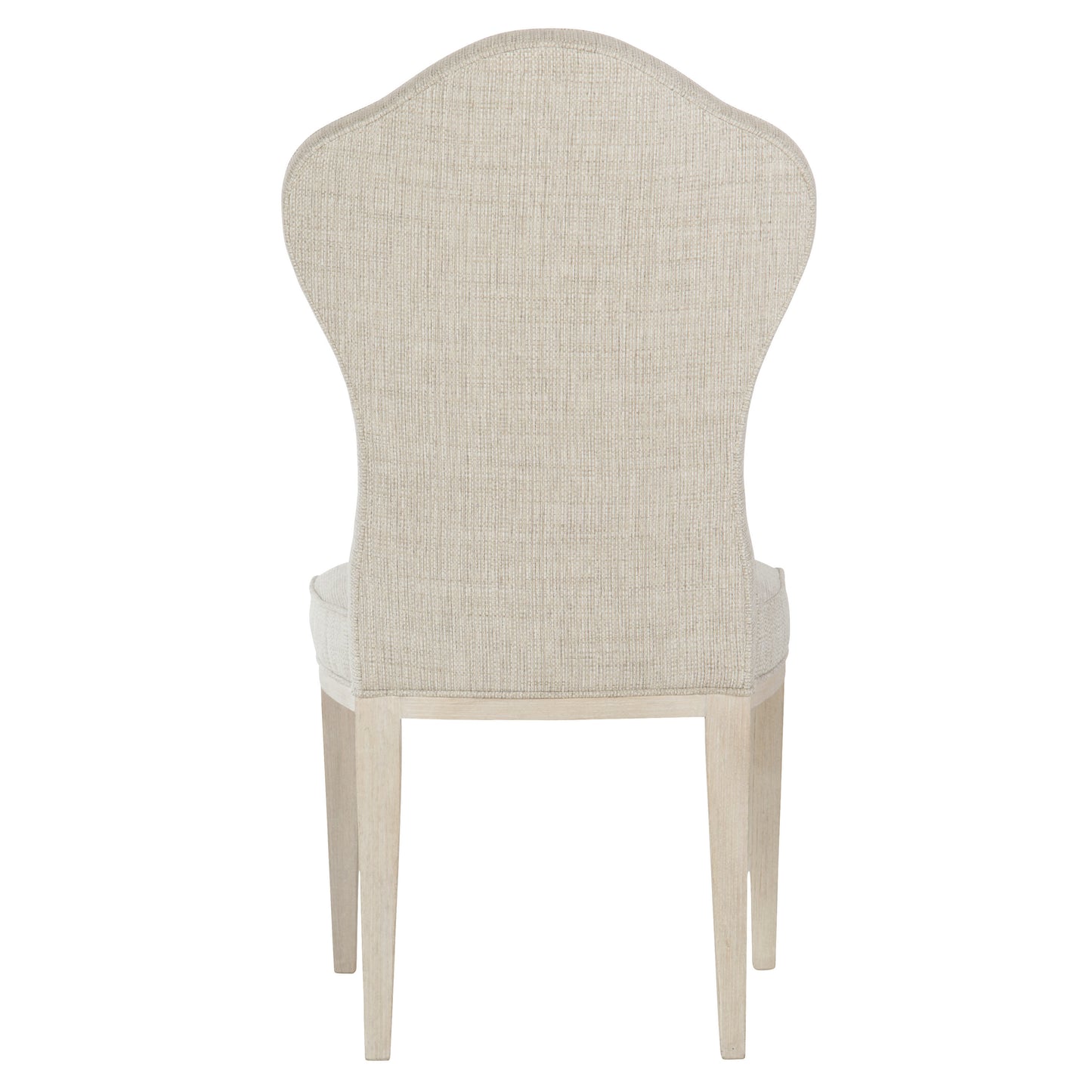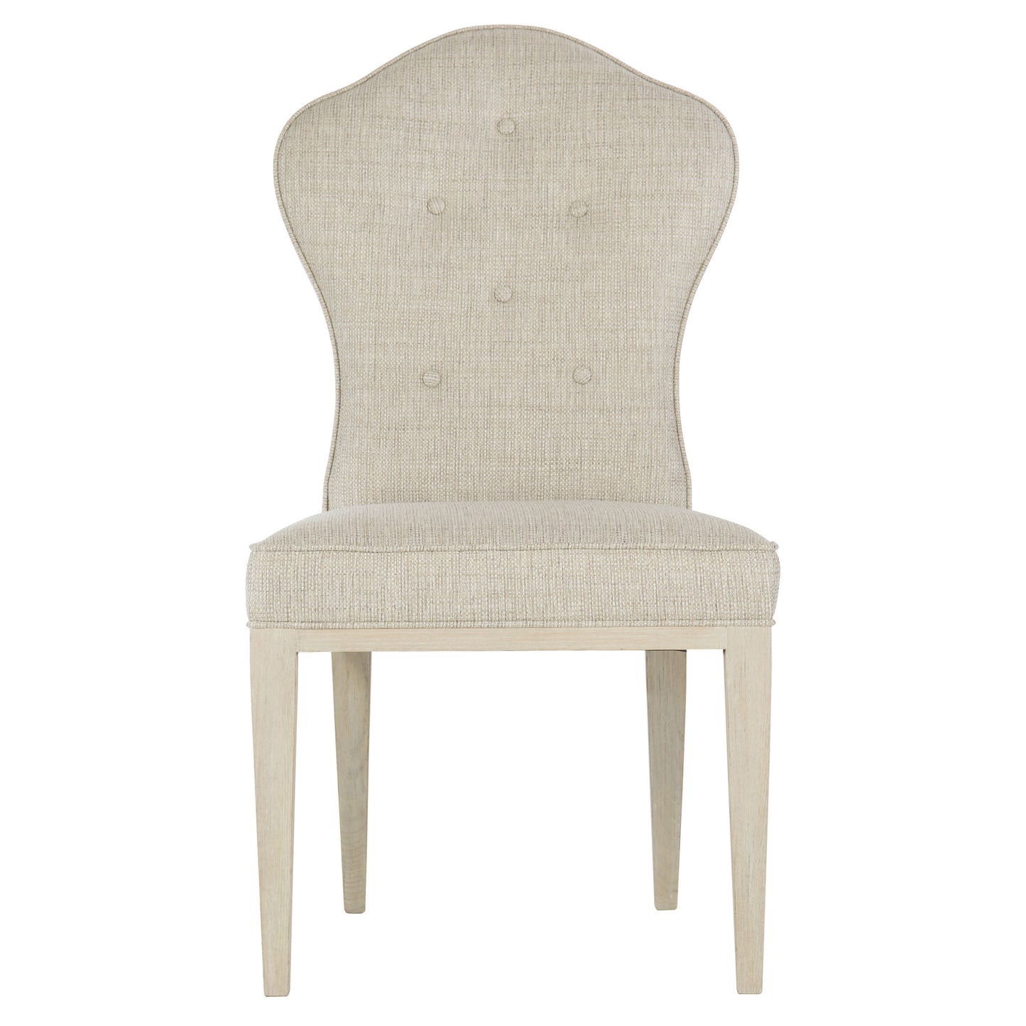 The East Hampton collection is defined by its minimalist aesthetic, achieved through soft finishes, graceful curves and subtle accents. A modernist interpretation of the iconic English throne chair, this timeless piece features a classic throne back with button tufting. The muted gray fabric features a subtle weave, adding softness and texture that complements the curved shape of the chair. The upholstery is welted for a clean, crisp finishing touch.