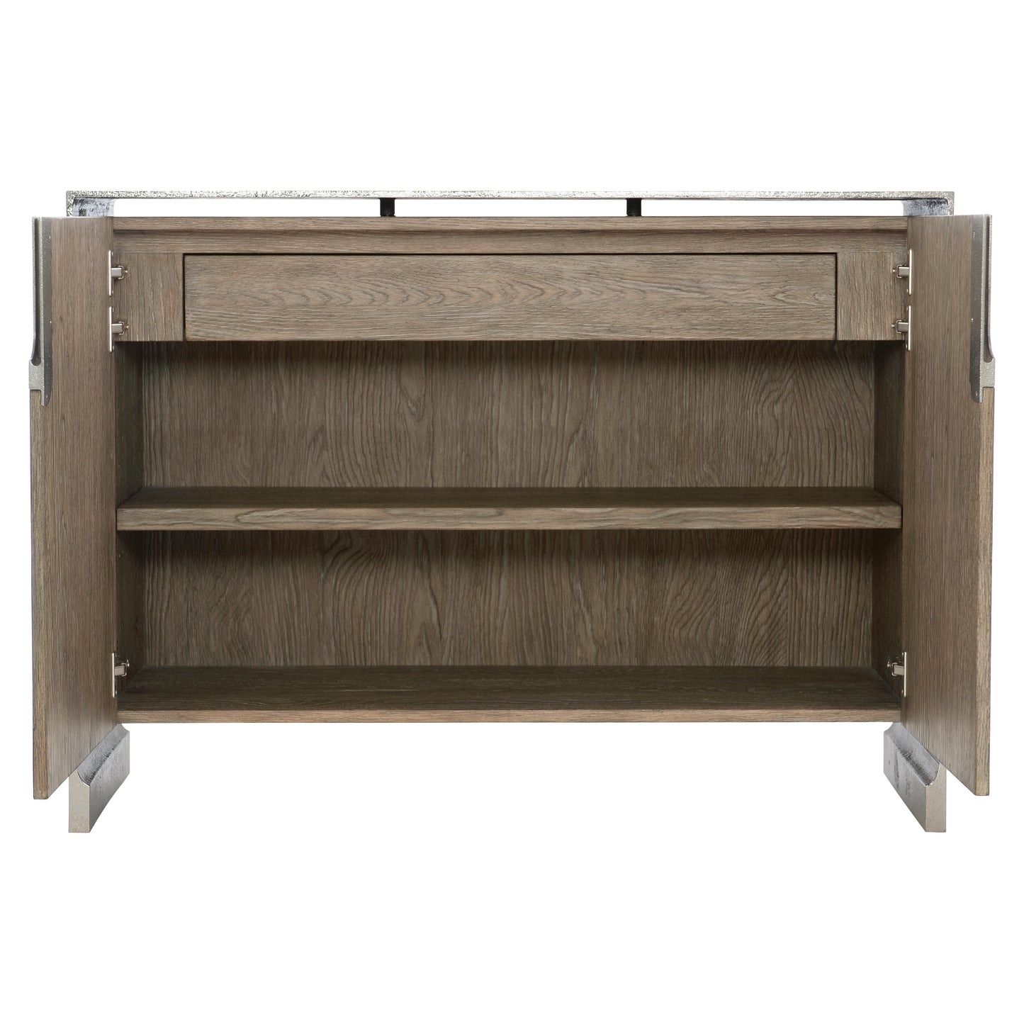 White oak veneer inner case in Tamarind finish. Cast aluminum outer case in shiny nickel finish. Two soft-close doors with recessed metal finger pull. Behind doors is one soft-close drawer with finger pull, one adjustable/removable shelf and fixed bottom shelf surface. Adjustable glides. Anti-tip kit. Note: Not designed to support TV &/or other media.