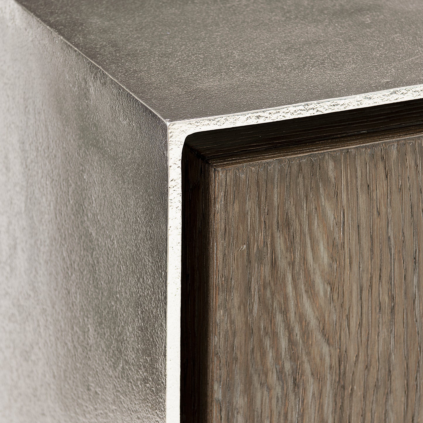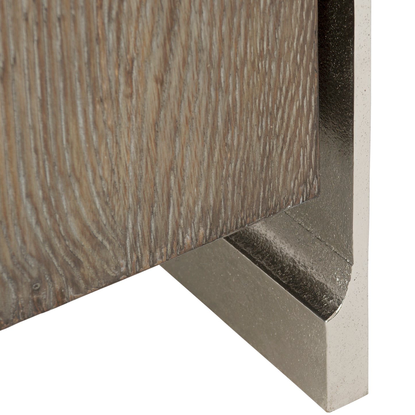Elegant and distinctly modern, the Ellis door chest combines unique materials in its singular design. White oak veneers in tamarind finish highlight the natural beauty of the wood grain. In a shimmering nickel finish, the cast aluminum outer case creates contrast and brings an industrial edge. Oblong metal pulls are a graceful touch.
