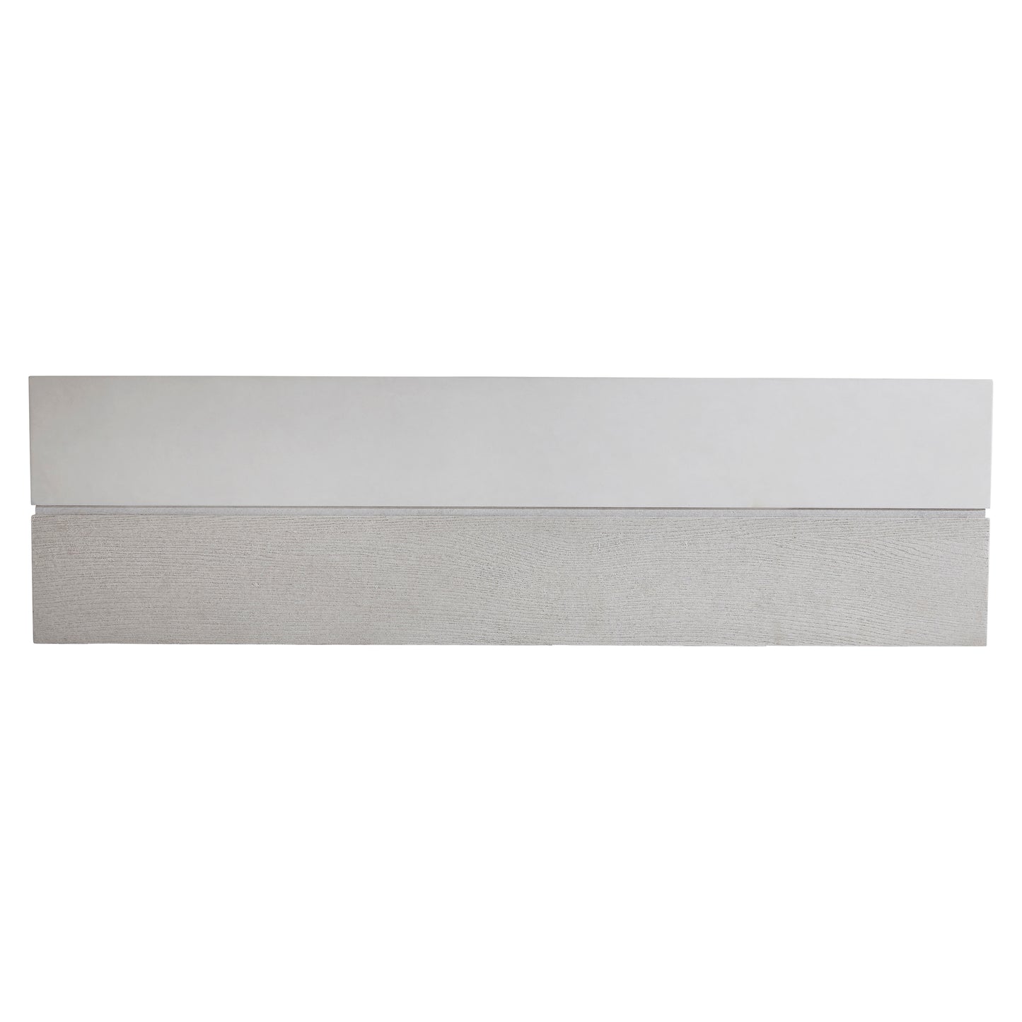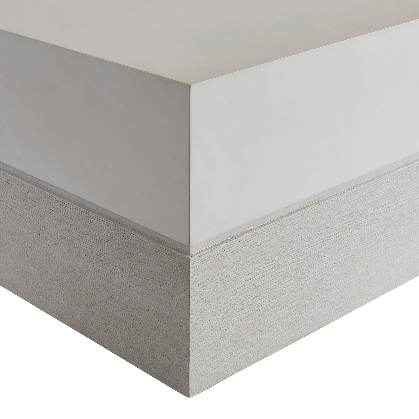 An iconic design makes a daringly simple statement in the Ellison cocktail table. Uncomplicated lines create sophistication with an Adobe faux stone finish on the top and a sandblasted white finish on the base. Non-marring, heavy-duty casters are included on the bottom of this 54-inch table.