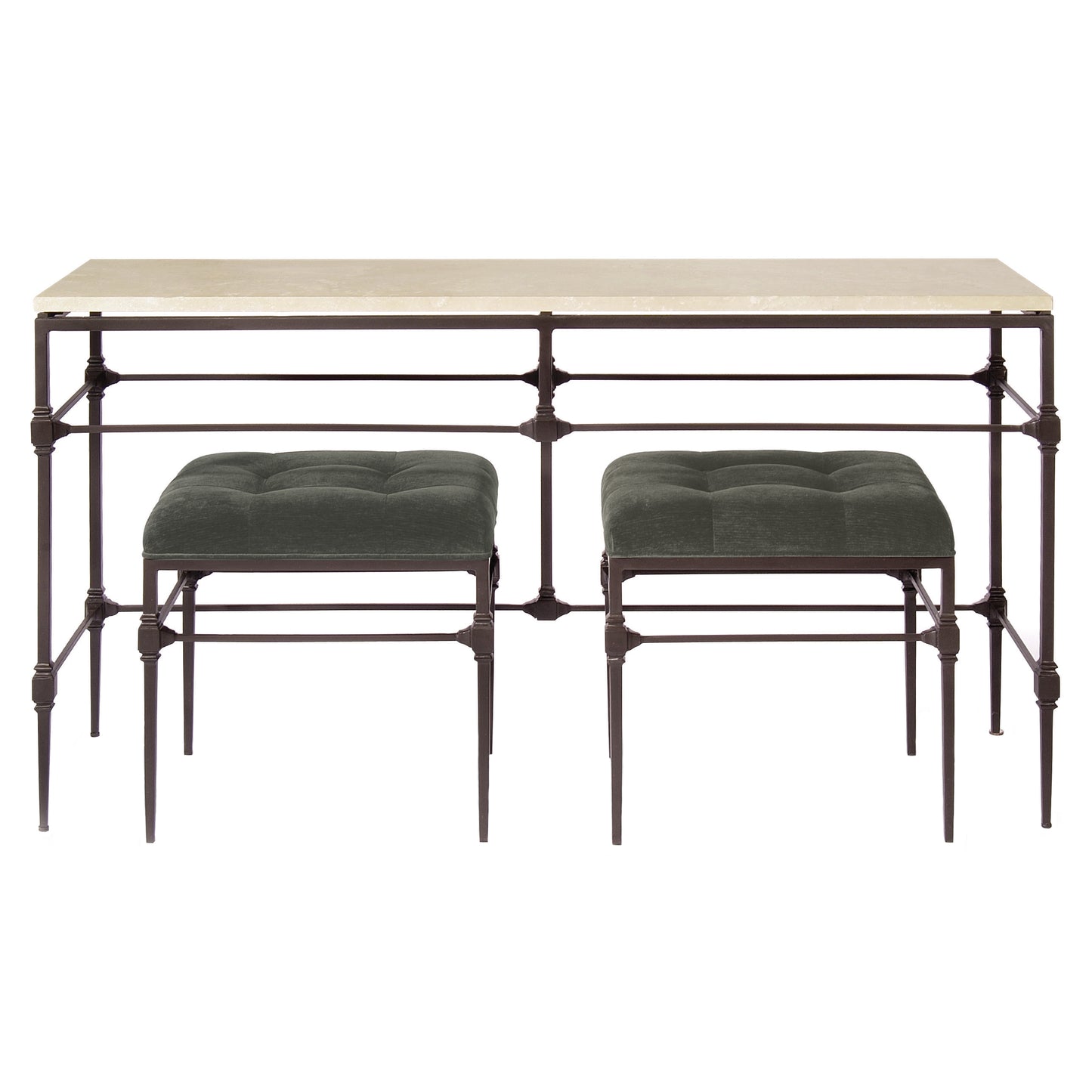 The Ellsworth console table uses an original mix of organic and industrial elements to create a sleek, modern look. With its artfully crafted couplings, the cast iron base is at once delicate and reminiscent of an urban landscape. The warm, neutral tone of the honed travertine top adds a touch of natural beauty.