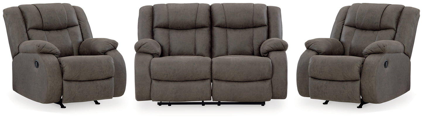 This loveseat tees you up to catch up on streaming or enjoy the latest game without breaking the bank. Its easy reclining motion and inviting stitched details craft a stylish seat that keeps you utterly at ease. And with a versatile neutral faux leather, this loveseat knocks contemporary comfort out of the park. 2 matching recliners also included.