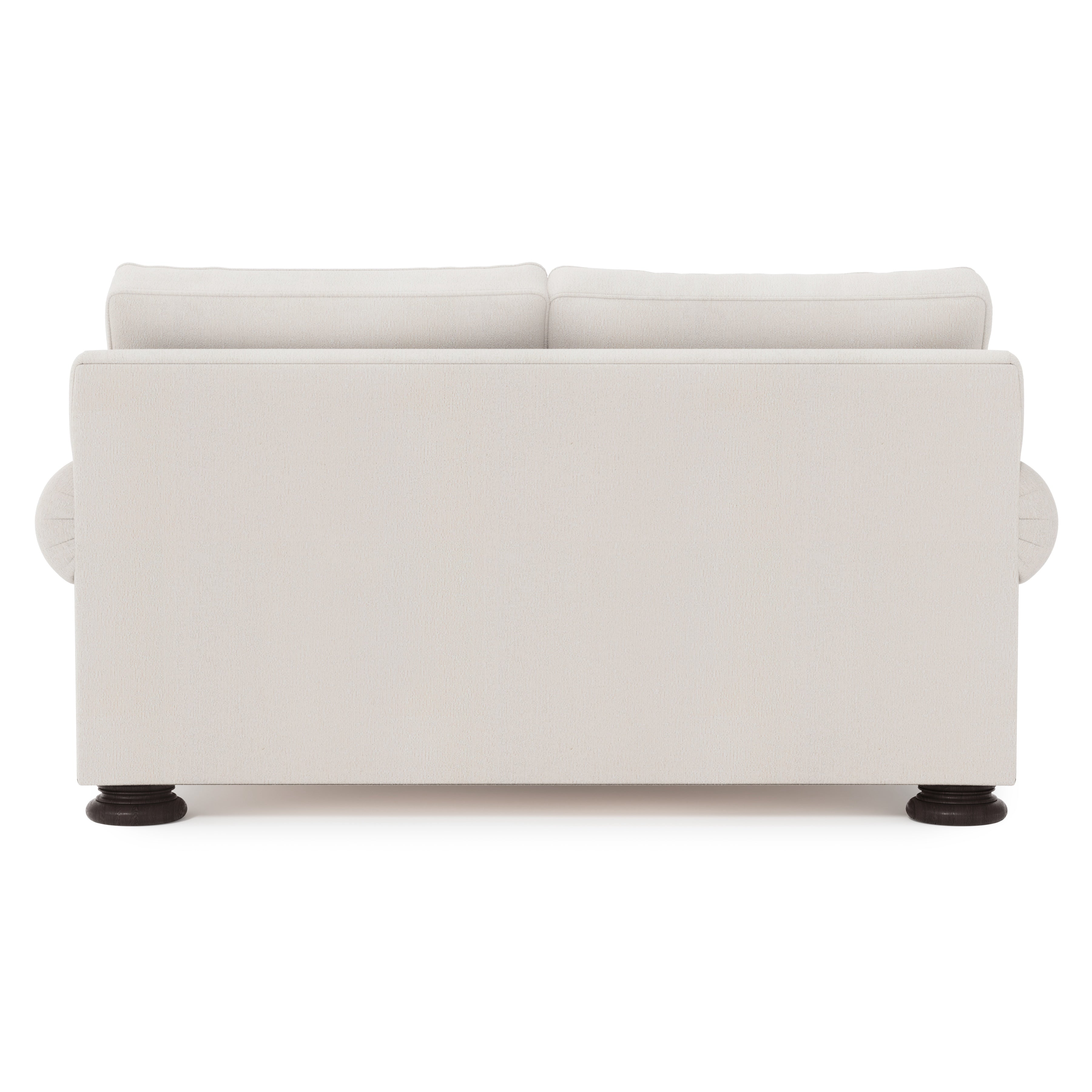 The stately Foster loveseat offers comfortable support with an air of traditional grandeur. The plush cushions invite relaxation, while rolled arms, nailhead trim, and wide bun feet exude refinement. Throw pillows complement the sofa and surrounding decor.