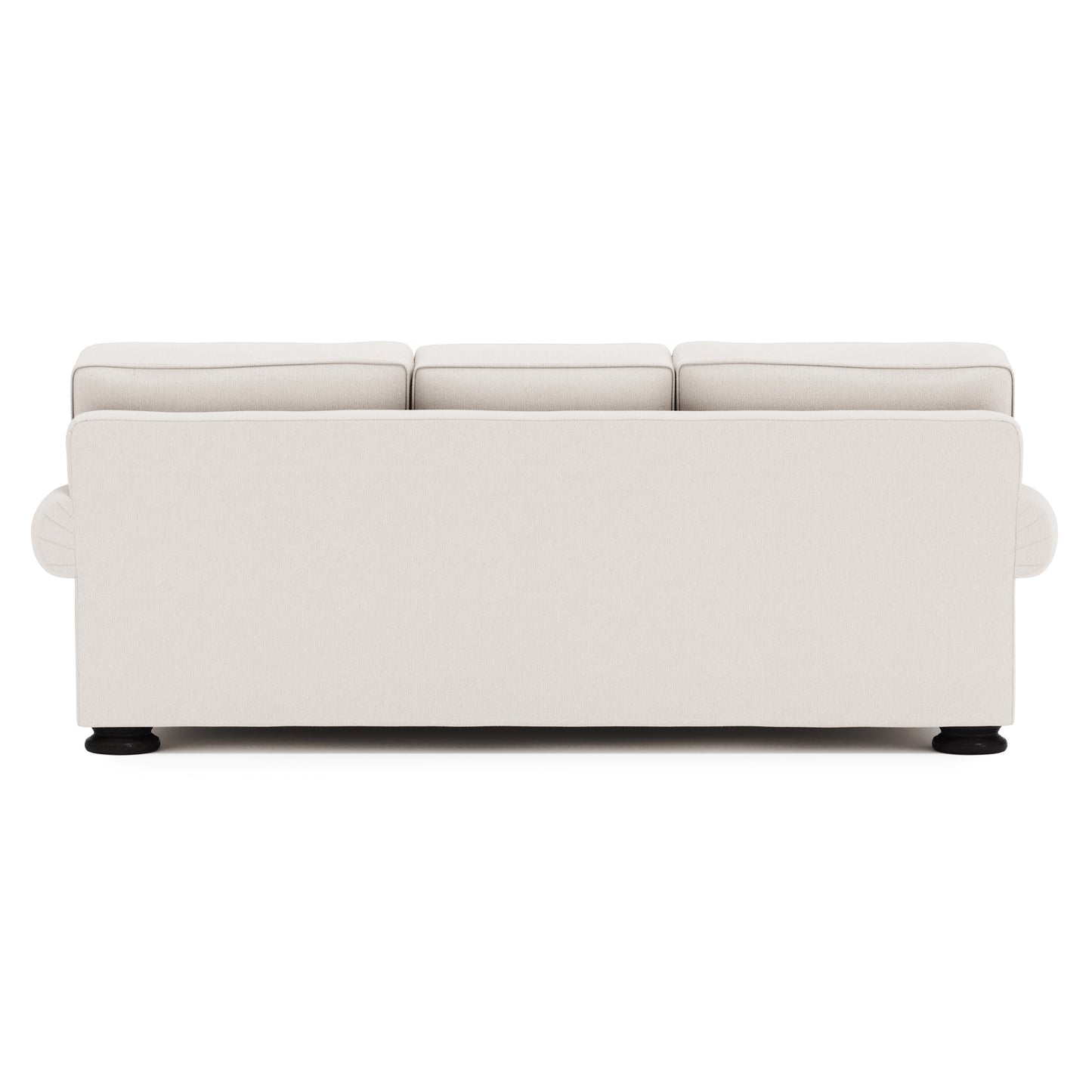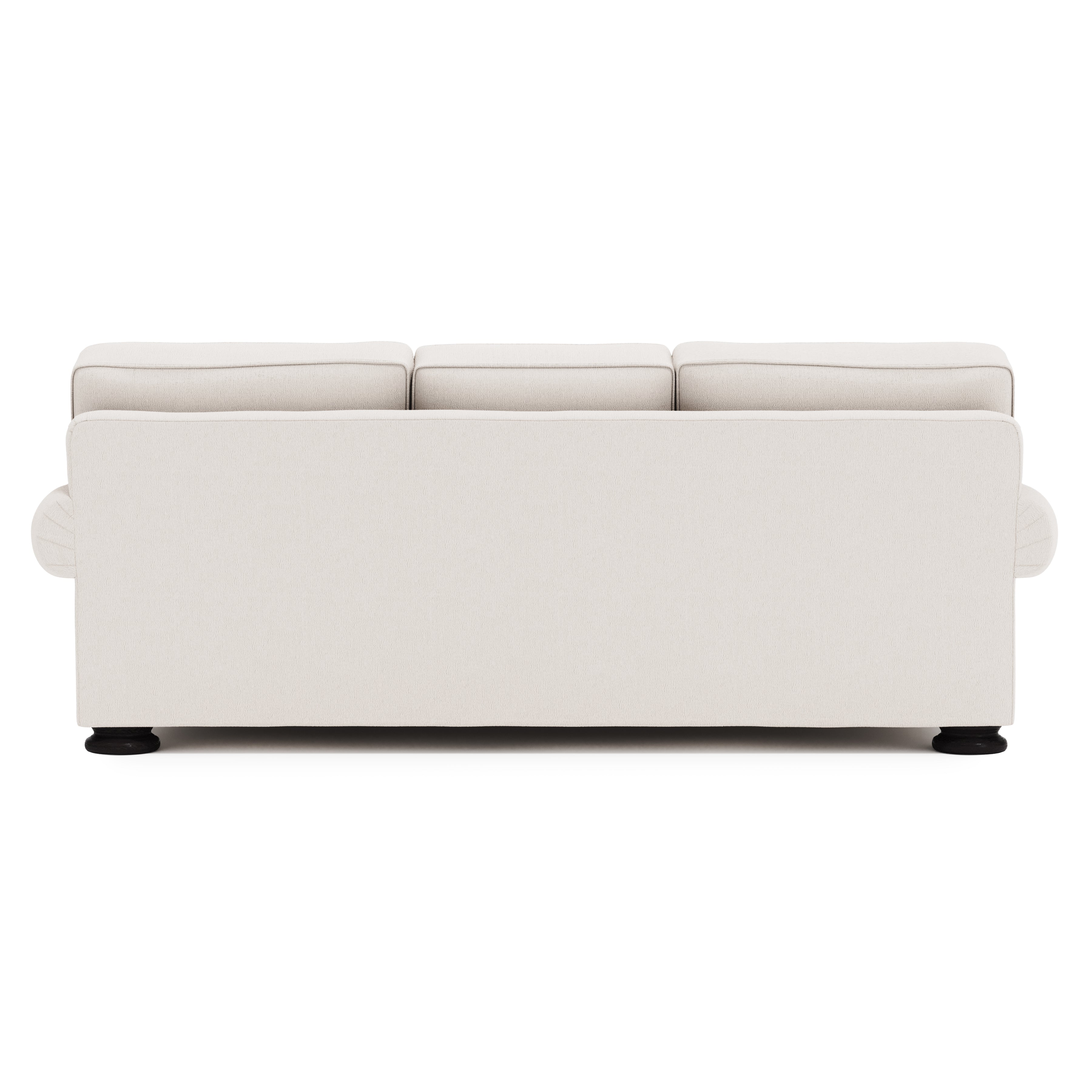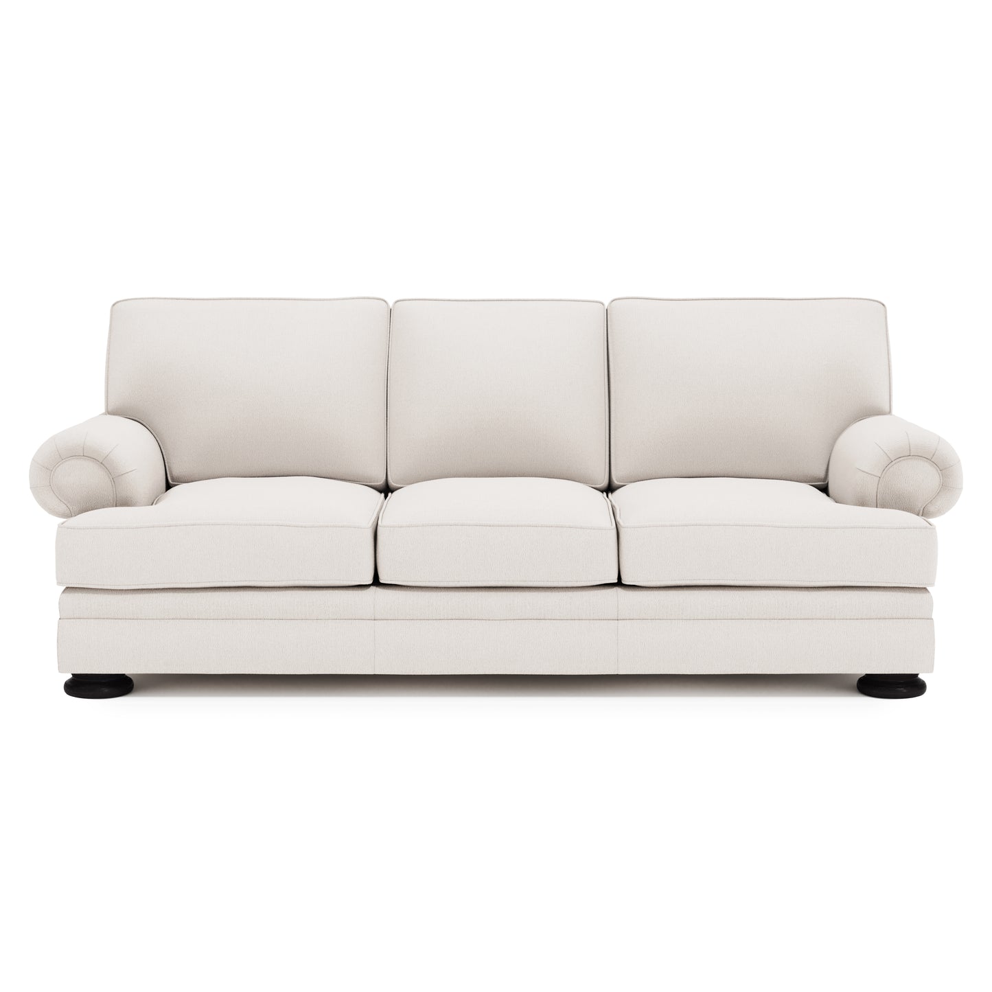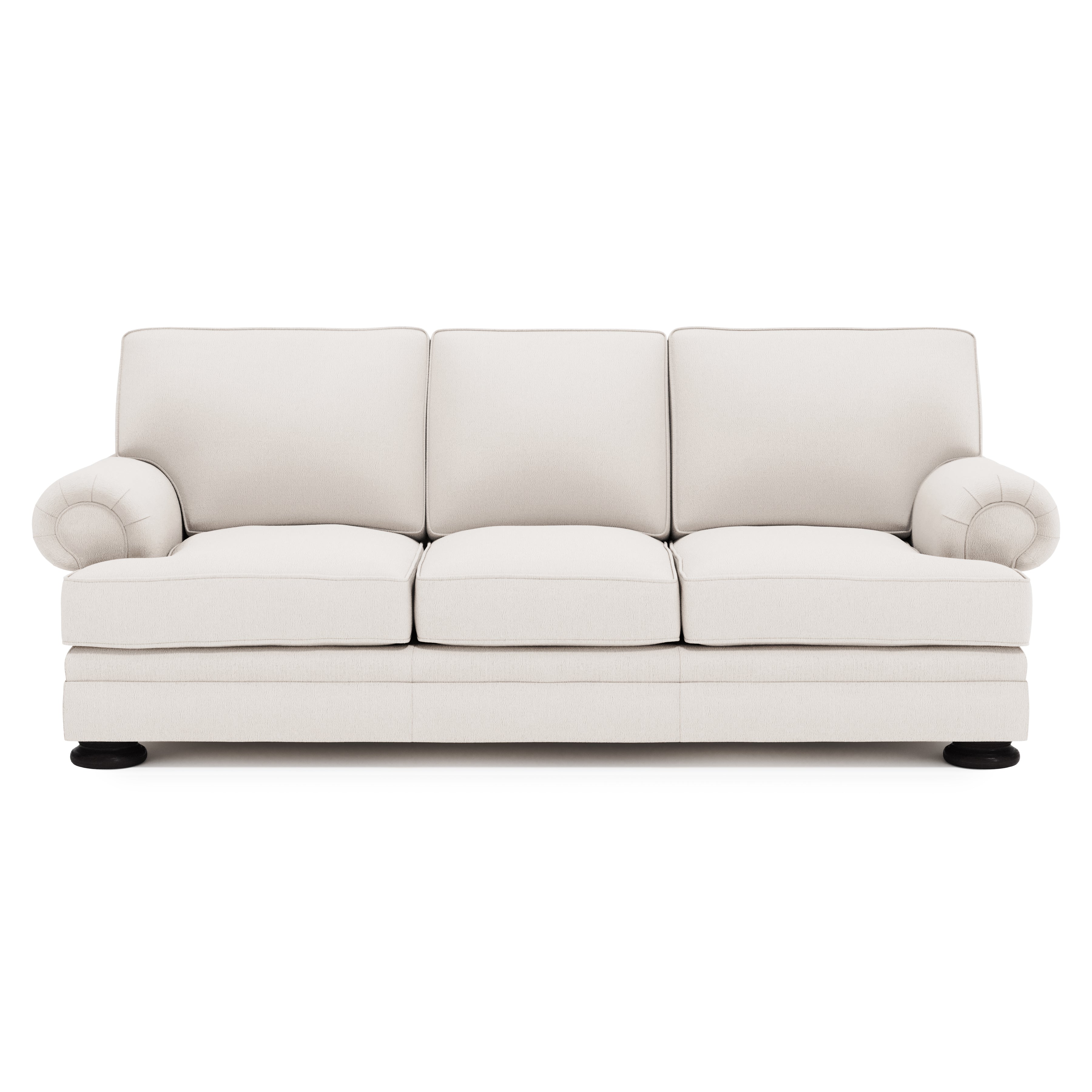 The stately Foster sofa offers comfortable support with an air of traditional grandeur. The plush cushions invite relaxation, while rolled arms, welt trim, and wide bun feet exude refinement.