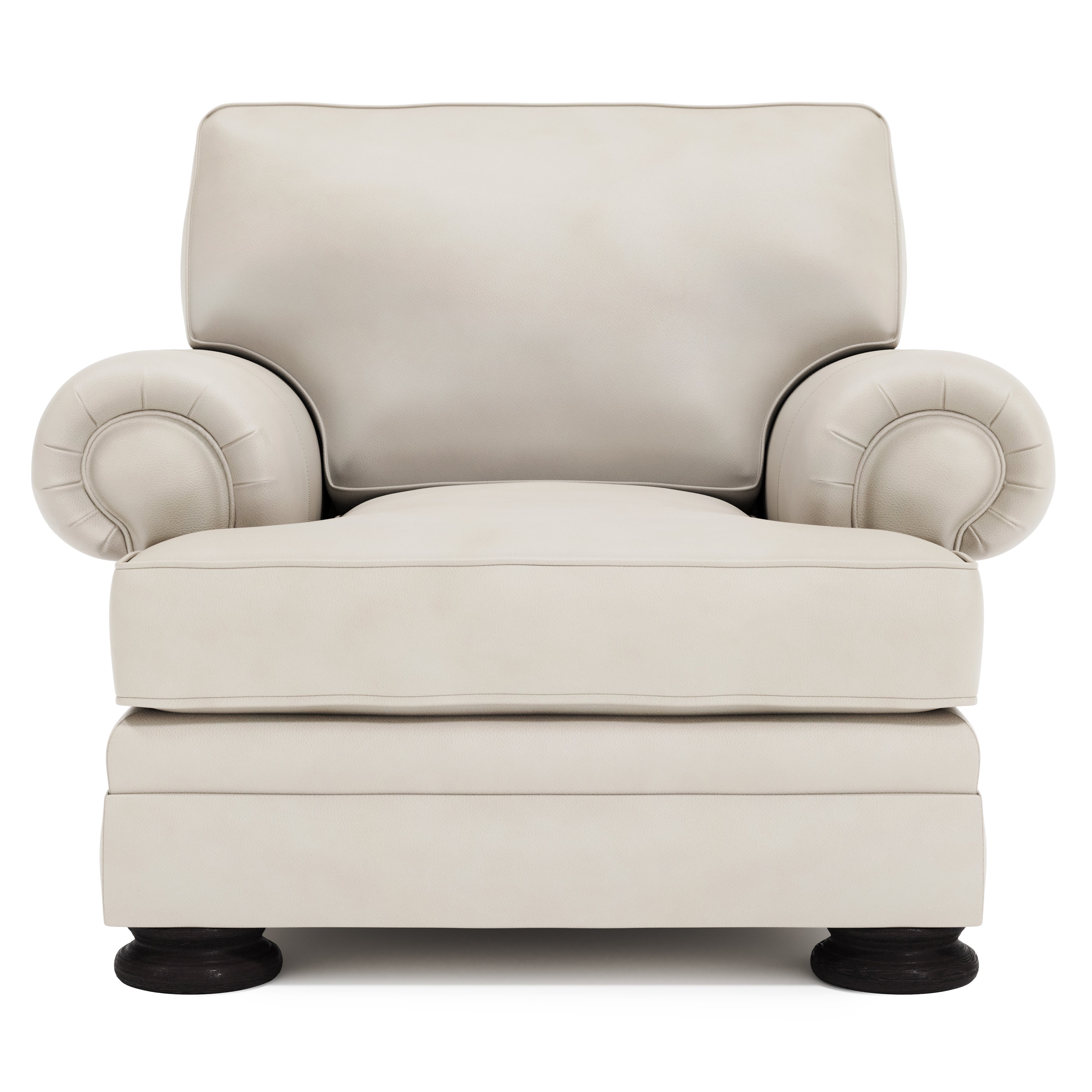 Enjoy the rich look of our Foster furniture line in a convenient chair size. This collection projects a feeling of grandeur in a comfort that will have you feeling right at home. The padded frame and thick seat and back cushions provide relaxed seating. Wide legs add a luxurious final touch. Pair this chair with a Foster Ottoman to extend the comfort further.