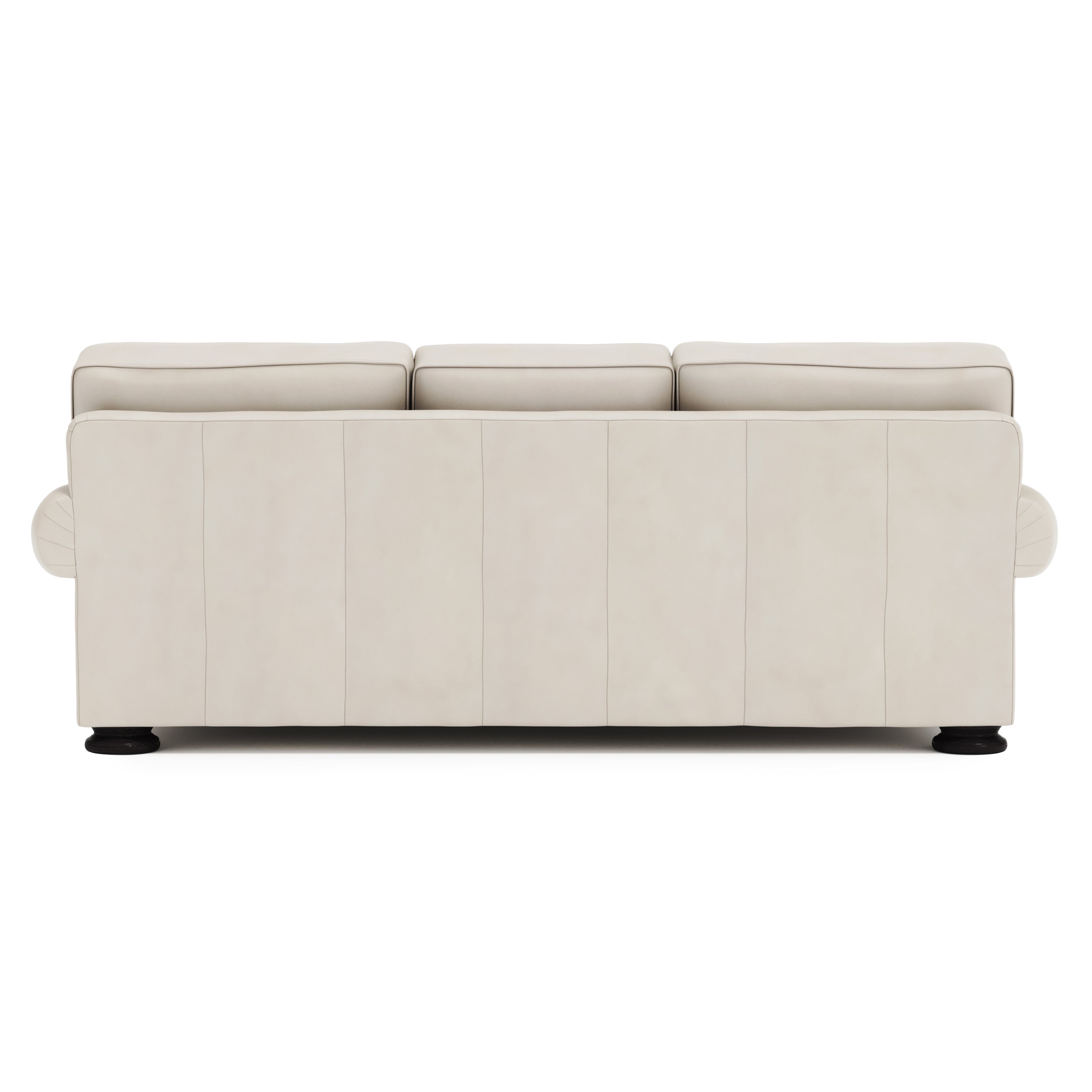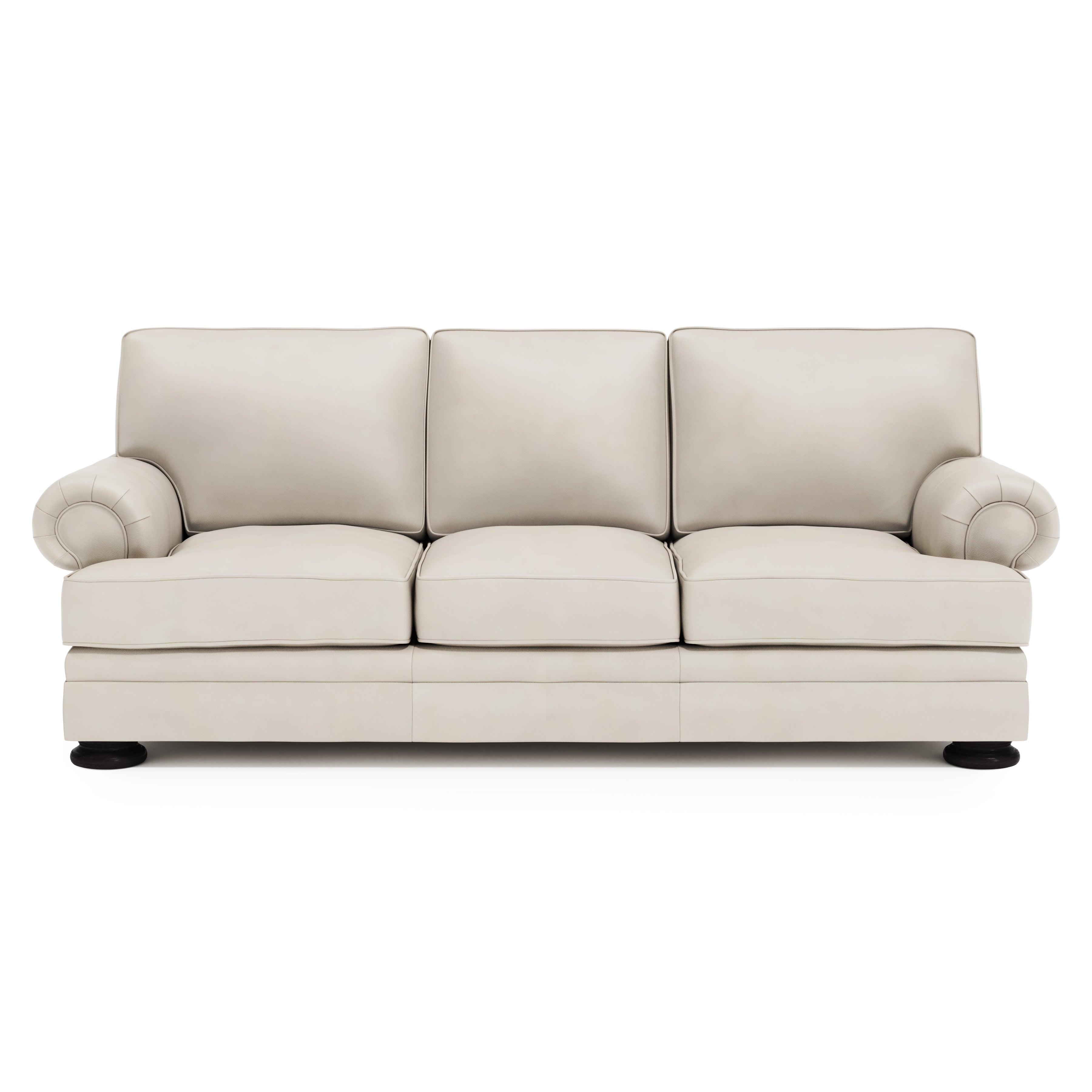 The stately Foster leather sofa offers comfortable support with an air of traditional grandeur. The plush cushions invite relaxation, while rolled arms, welt trim, and wide bun feet exude refinement.