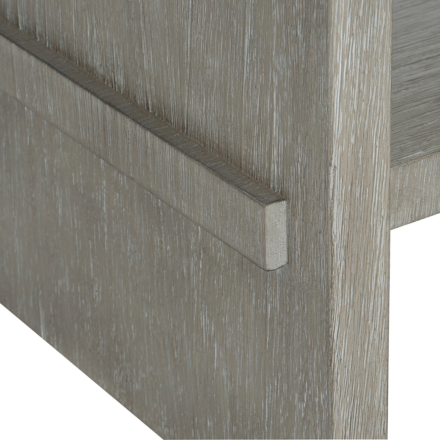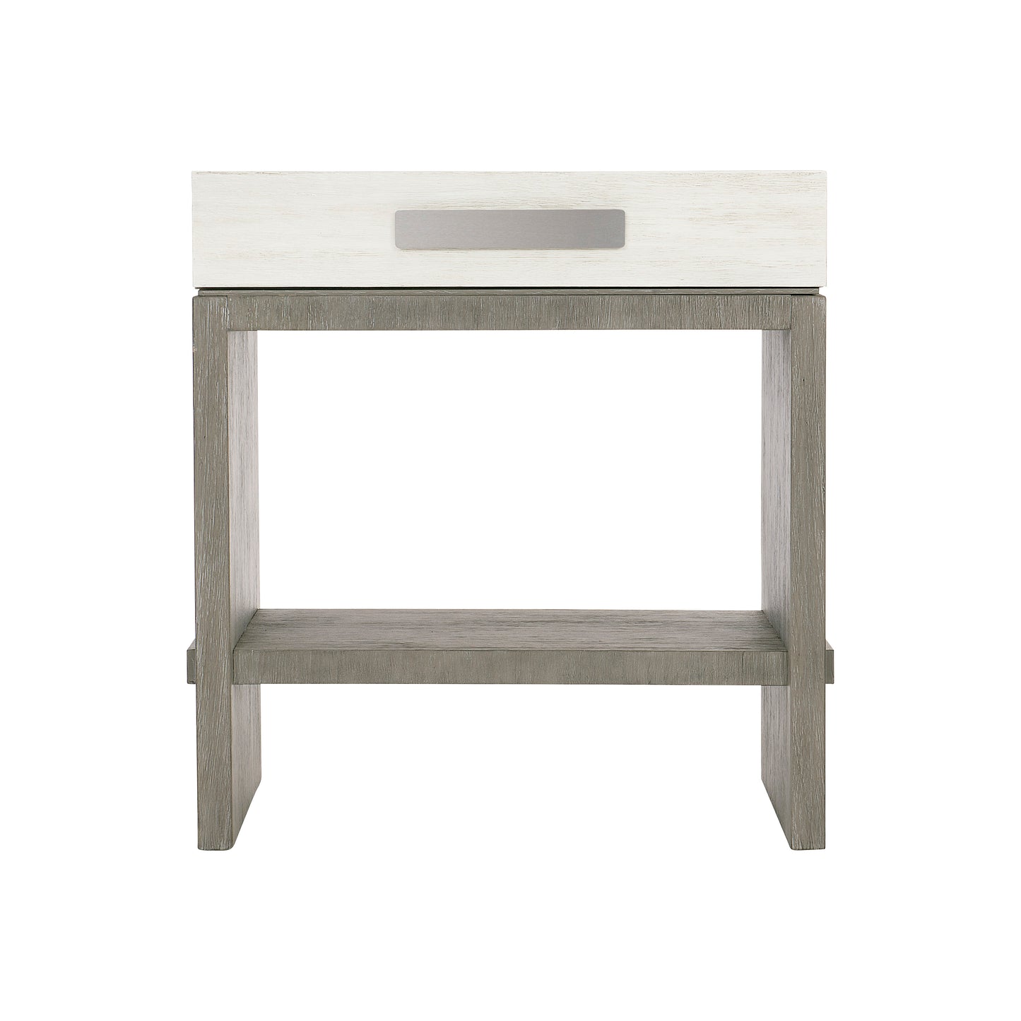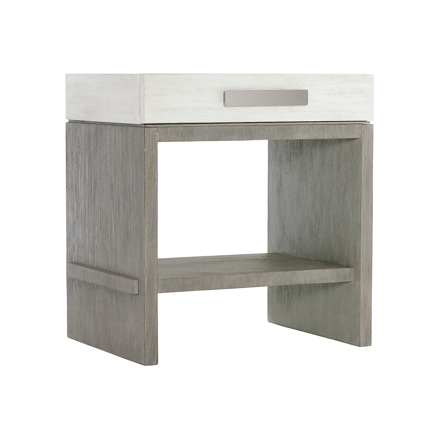 Foundations is a new, refined expression of modern rustic, defined by a minimalist style and relaxed finishes. Crafted from cerused, wire-brushed acacia in two-tone finish, the Foundations nightstand offers rustic style with a contemporary touch. Clean lines and intersecting planes create a sophisticated design aesthetic, softened by a palette of gray and white. A brushed stainless steel pull on its single drawer adds a subtle accent to the simple form.