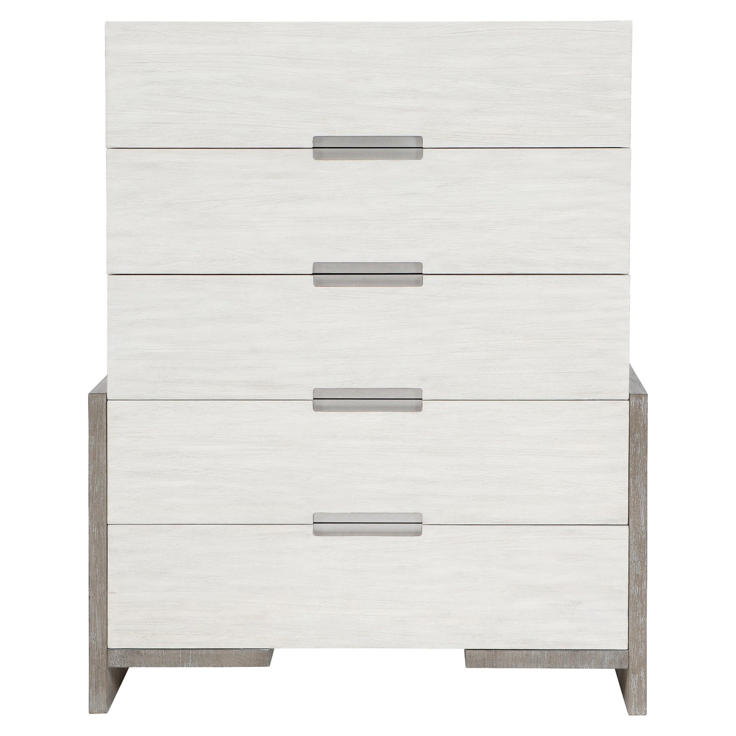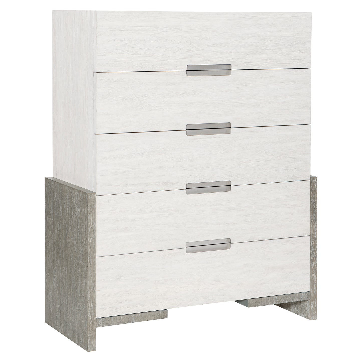 Foundations is a new, refined expression of modern rustic, defined by a minimalist style and relaxed comfort. The Foundations tall drawer chest features a two-tone theme and substantial, thick-cut planes. Five drawers, finished in a muted oyster, contrast with its darker wood frame. This handsome piece offers an instant upgrade to any bedroom.