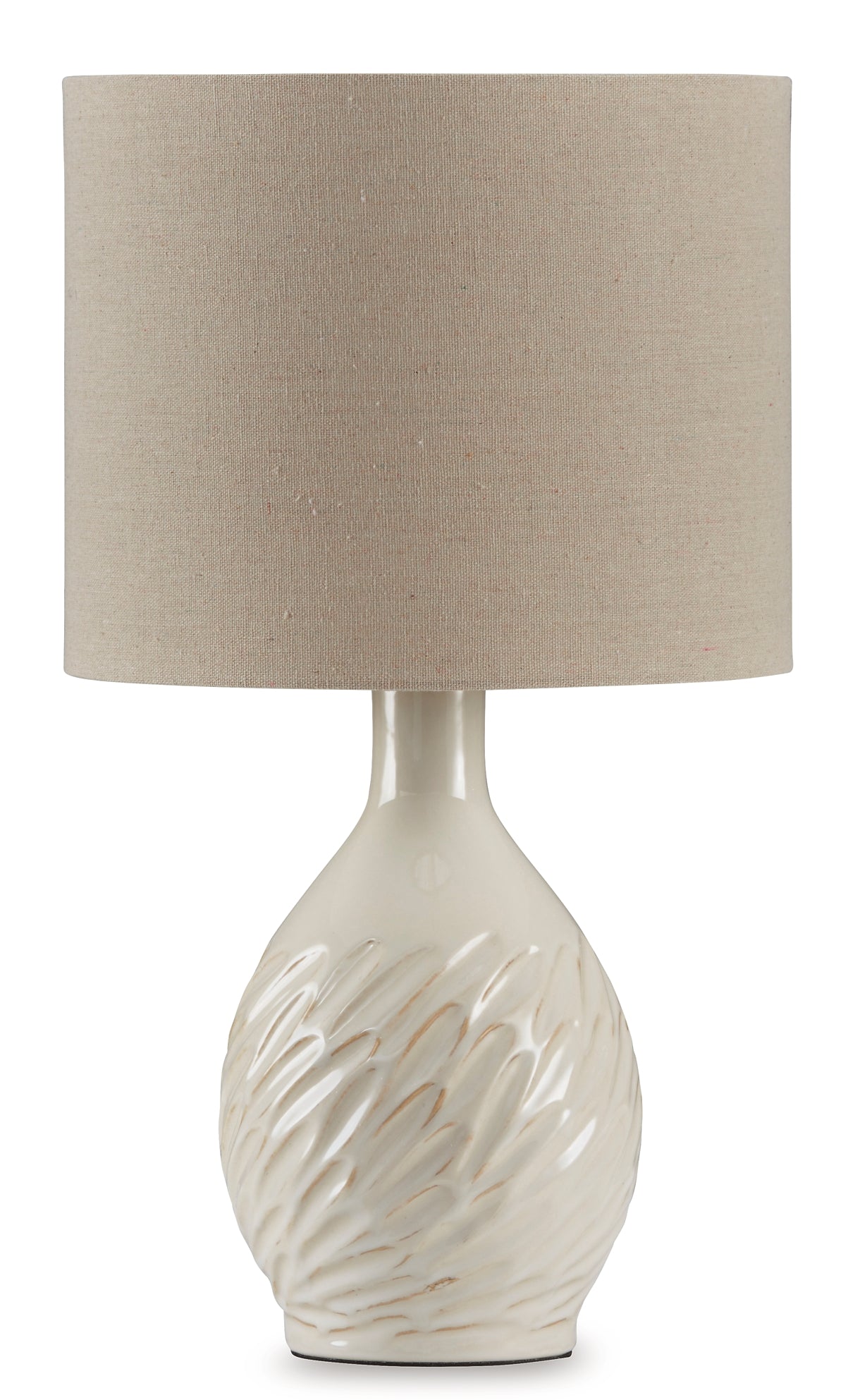 Exuding a relaxed vibe, this ceramic table lamp is a bright idea. The textured base and distressed cream glaze add character and casual elegance to your home. Whether you're working or unwinding, this lamp's tranquil lighting will create the perfect atmosphere.