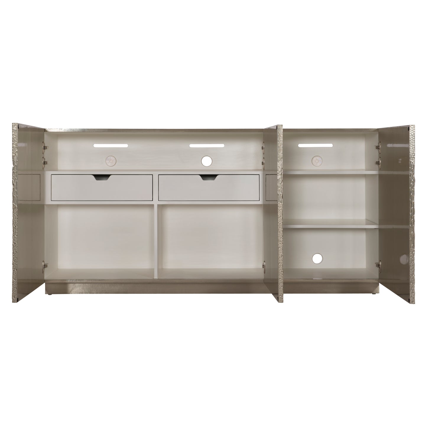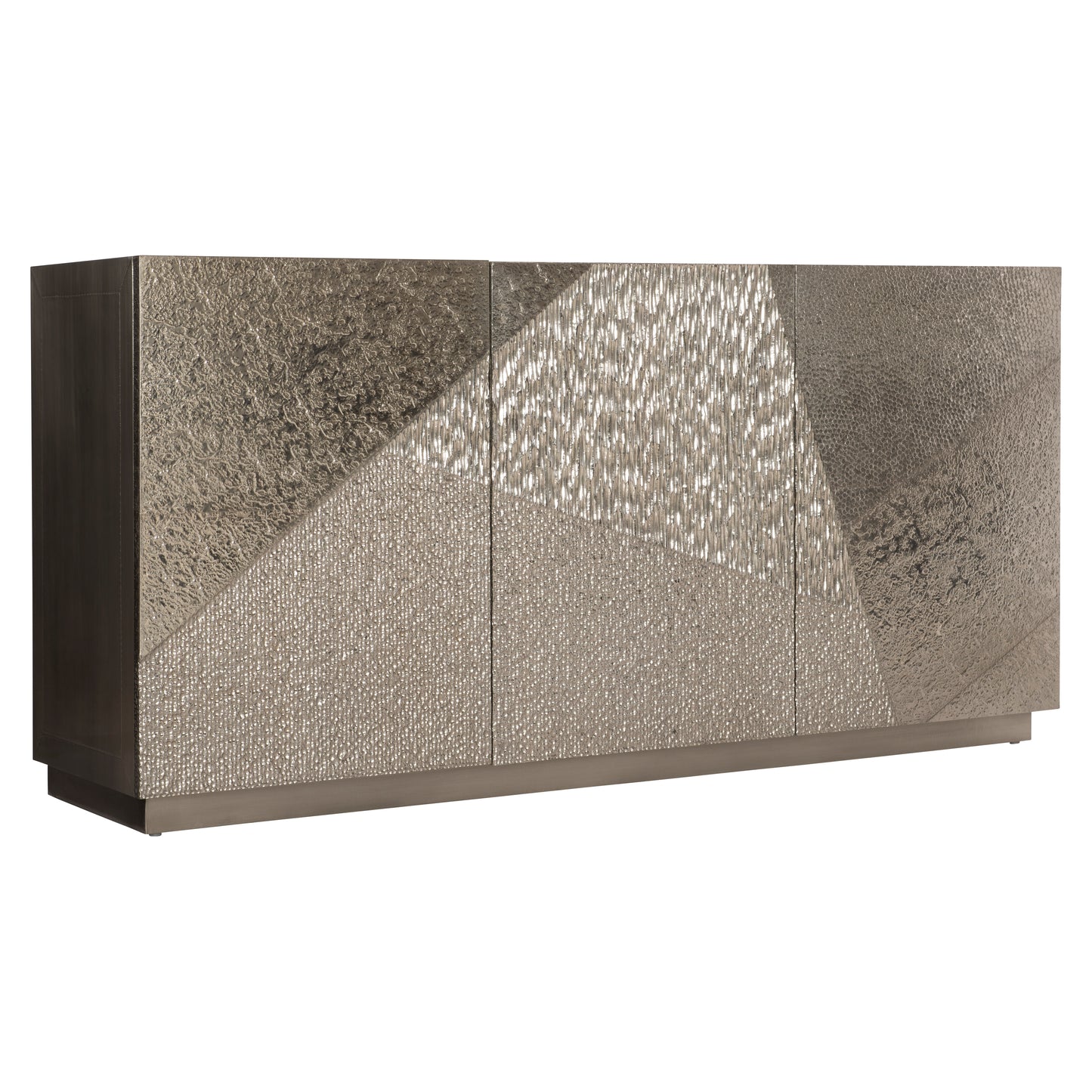 The Gatlin buffet offers style, storage, and textural sophistication in one design. Featuring four distinct patterns, the three doors are clad in gleaming German silver. Open them to reveal an interior that includes two soft-close drawers, compartments, and shelves, one of which is adjustable, to accommodate a wide variety of storage needs.