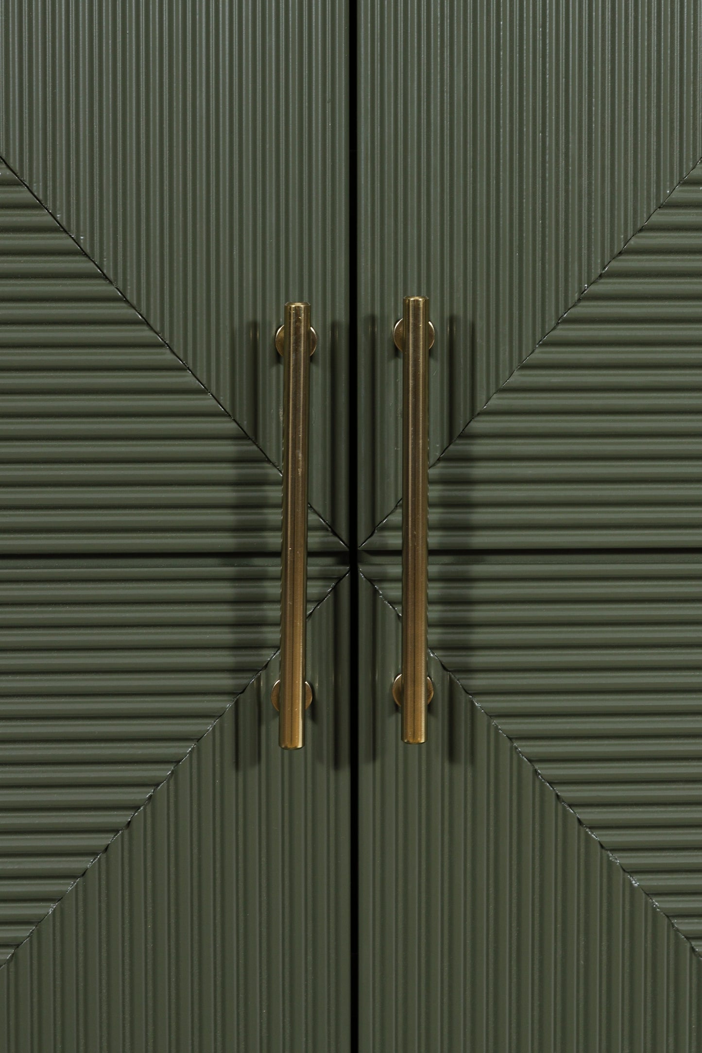 This accent cabinet makes a big impact with just one piece. Its intricately patterned doors impress with their dimension, while the dark green finish and sleek goldtone handles add a touch of modern elegance. Adjustable shelves add everyday functionality to this sophisticated yet approachable piece.