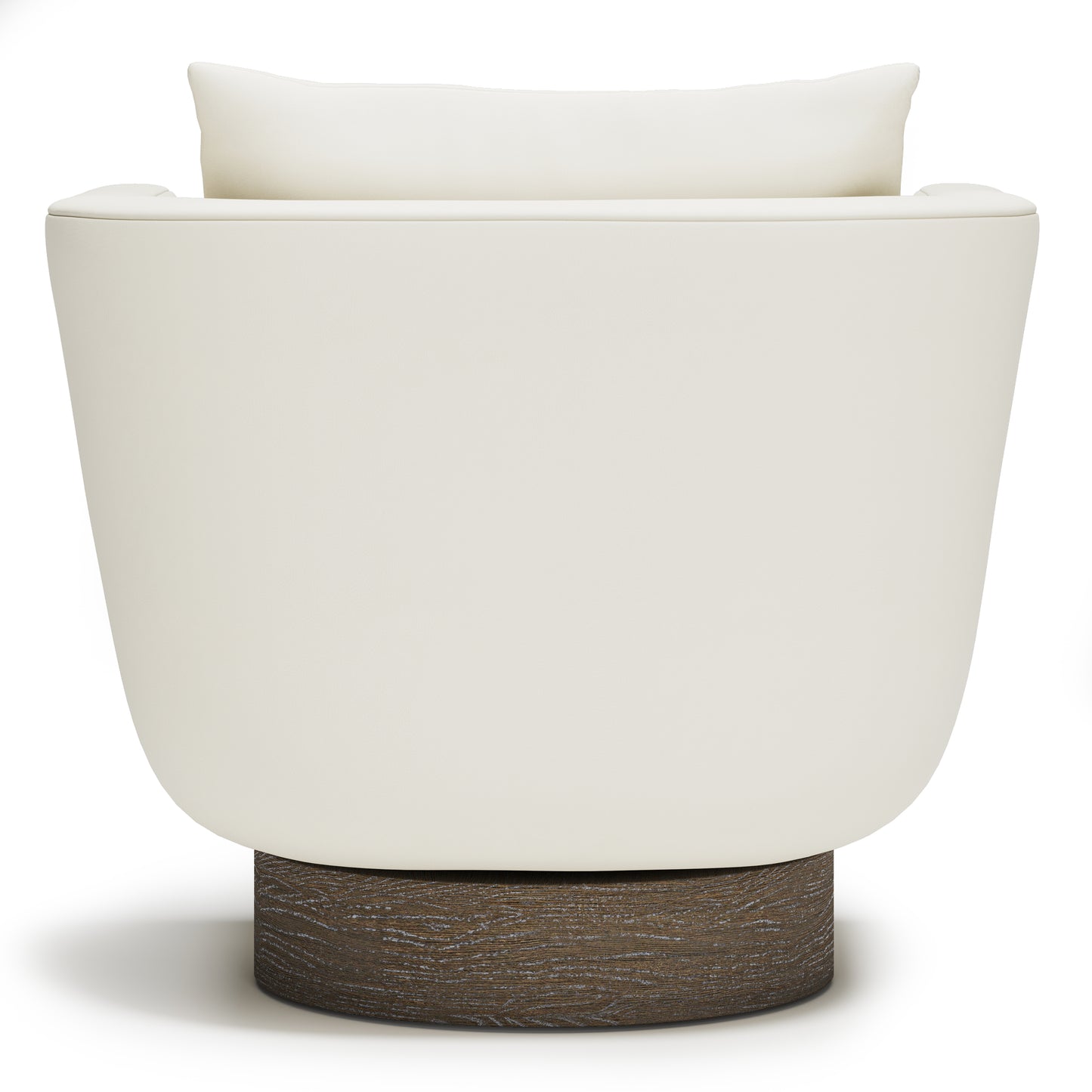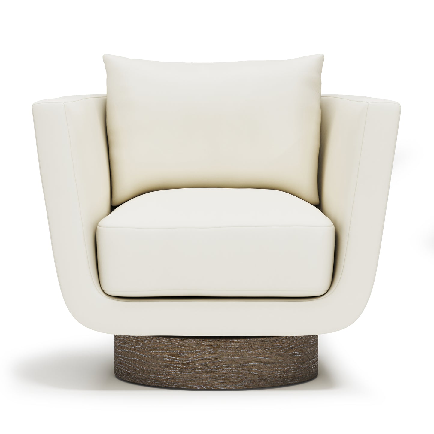 The Gemma swivel chair makes a statement with its unique u-shaped frame that lifts and curves from the seat. The swivel base allows for a 360-degree view of any room. And the luxe feather down cushion and fiber back pillow create a compellingly comfortable seat.