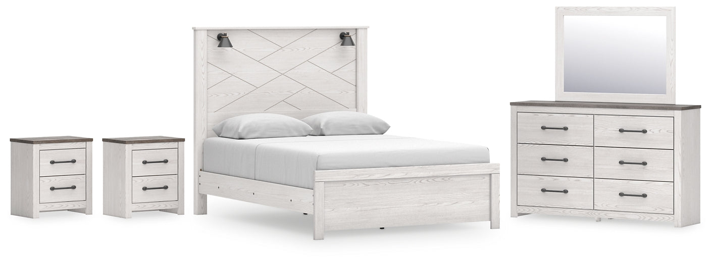 Cool, clean and casually modern. This bedroom package’s wispy whitewash and gray finish sets the tone for your calming sanctuary. Large linear drawer pulls add dimension and authenticity, while the abstract headboard design brings a fresh look to the set.