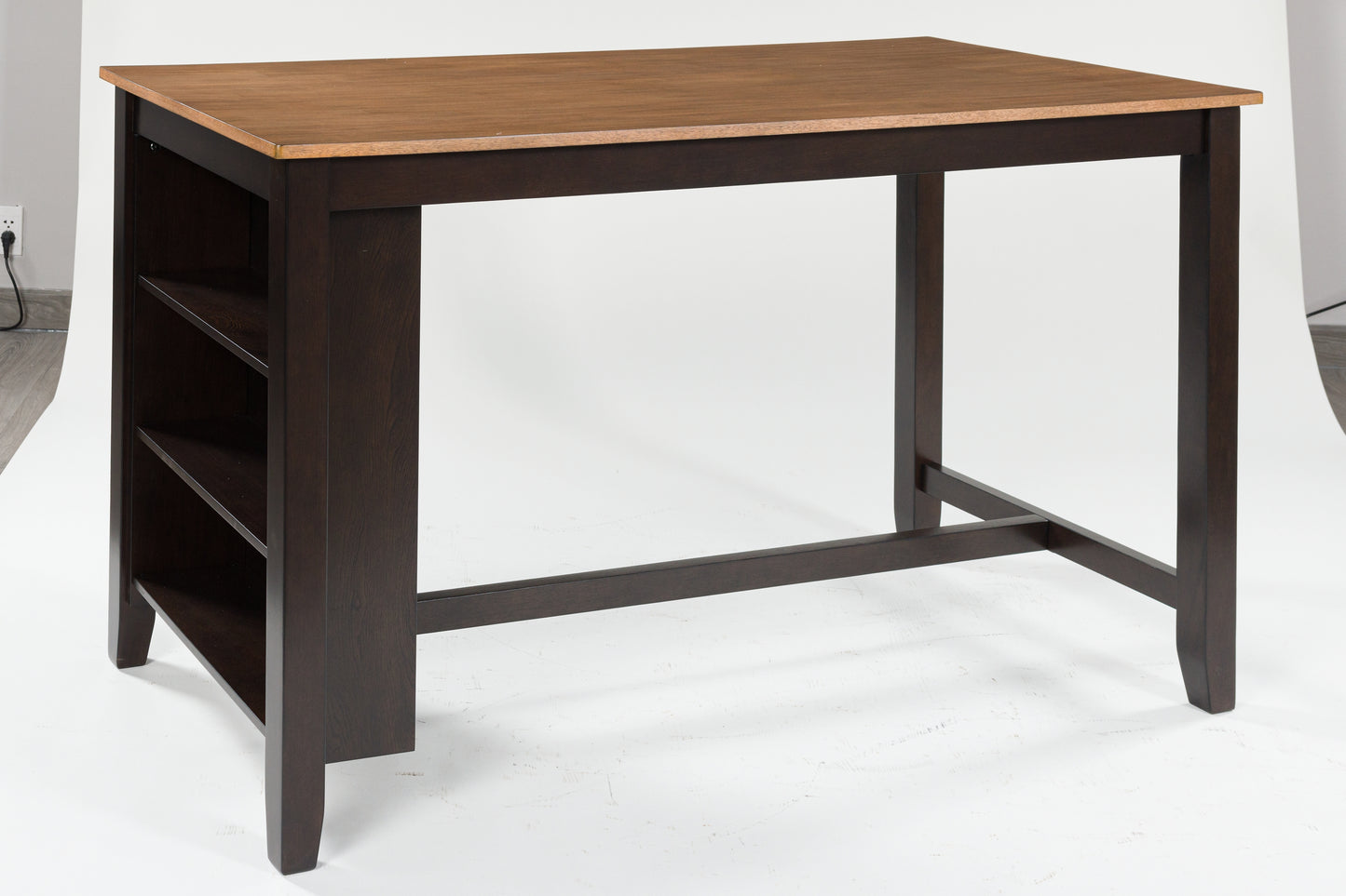 Complement your home’s simply relaxed sensibility with this counter height dining table. A handsome dark brown hue offers a chic contrast to the natural wood tone, for a neutral look that vibes with a variety of aesthetics. Built-in storage shelves keep kitchen and work accessories easily accessible. Whether you're sipping your morning coffee, settling in for dinner or working from home, this table is smartly designed for everyday comfort and style.