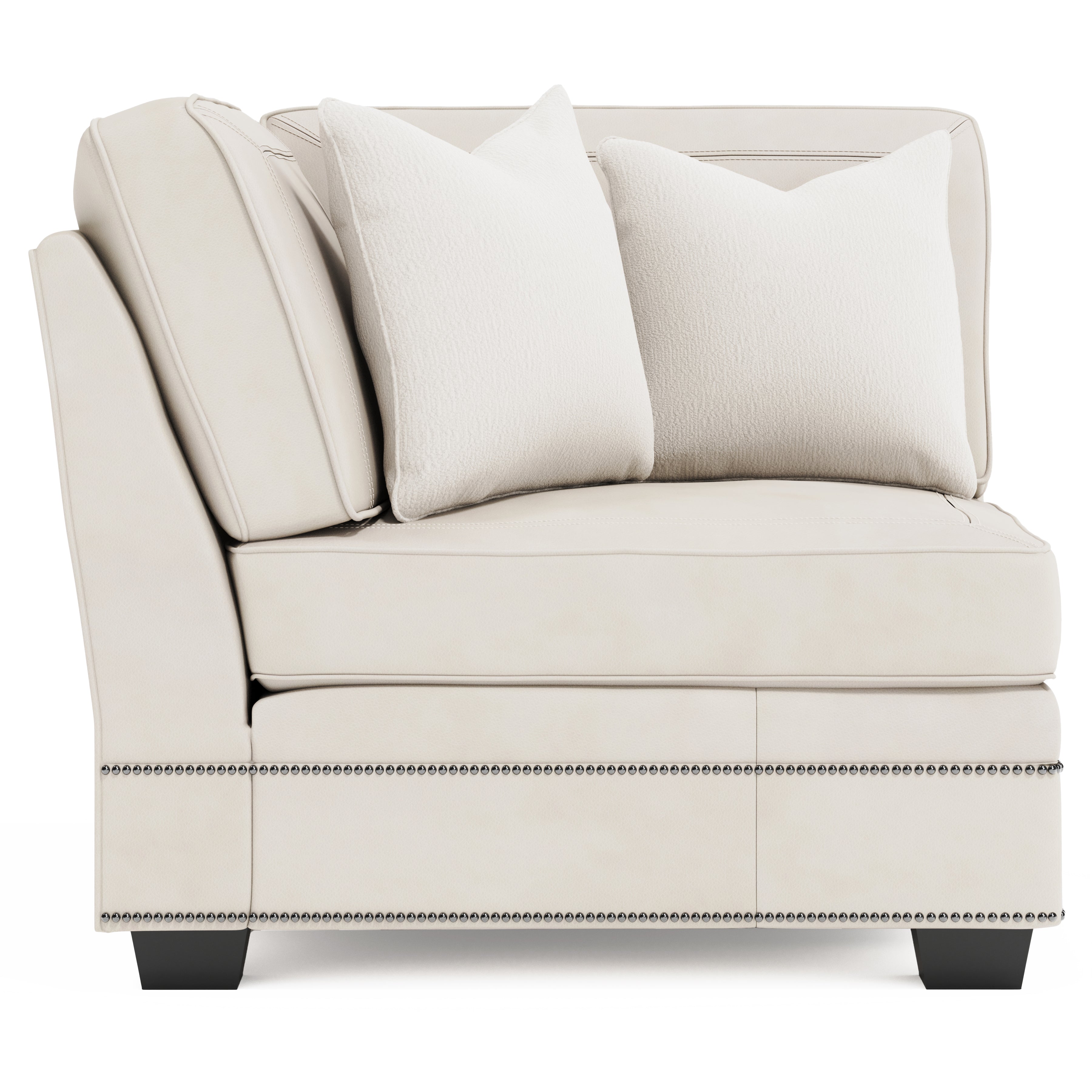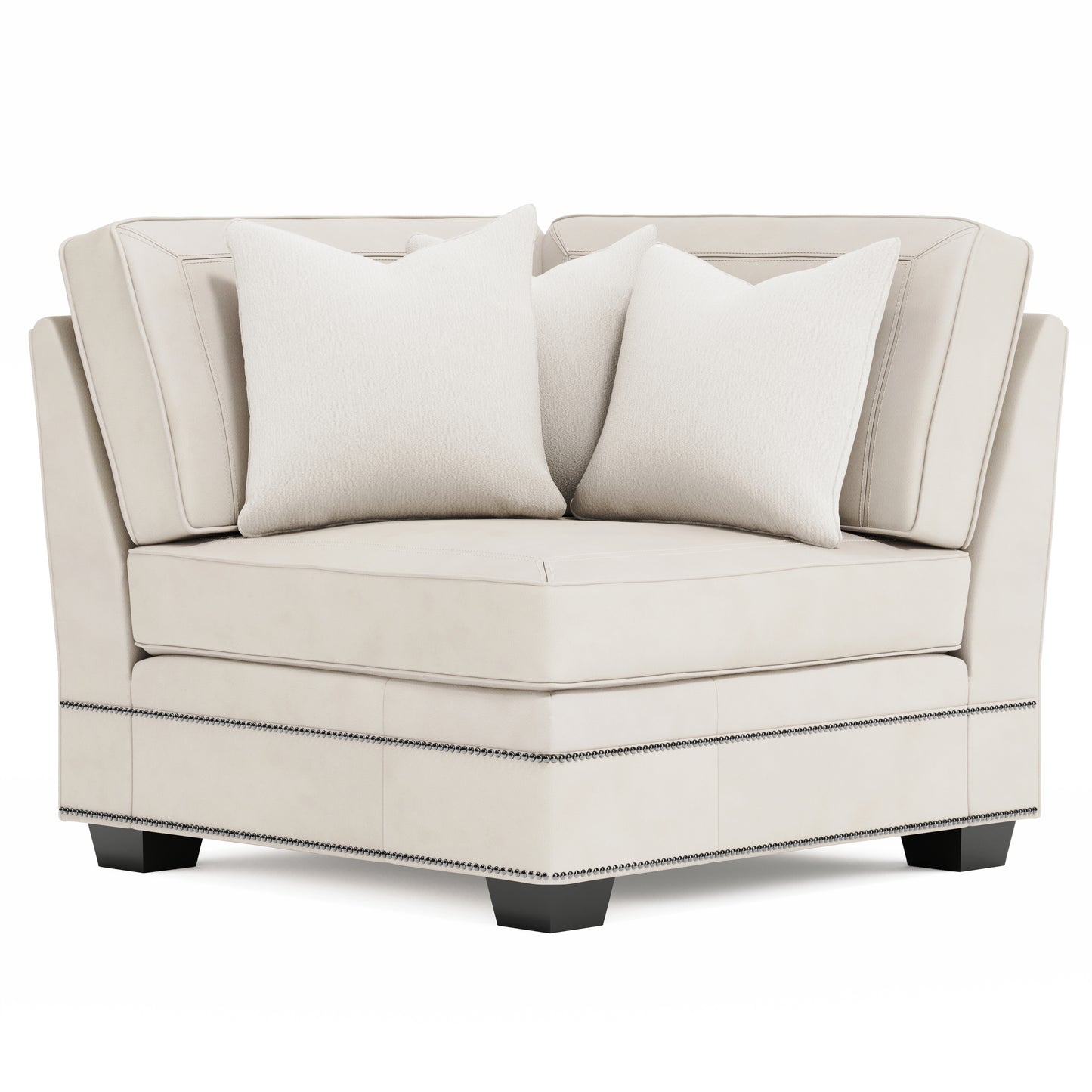 Elegant and sophisticated, the leather Grandview corner chair features a clean, modern frame and an ultra-comfortable spring down cushion. Nailhead trim brings an air of refinement, while tapered block feet add a contemporary touch. Blendown throw pillows provide a luxurious accent.