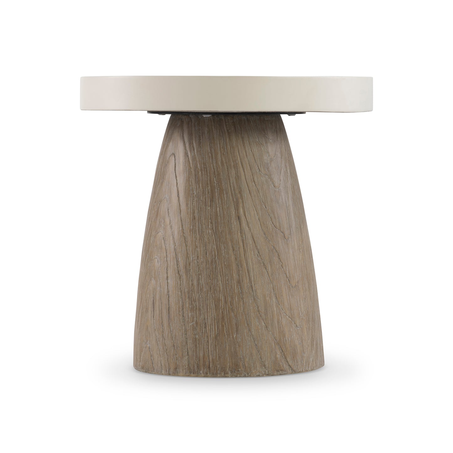 A traditional drum-shaped table is modernized in the Granville outdoor side table, crafted from glass-reinforced concrete. The wood texture on the base is finished in Sea Oat. It supports a smooth round top that is finished in Bone.