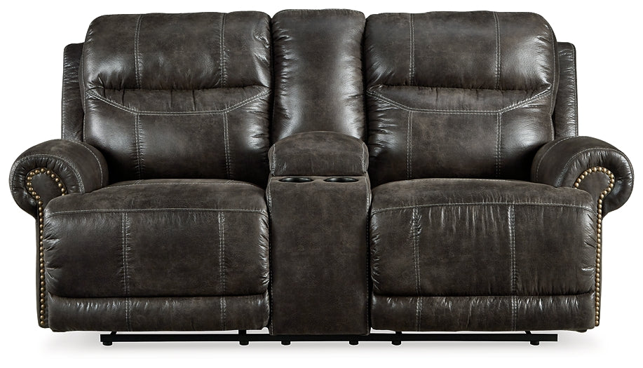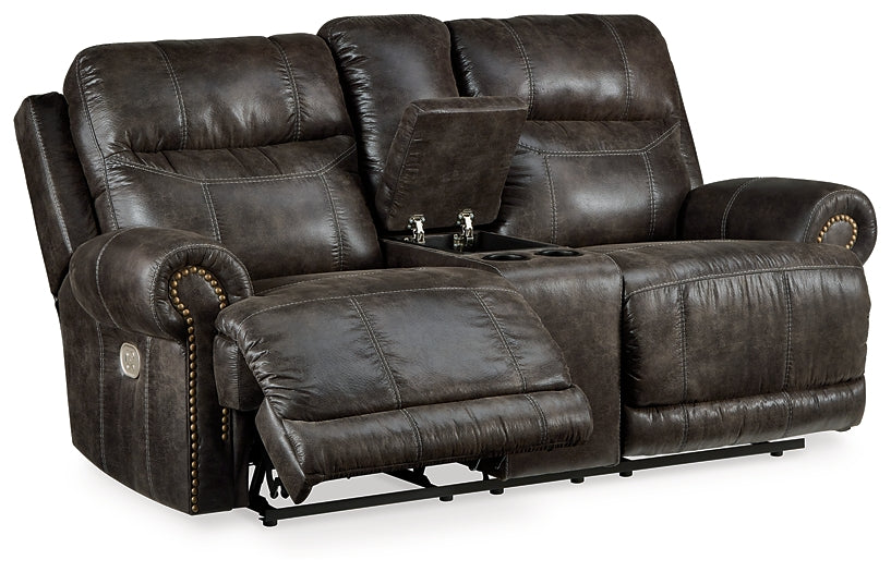 In charcoal gray, this 2-seat power reclining sofa with adjustable headrest offers the warm feel of fabric and the cool, rustic look of leather. Caressing you in comfort, the faux leather dual-sided recliner features luxurious bustle back cushions, plus jumbo window-pane stitching and nailhead trim for style. Easy View™ power adjustable headrests offer a primo view of the TV even when you're fully reclined, to enhance your relaxation. Chill out while you recharge thanks to a USB port built right into the one-touch power control. Matching power loveseat included.