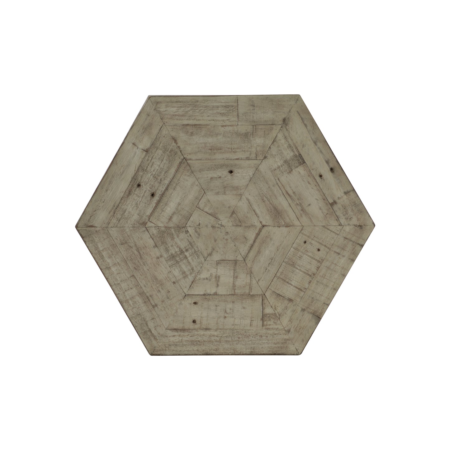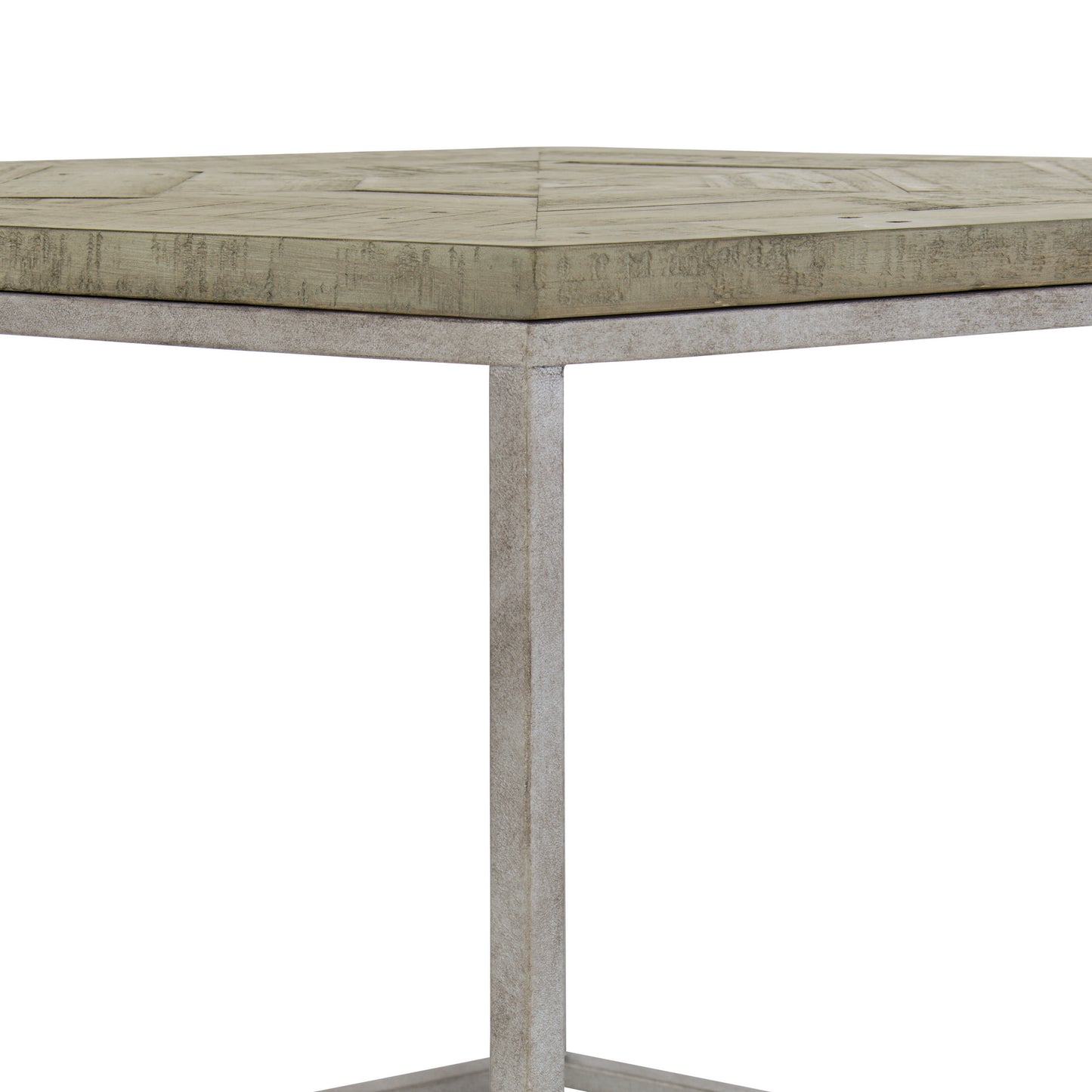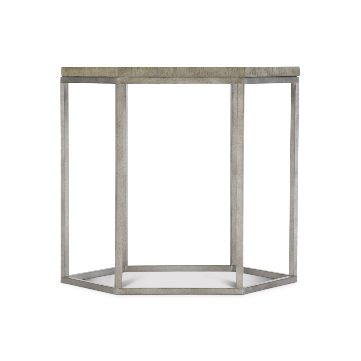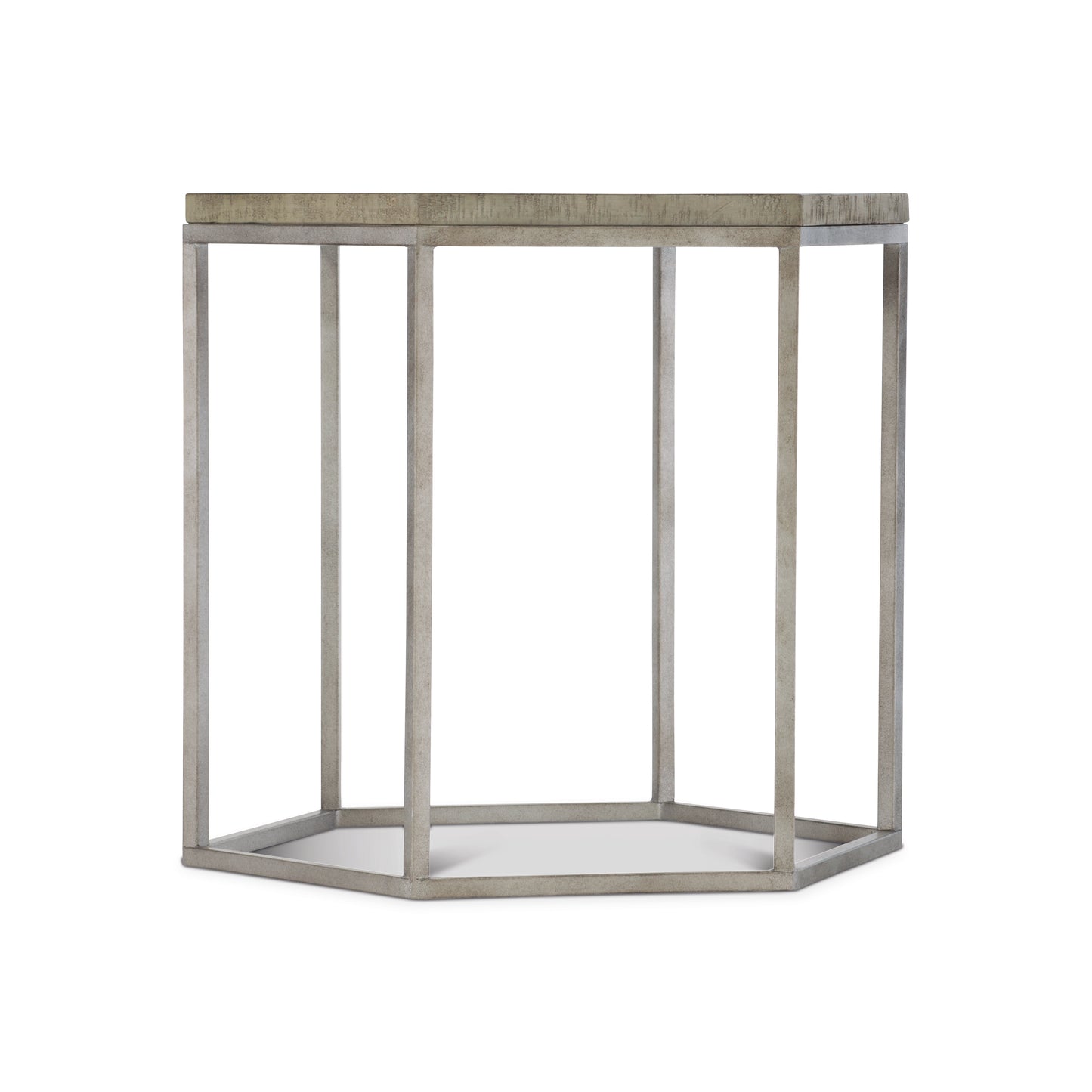 The Highland Park collection blends the best features of farmhouse and mid-century design. Abundantly appealing, the Gresham end table embodies the uniqueness of this eclectic collection. Its sleek, modern design features clean lines forming a hexagonal shape. A steel frame in a glazed silver finish meets distressed pine, finished in a neutral Morel that highlights the grain and imperfections in the wood. The planked fancy face top adds a rustic tone to this exquisite piece.