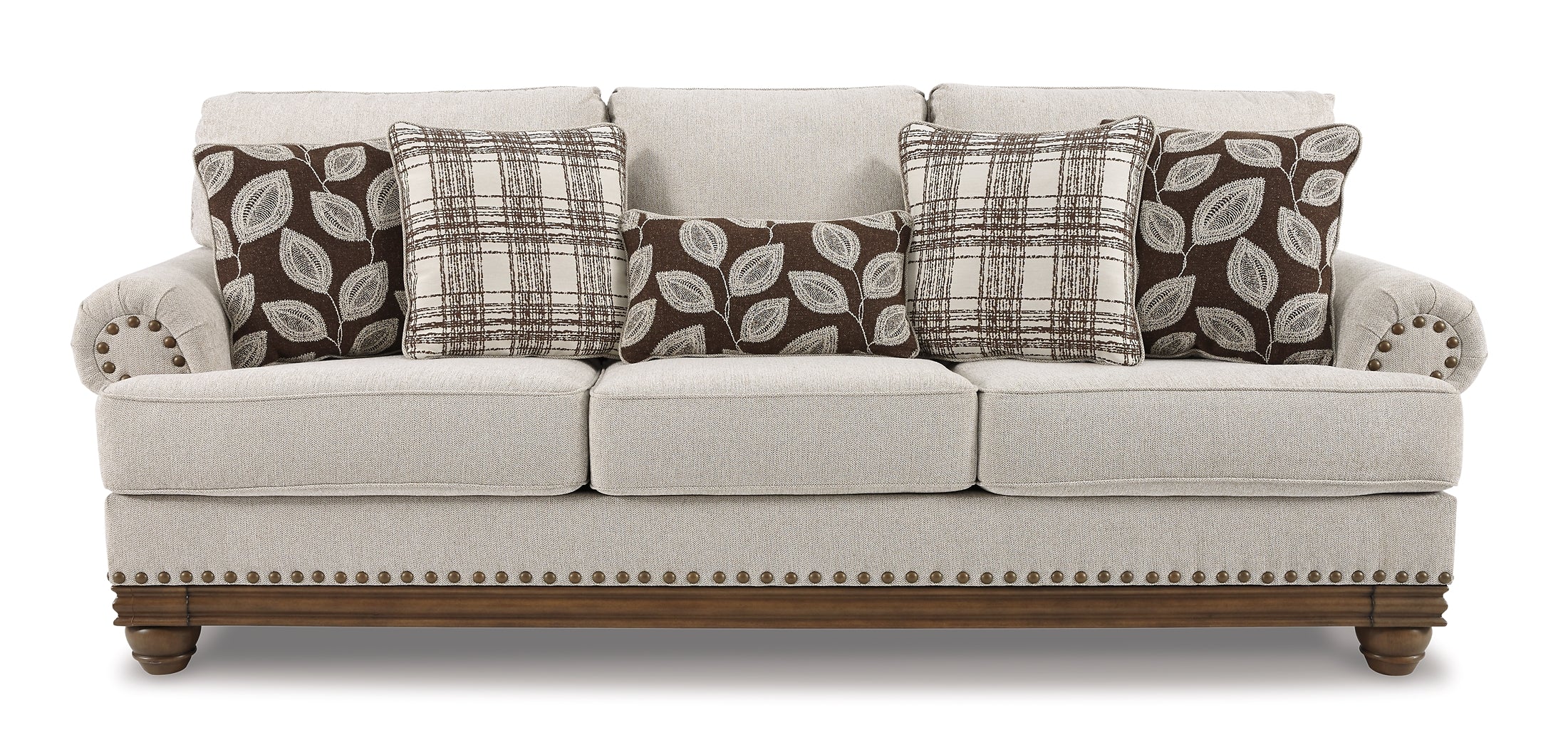 True classic character comes to life in this sofa. Set back pleated rolled arms and warm brown exposed frame with bun feet are beautifully traditional. Lovely detailing carries itself through the herringbone weave in the soft upholstery. Seat cushions reverse to maintain durable comfort. Vintage-inspired jumbo nailhead trim graces the design. Plaid and botanical pillows in dark brown are a timeless touch.
