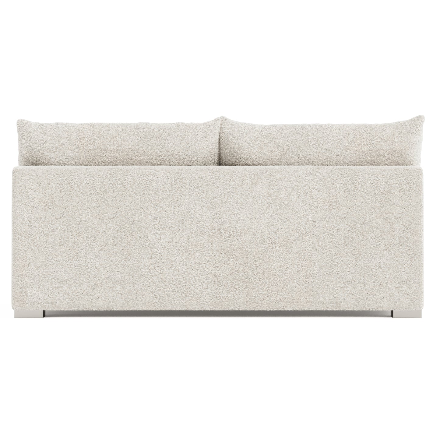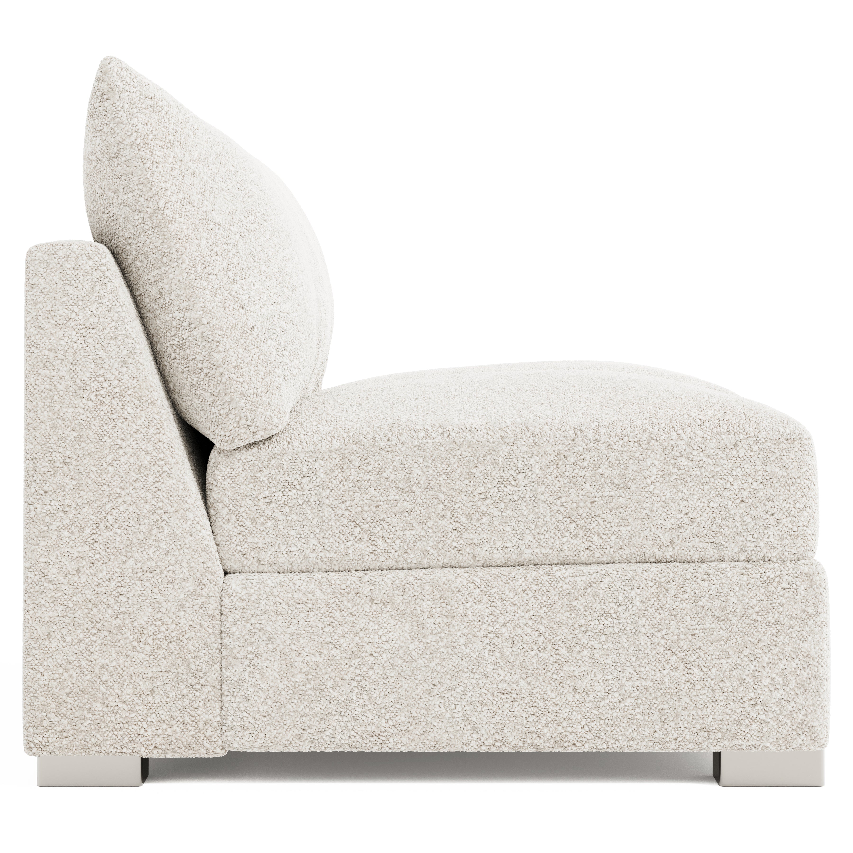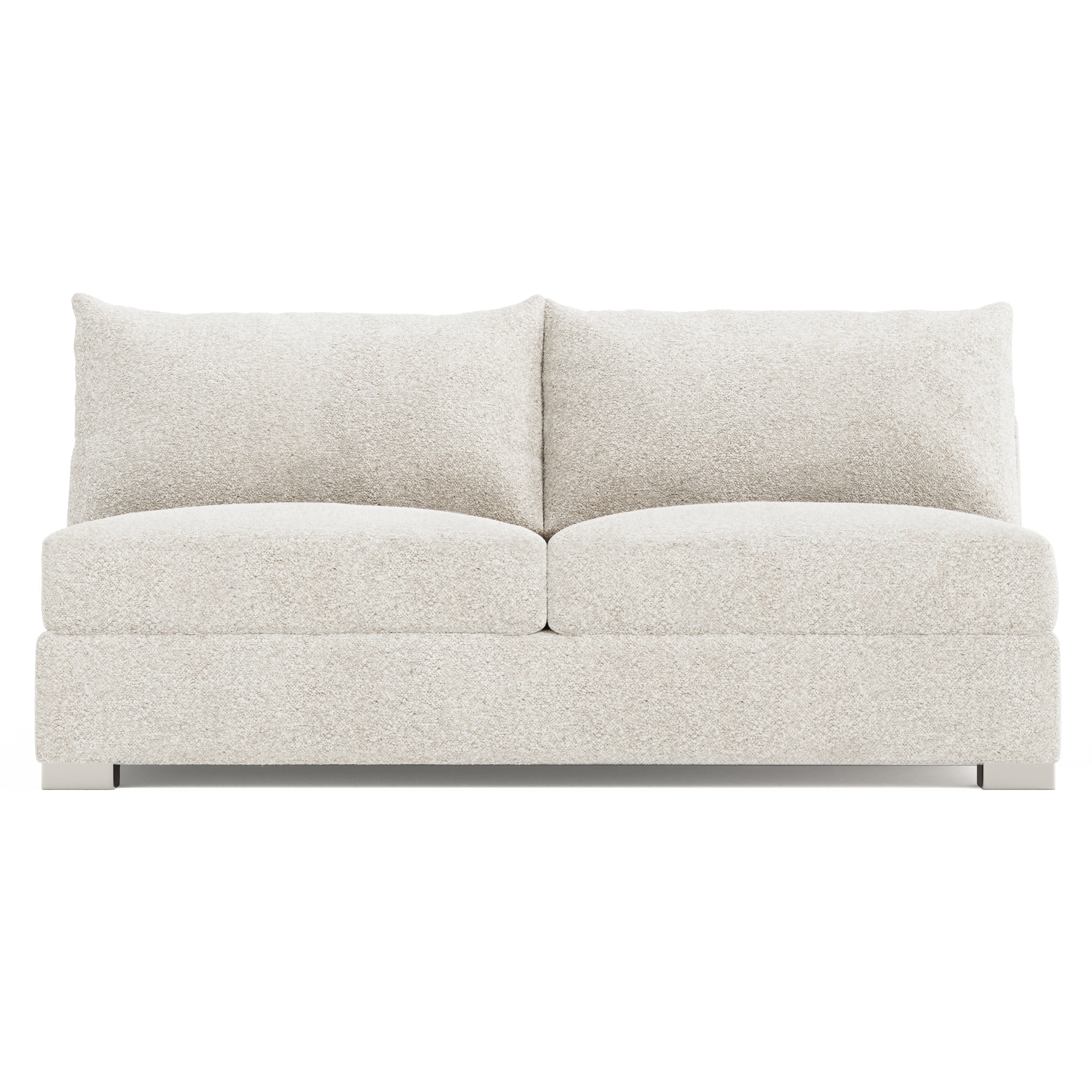 Traditional in shape and style the Helena armless loveseat shows off its modern side with substantial, chunky legs. It is wrapped in beautiful neutral fabric and filled with Luxe Feather Down to offer a welcoming spot for repose. Elegant and exquisitely crafted, this piece will elevate the style of any interior.