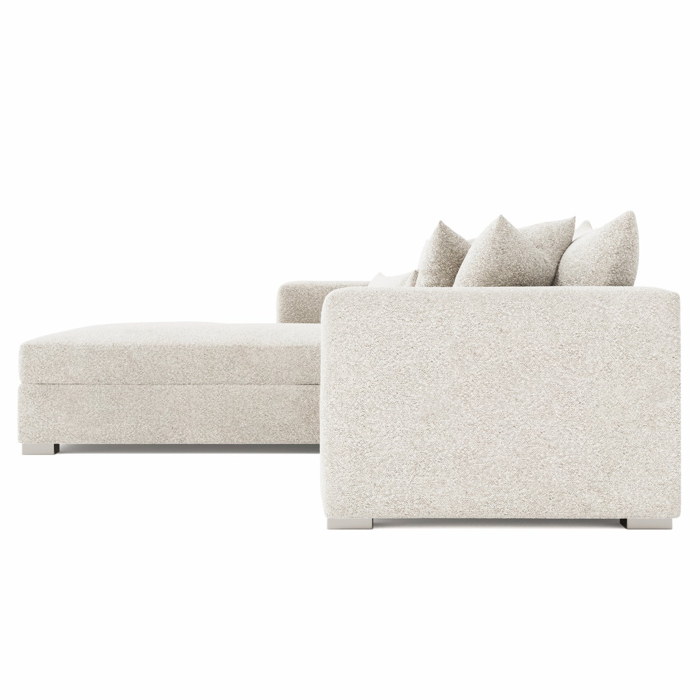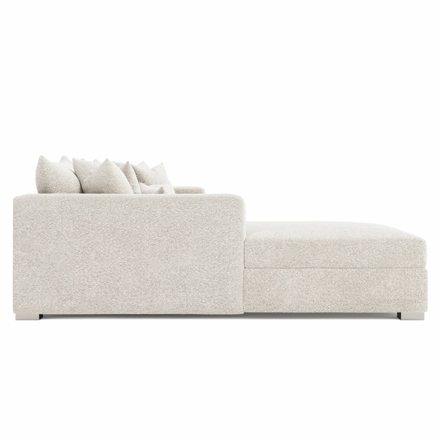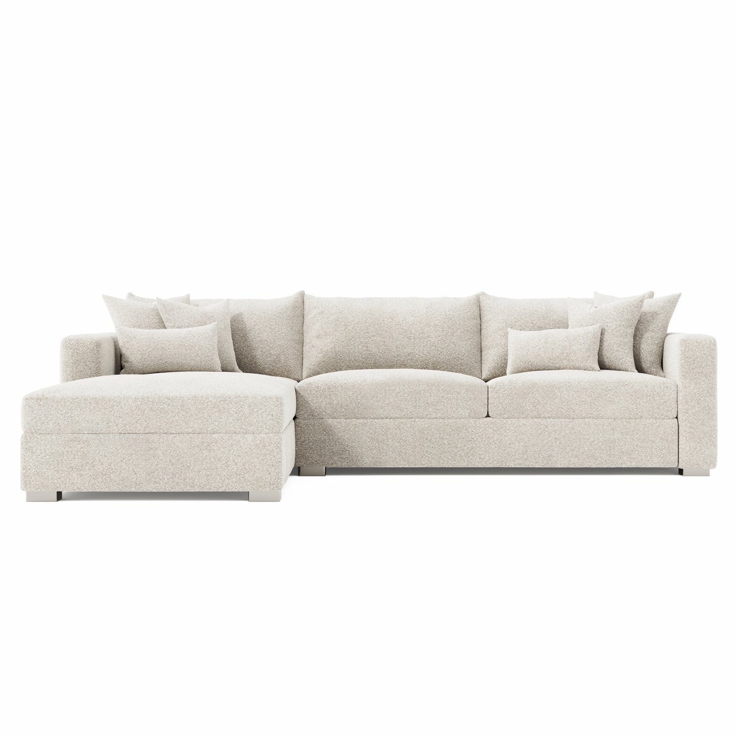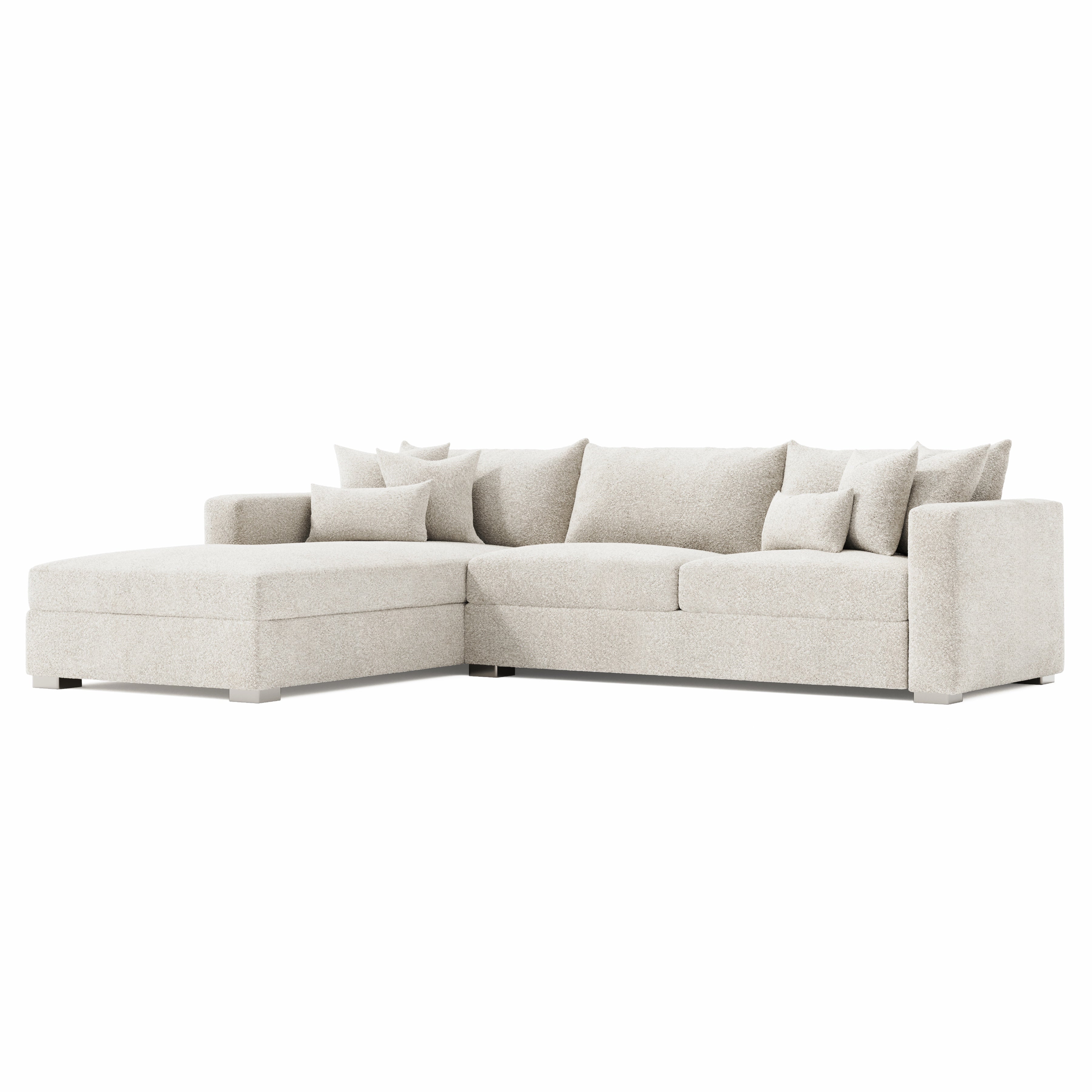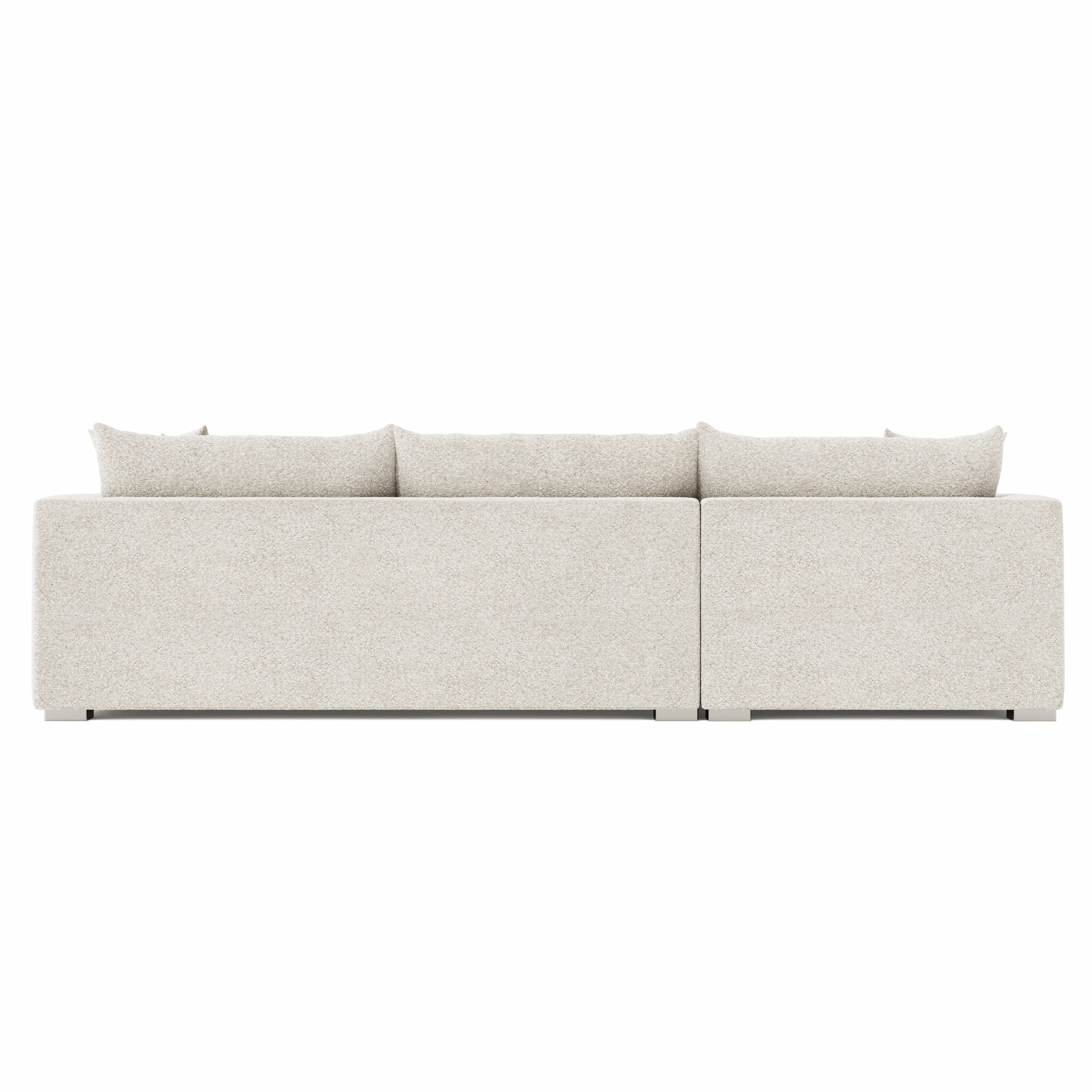 The Helena sectional's oversized track arms, low profile, and brushed stainless steel feet lend it a streamlined look rooted in contemporary design. Designed with sinuous spring construction for durability and comfort, the sectional offers luxe feather-down cushions for the ultimate in relaxation.