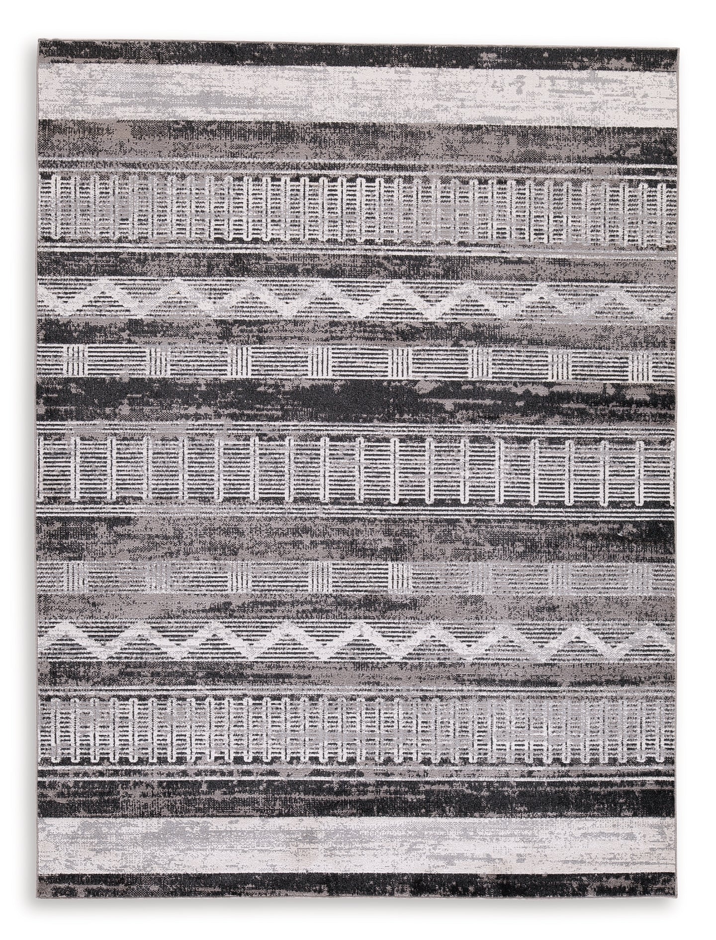 Drawing on tribal weaving motifs, this area rug features a repeating pattern with several unique markings. Its distressed design and neutral palette provide a distinctive look and feel for a variety of interiors, from contemporary to boho chic. Whether in a nursery, entryway or kitchen, this durable, machine washable rug suits any space where messes are made.